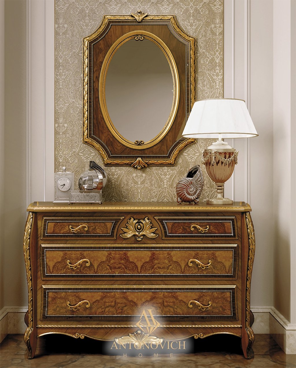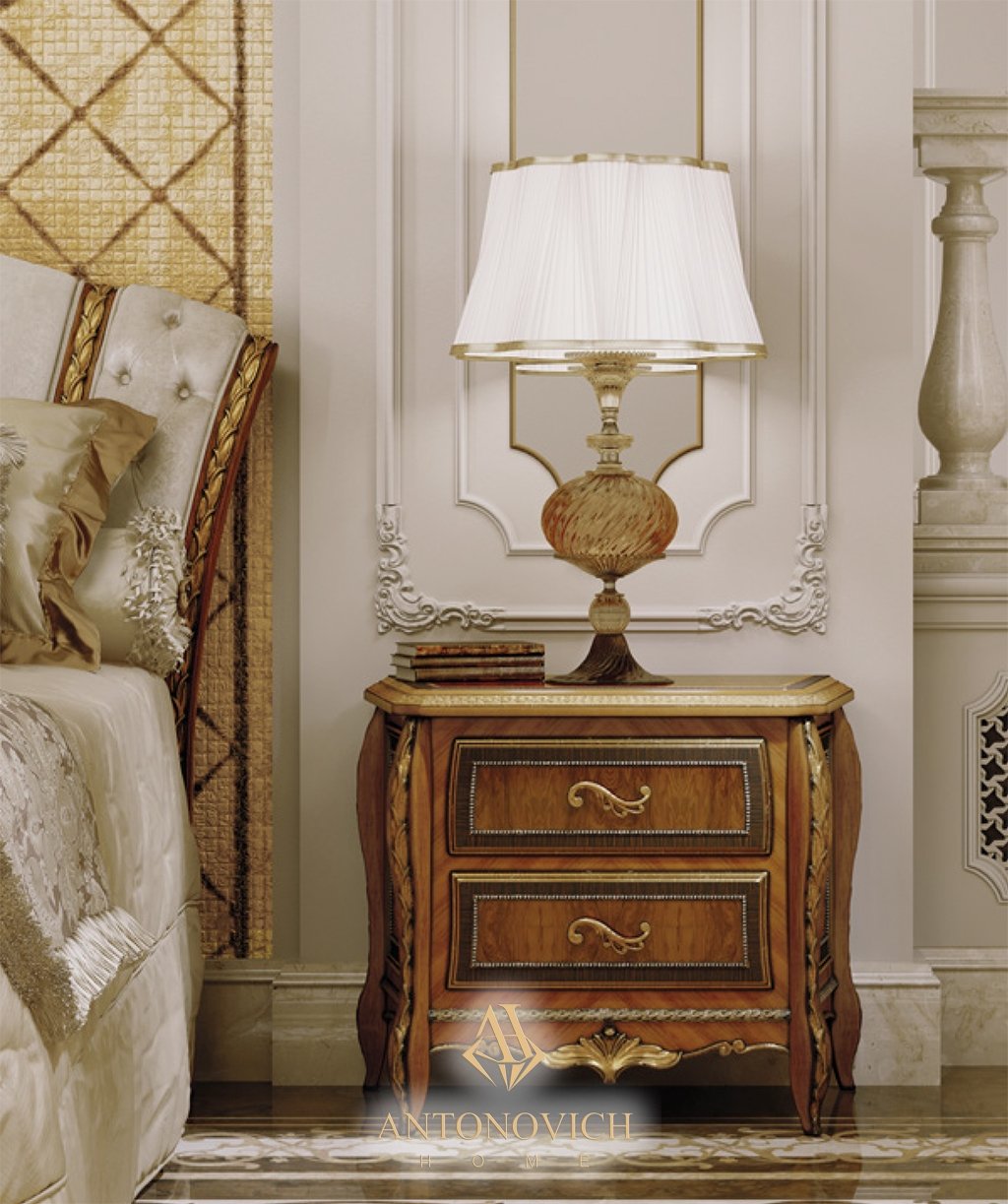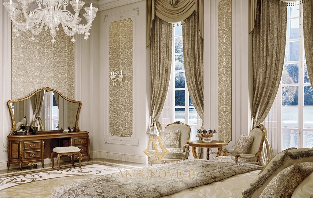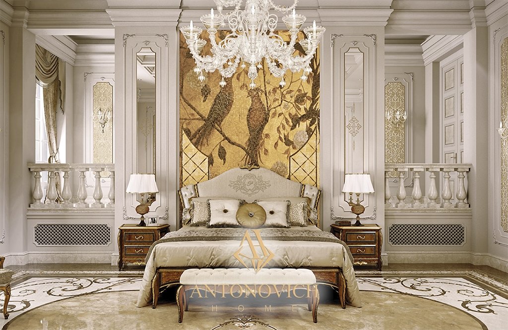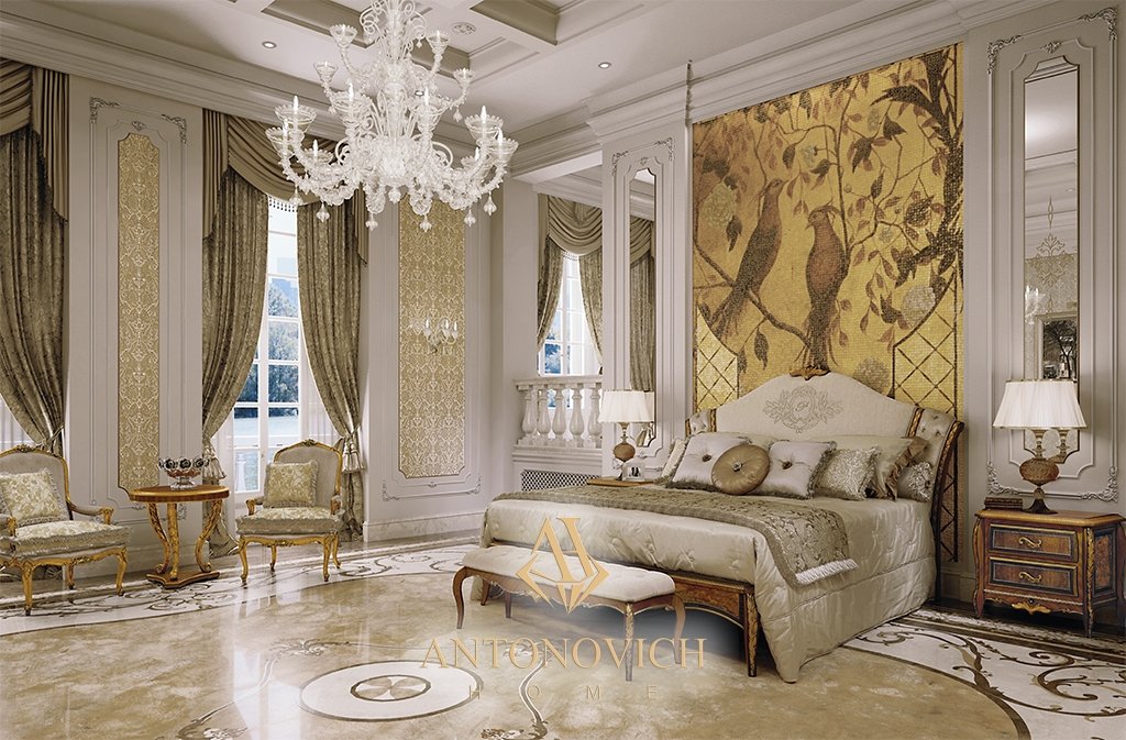 Спальня наполнена золотистыми тонами, украшающими мраморный пол, декоративные стеновые панели, а также натуральную отделку древесины с деталями из состаренной сусальной платины.