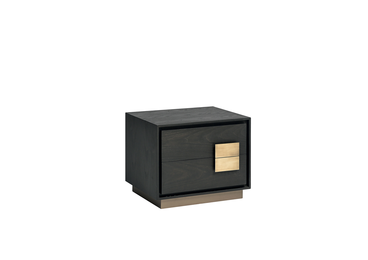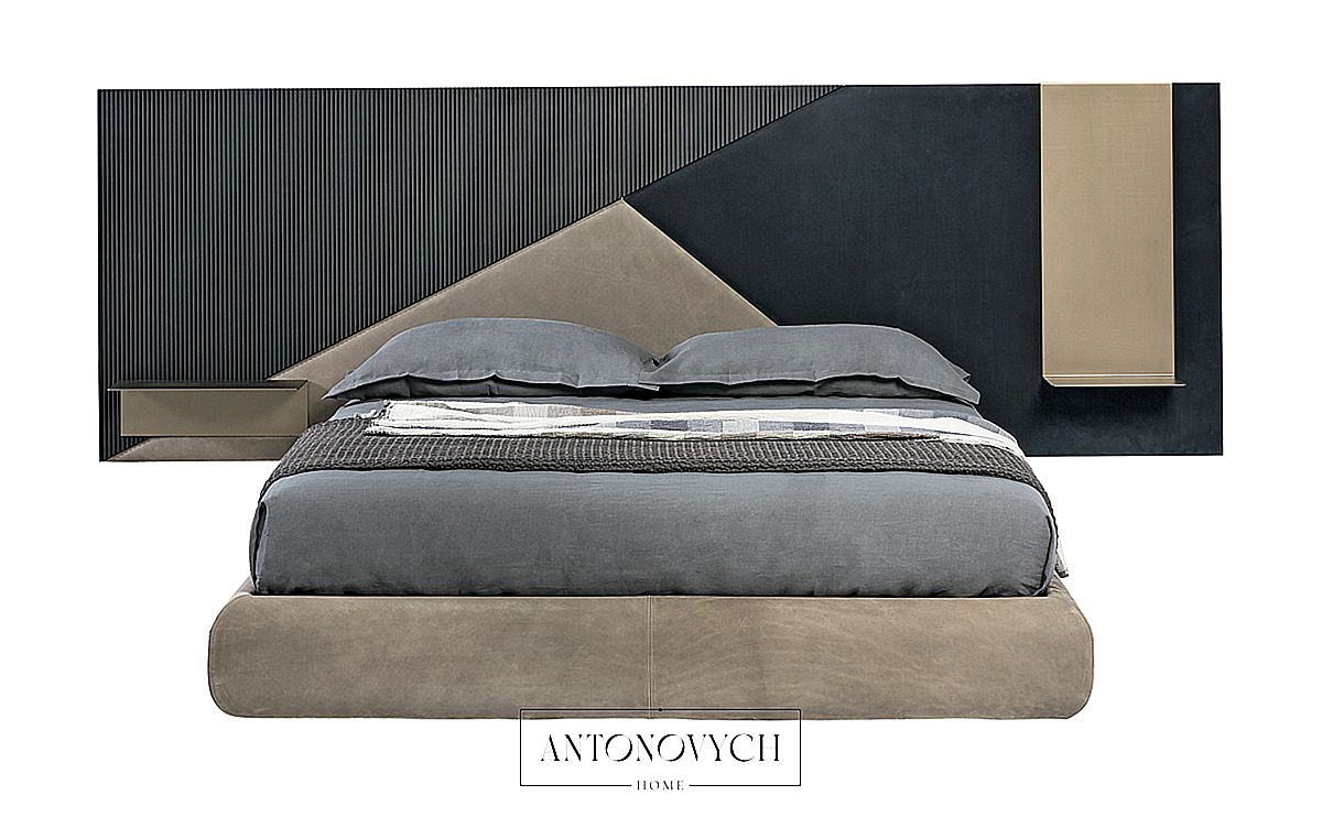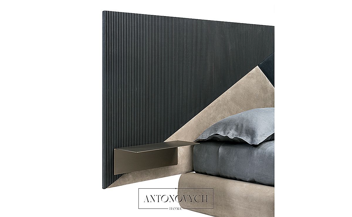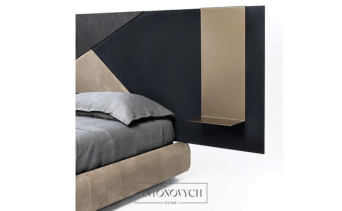 EGO мягкая кровать, основание с кожей P20 нубук liscio col. сеппия, изголовье с деревянными деталями, металлические полки светлой бронзы.