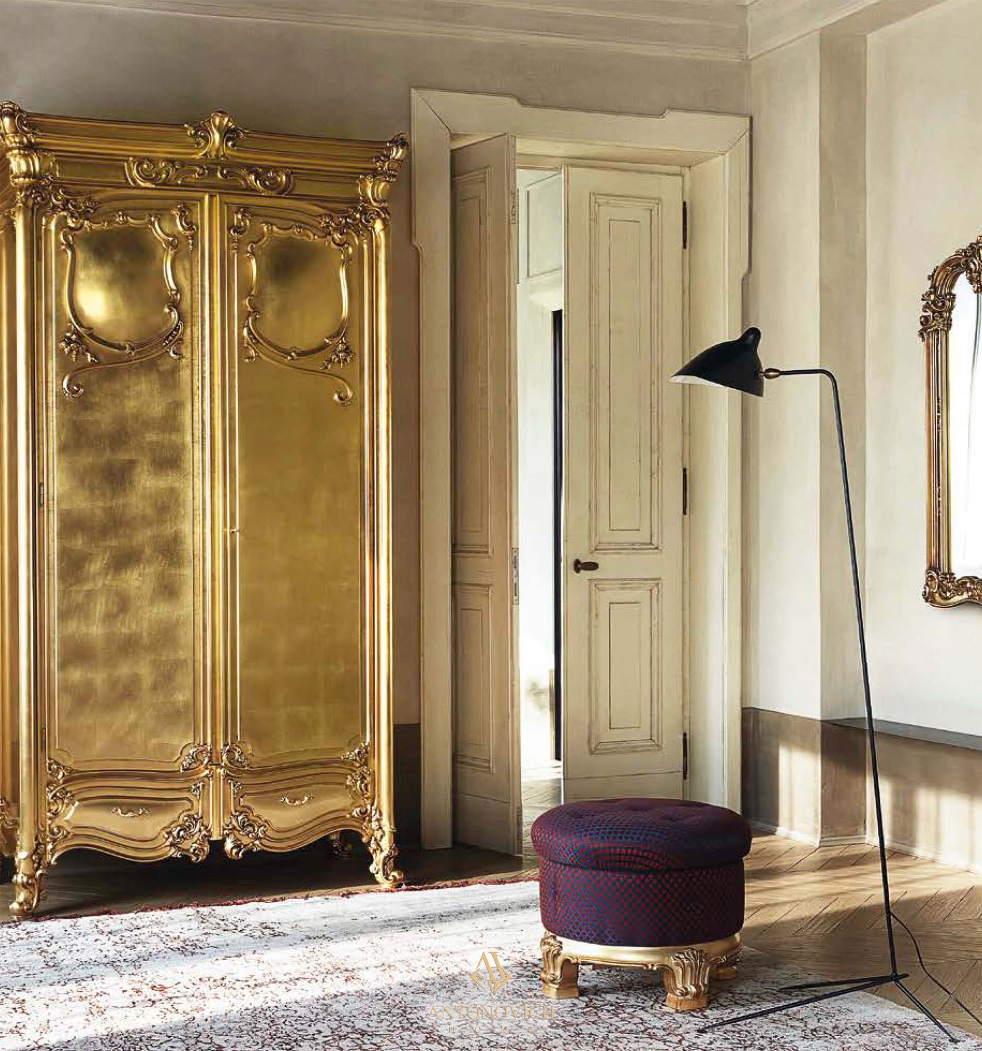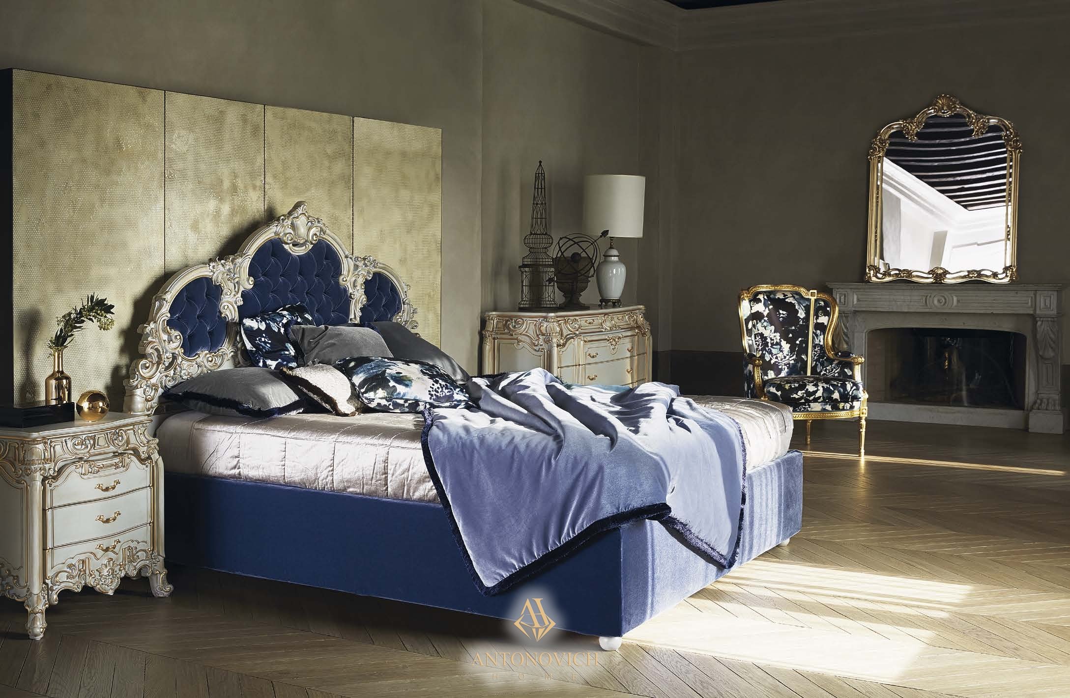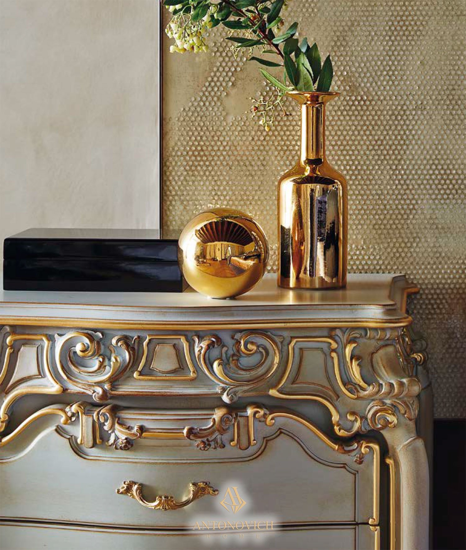 Скульптурные формы изголовья кровати и фасадов комода и прикроватной тумбочки, орнаменты с повышенной динамичностью конфигураций, беспокойный ритм затейливых линий относят мебель к разряду luxury, а покрытый сусальным золотом шкаф — лишнее тому подтверждение.