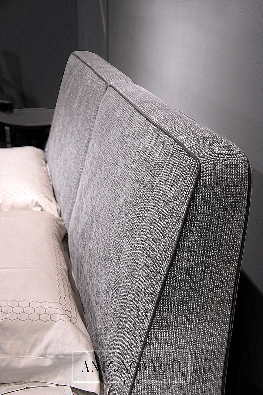 Кровать TL-99: Подголовник из ткани Tabasco col. Piombo, окантовка и структура подголовника из кожи Daino col. Графит, основание обито кожей Daino col. Графит с лакированными ножками цв. Железо.