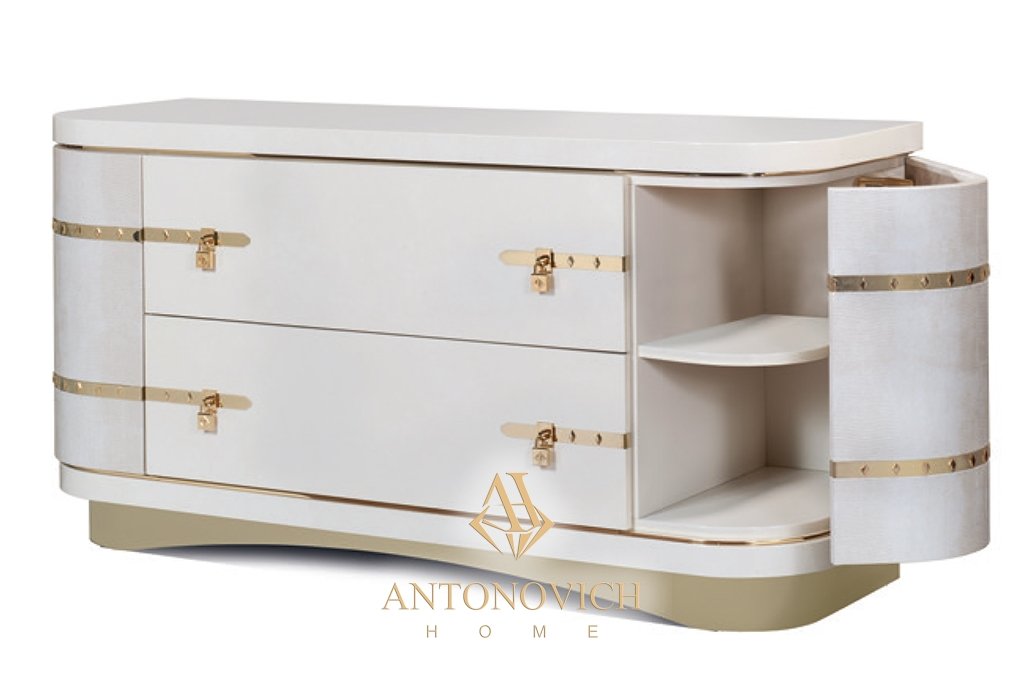 Отделка данной линейки представлена в нескольких вариантах, во внешнем виде мебели привлекает изысканный орнамент в качестве позолоченной окантовки с замочком.