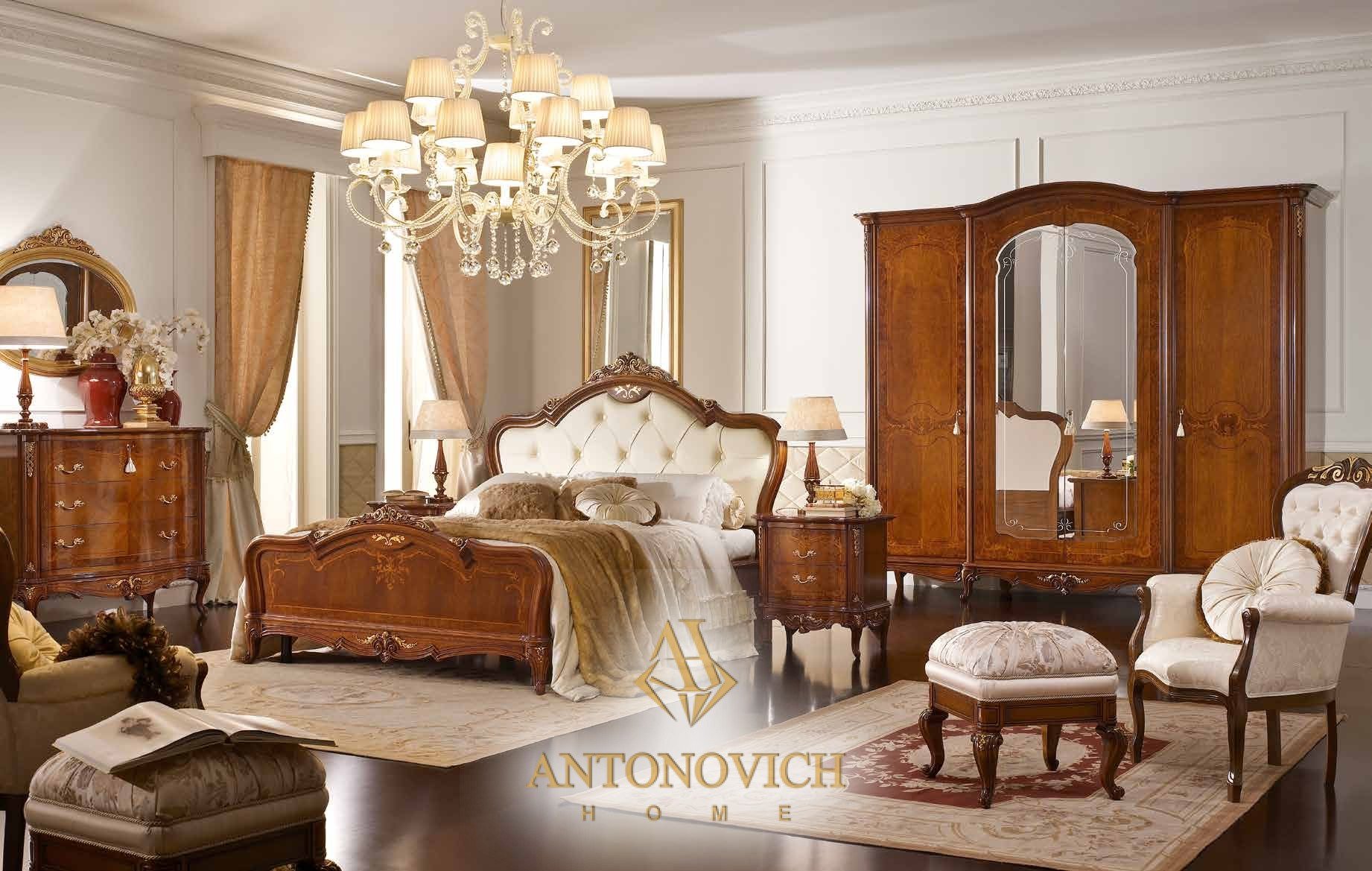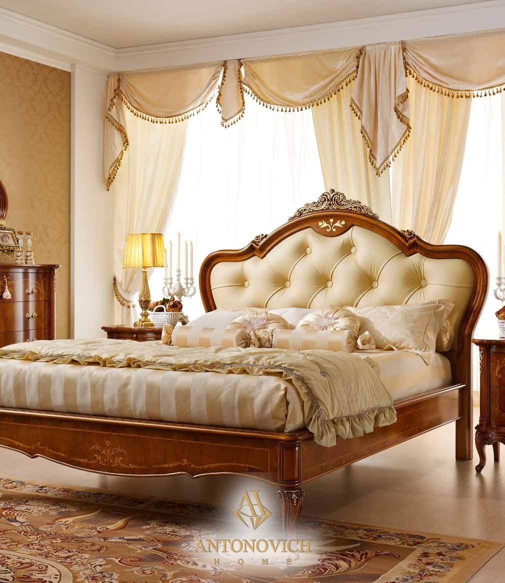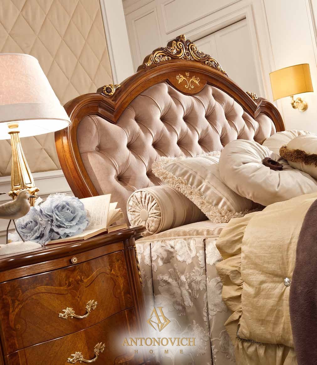 В гарнитуры входят кровати с роскошными изголовьями, украшенными резьбой, инкрустацией, пышной декоративной обивкой.
