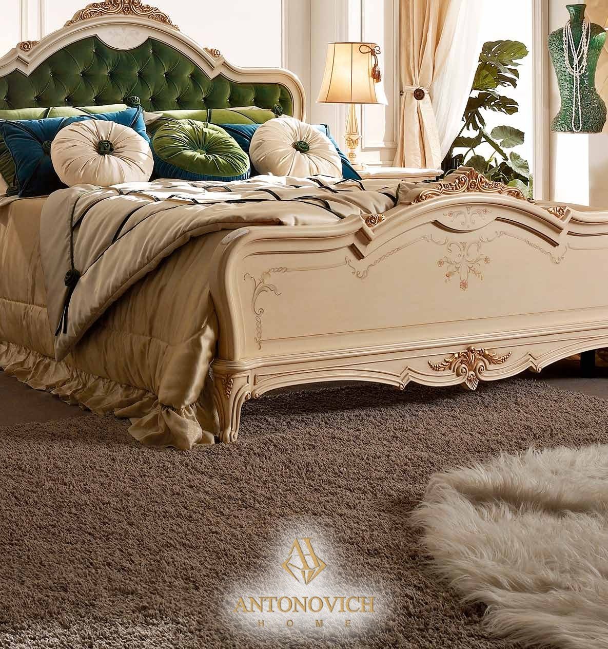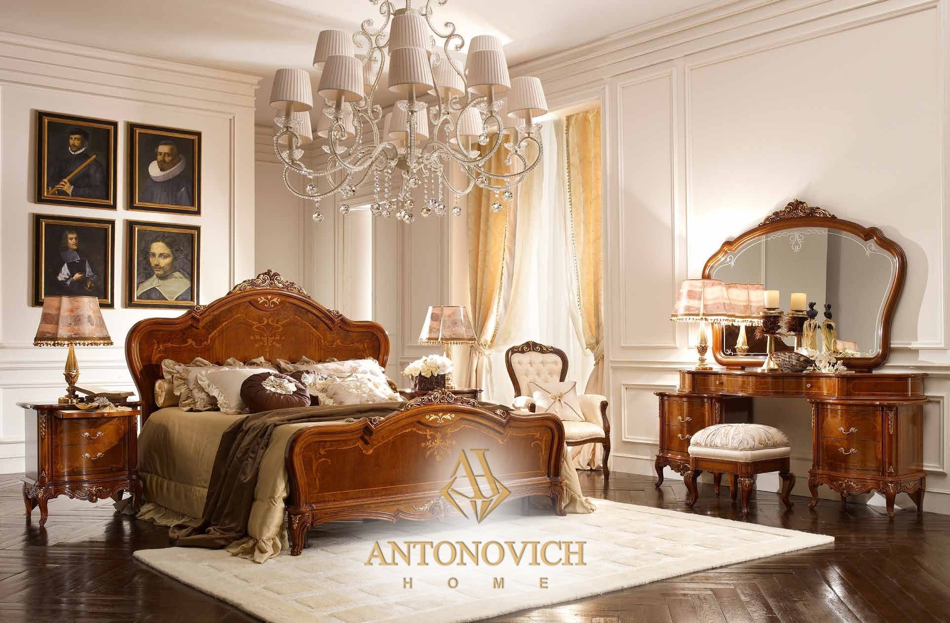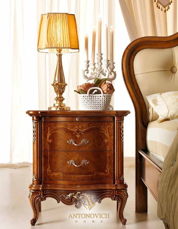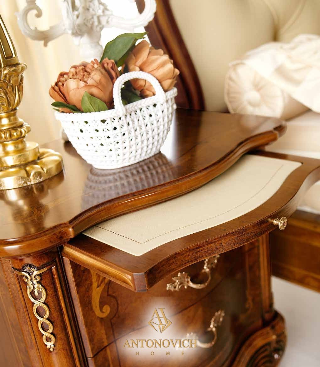 В гарнитуры входят кровати с роскошными изголовьями, украшенными резьбой, инкрустацией, пышной декоративной обивкой.