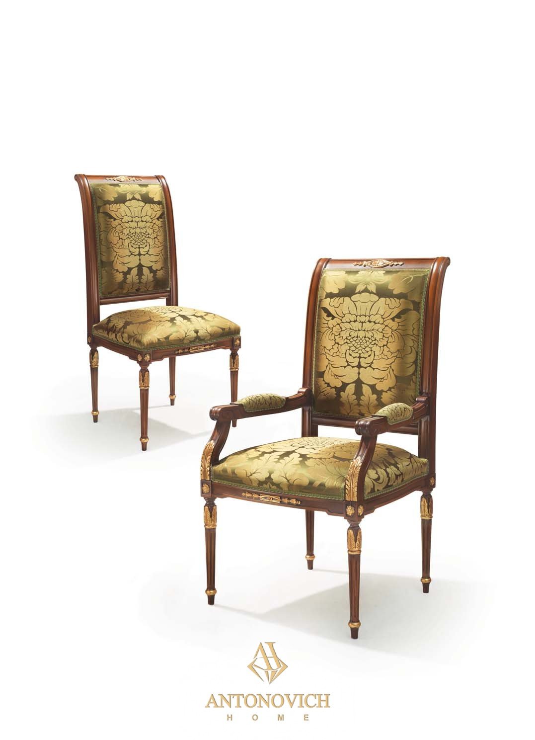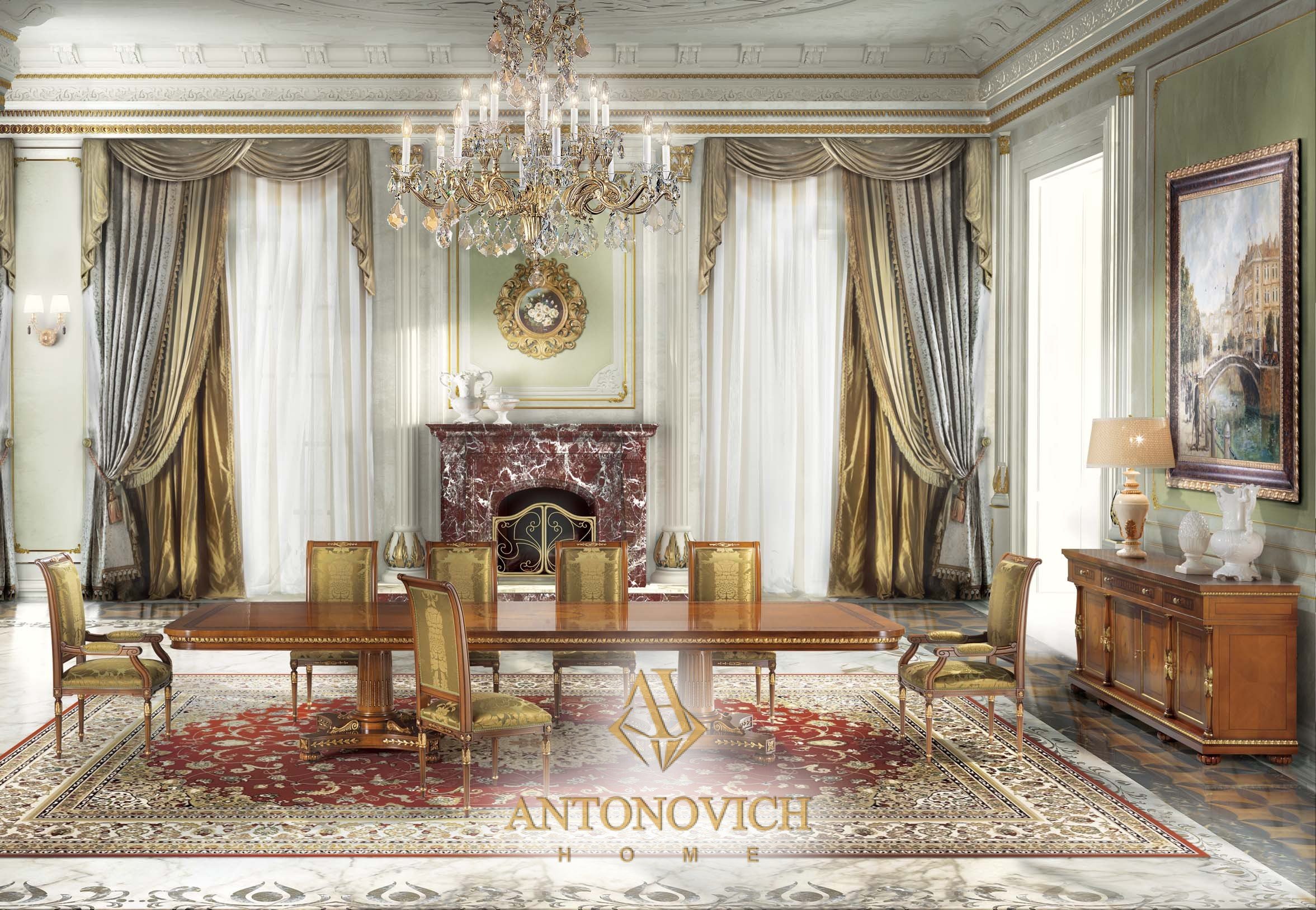 Предметы коллекции мебели для столовой BOLDINI выполнены по всем традиционным канонам: высокохудожественная ручная резьба, золочение, непревзойдённые инкрустации ценными породами древесины, элитные обивочные ткани.