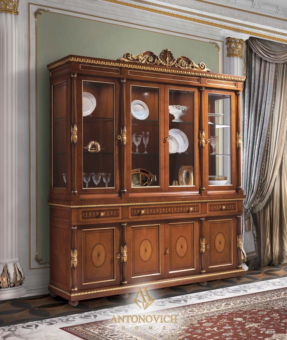 В коллекцию Angelo Cappellini входят: стол с инкрустированной столешницей, кресло, инкрустированный буфет на 4 двери, инкрустированный стеклянный шкаф на 4 двери.