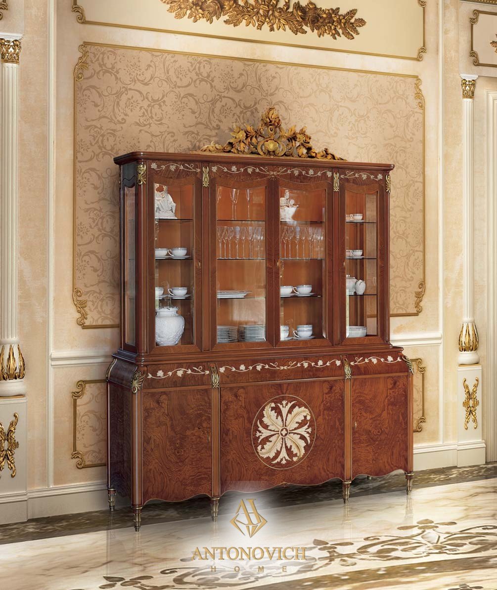 В коллекцию Angelo Cappellini входят: стол с инкрустированной столешницей, кресло кожаное, инкрустированная стеклянная витрина 4 двери, инкрустированный буфет 4 двери.