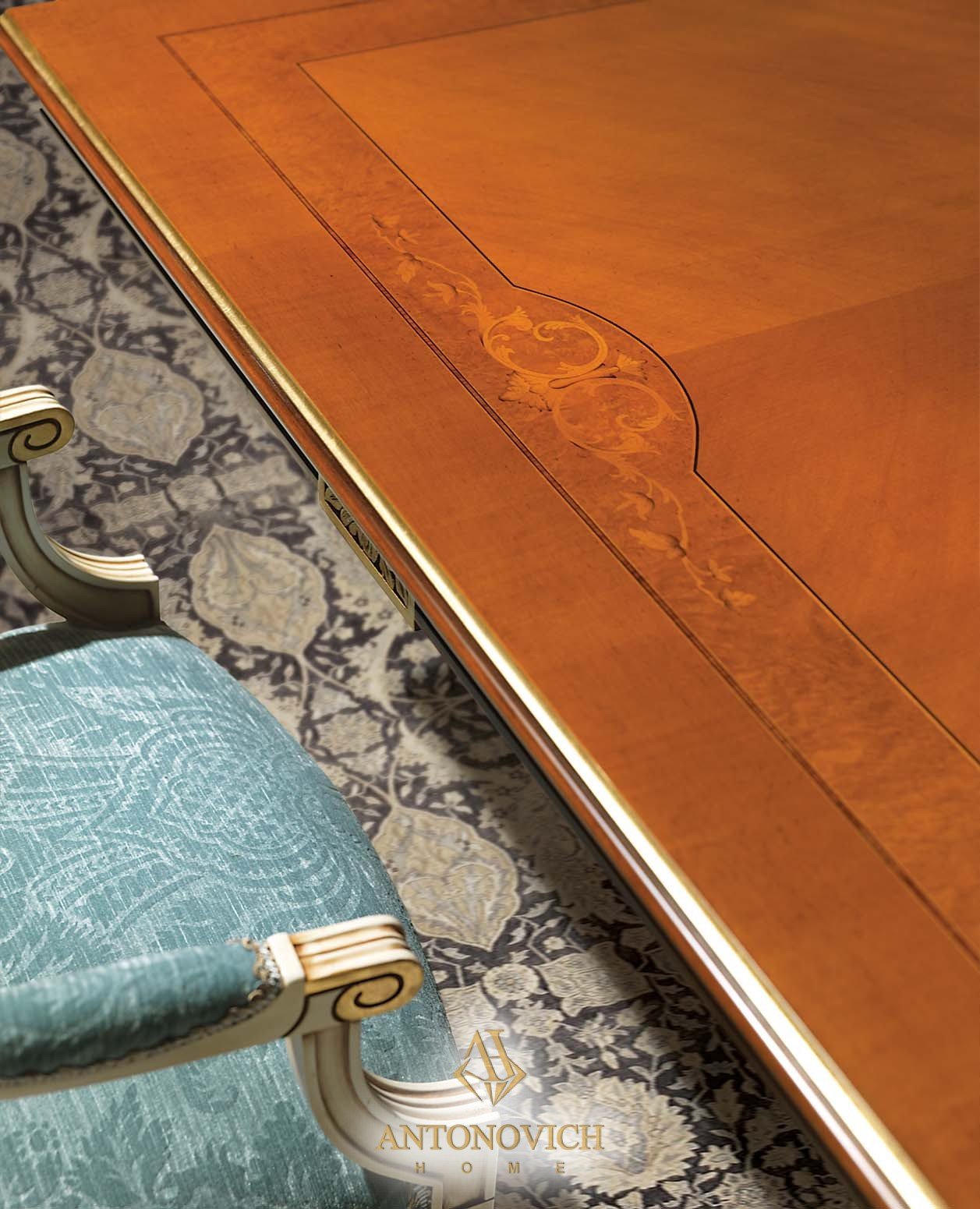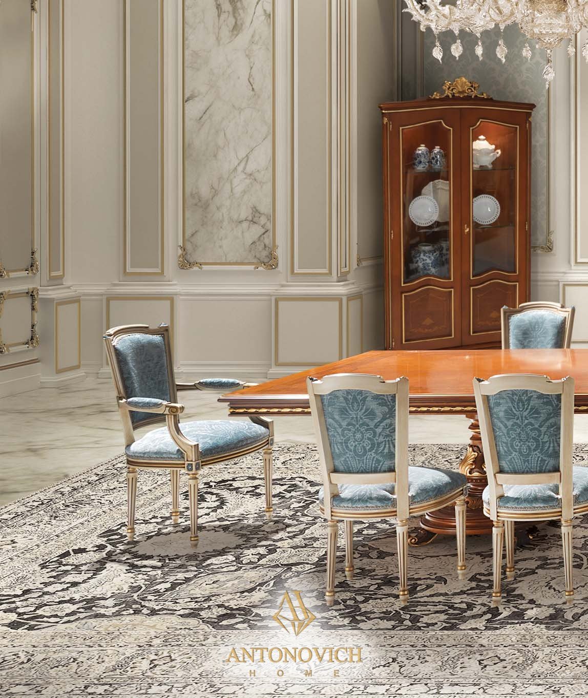 В коллекцию мебели для столовой MEONI Angelo Cappellini входят: стол с инкрустированной столешницей, кресло, стул, буфет с 6 инкрустированными дверцами, зеркало с инкрустированной рамой, инкрустированная угловая витрина.