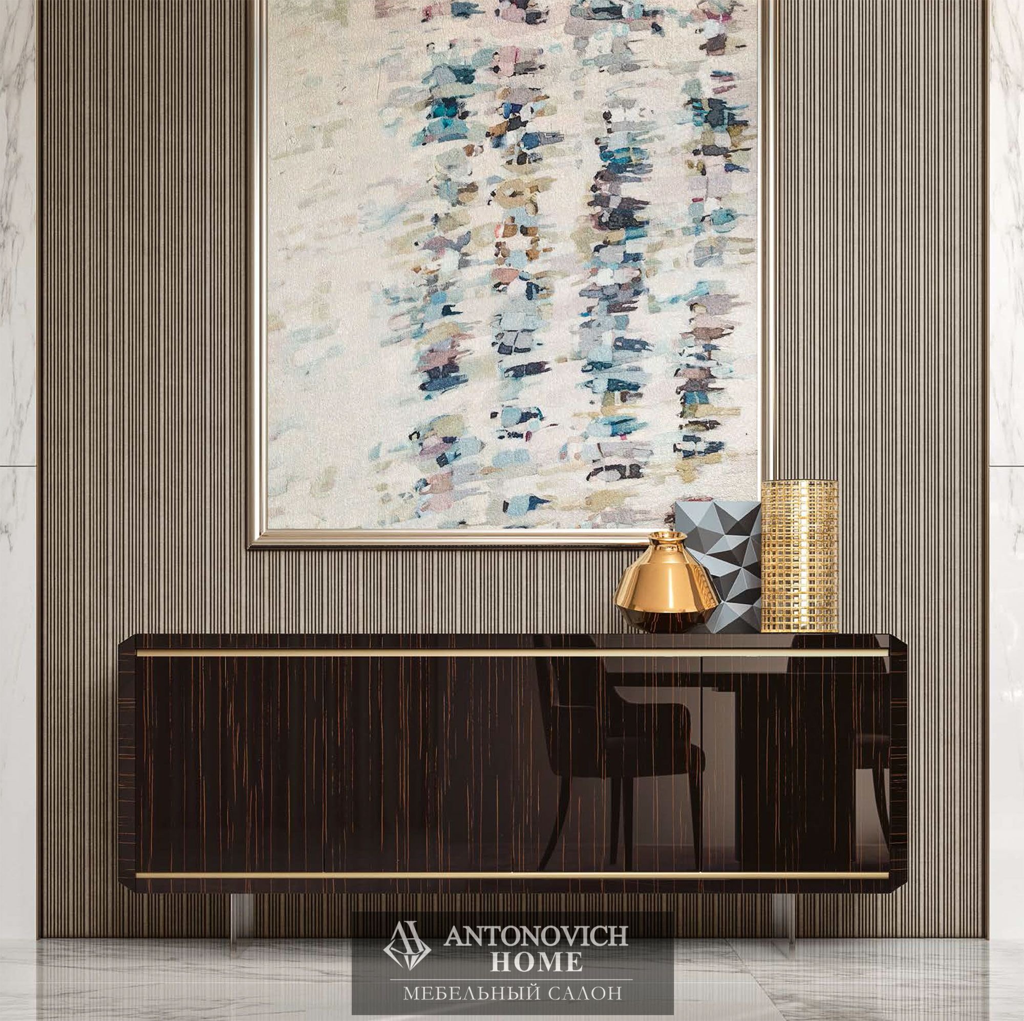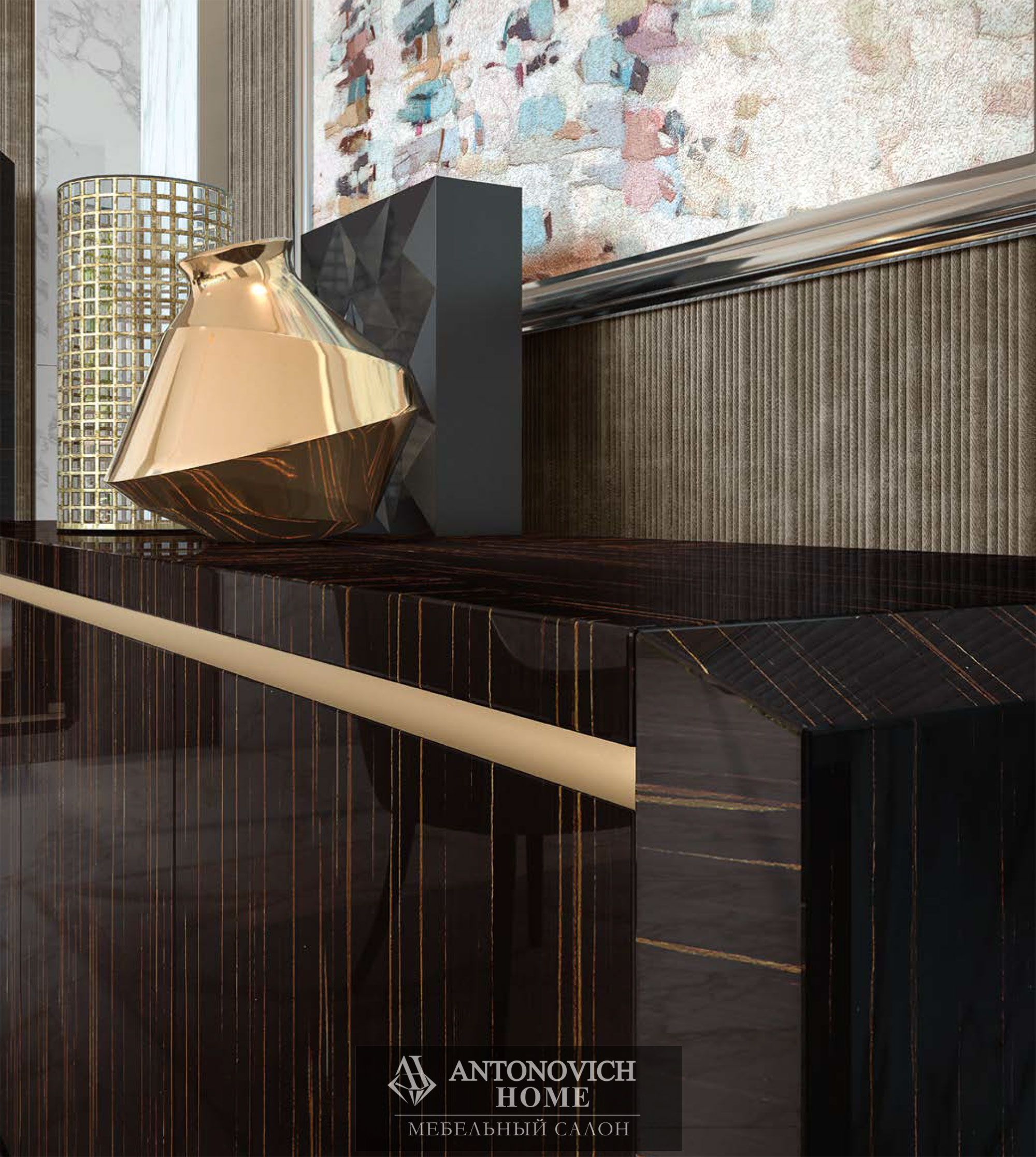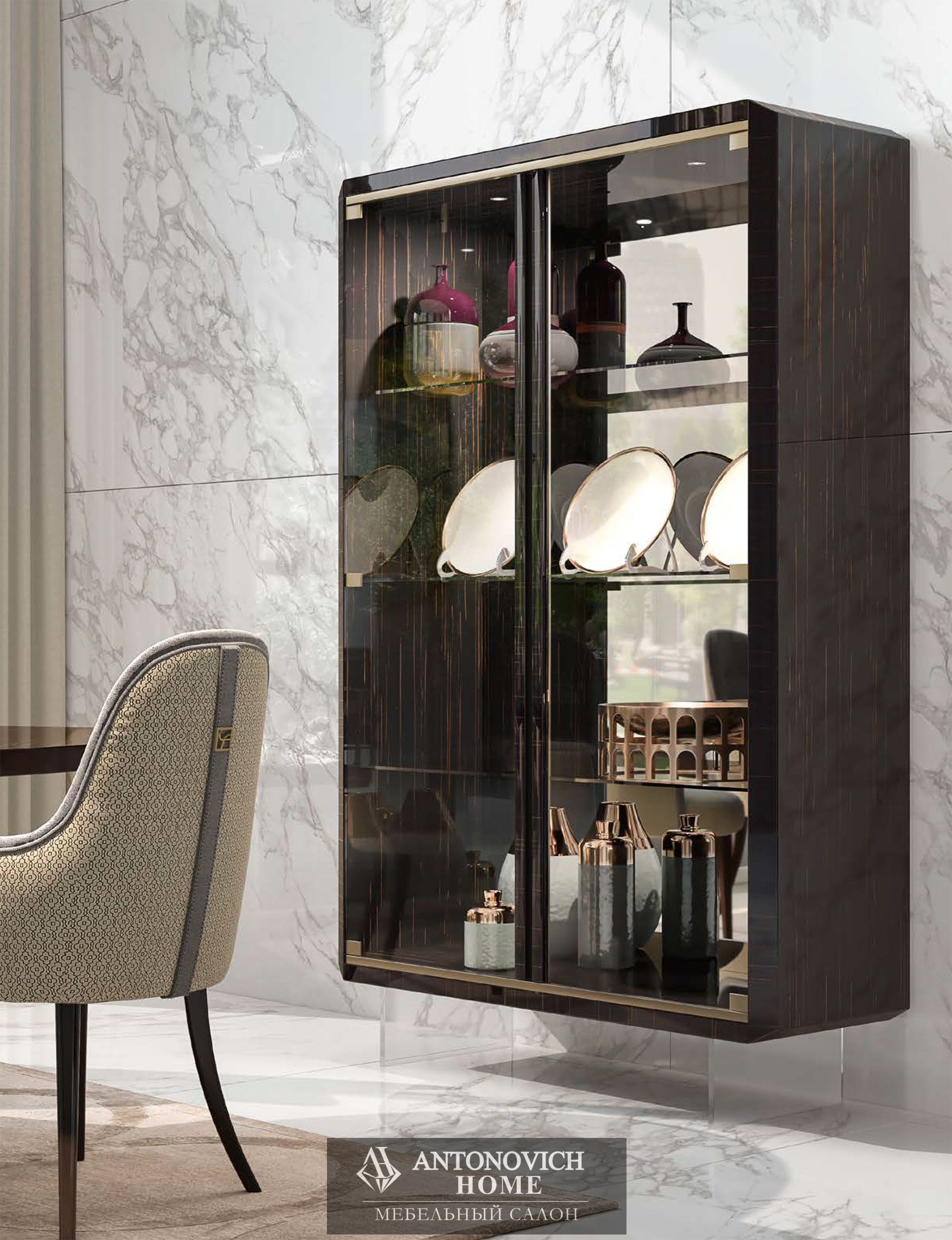 Золотистый профиль, очерчивающий периметр шкафа-витрины и горки, врезается в корпус из эбенового дерева, создавая единый ансамбль с неповторимой индивидуальностью.