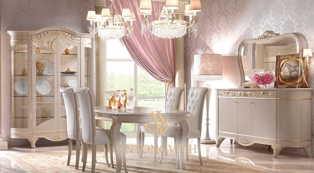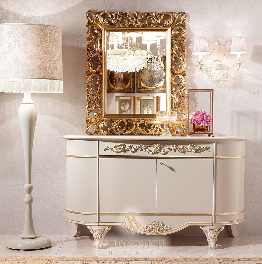 Буфет имеет выпуклые боковины, особую красоту ему придает большое зеркало в изящной раме. Типичный пример итальянского мастерства — резные элементы, украшающие профиль шкафа и подсвеченные золотой отделкой.