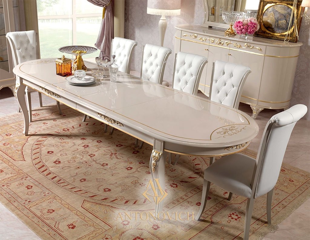 Столы из коллекции «Diamante» — продолжение изысканного, утонченного интерьера. Деталь: овальный раздвижной стол; раздвижные элементы имеют ту же лакировку, что остальная часть стола.