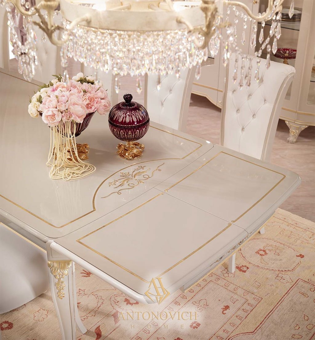 Столешница большого раздвижного овального стола из радики, инкрустирована цветочными мотивами. Округлый профиль ножек подчёркивается дорогим резным декором.