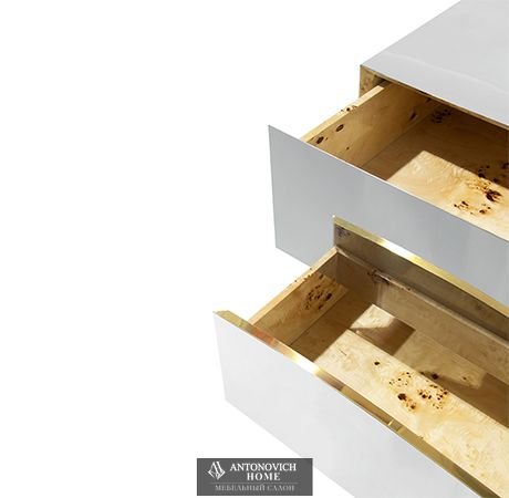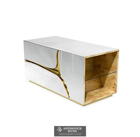 Полированная нержавеющая сталь с литой латунной отделкой экстерьера. Древесина. Интерьер: шпон из тополя, полированная латунь и стекло (4 двери и 1 выдвижной ящик). База: полированная латунь