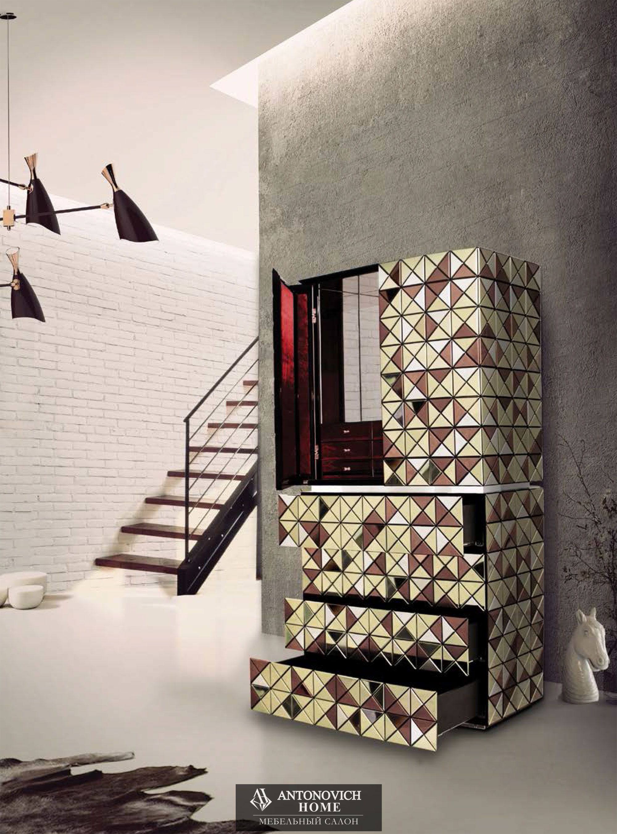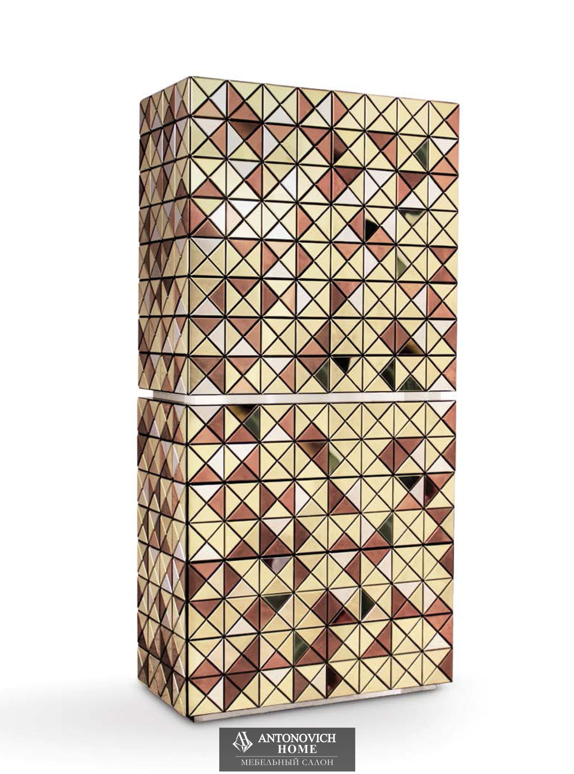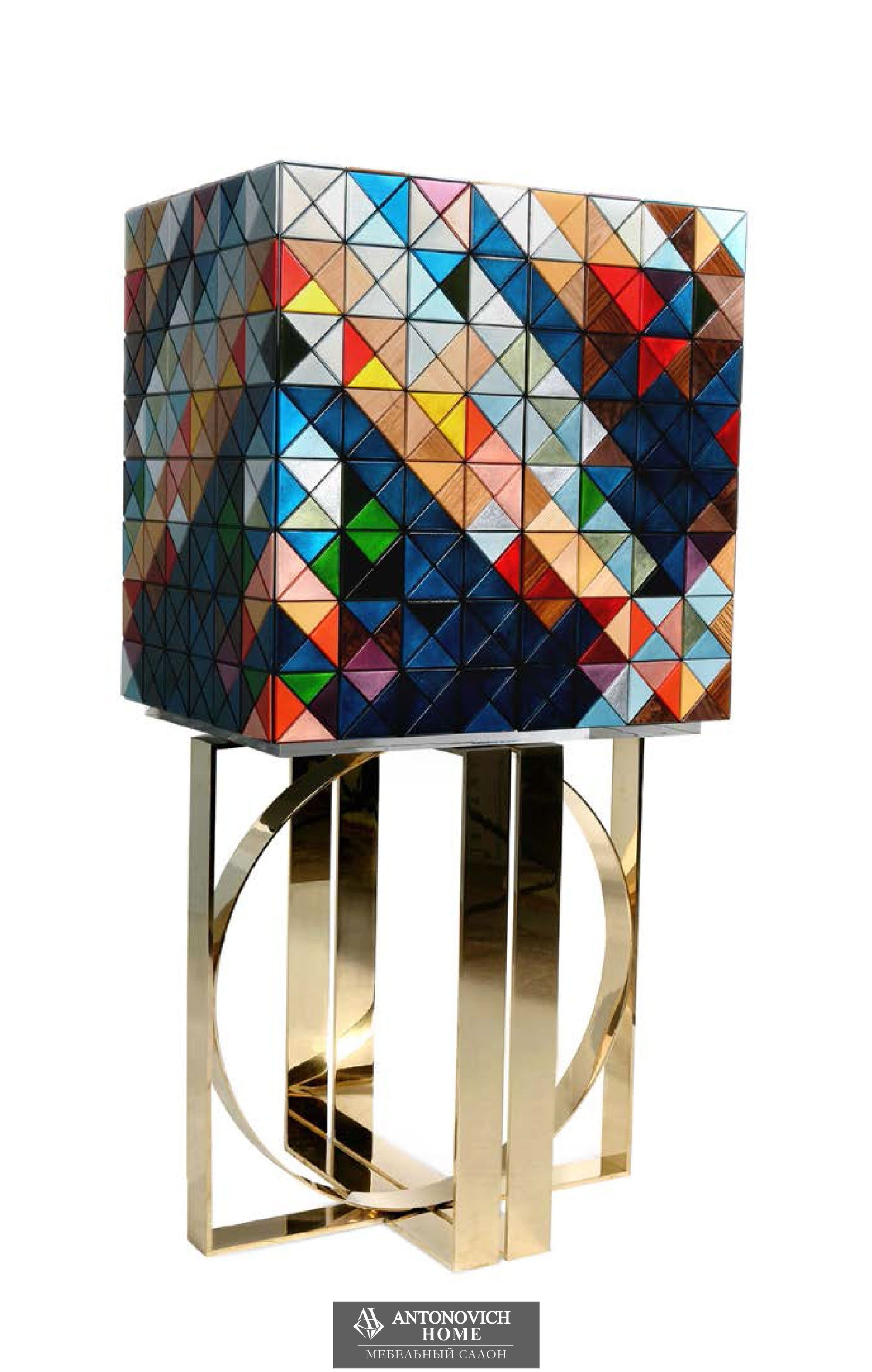 Сделанная из 1088 треугольников, верхняя часть Pixel Cabinet играет с восприятием и сочетает исключительные материалы с разноцветными композициями, чтобы придать корпусу уникальный, поразительный дизайн: треугольники позолоты ручной работы, 10 различных видов древесных листьев от палисандра до шпона африканского грецкого ореха и лакирование.
