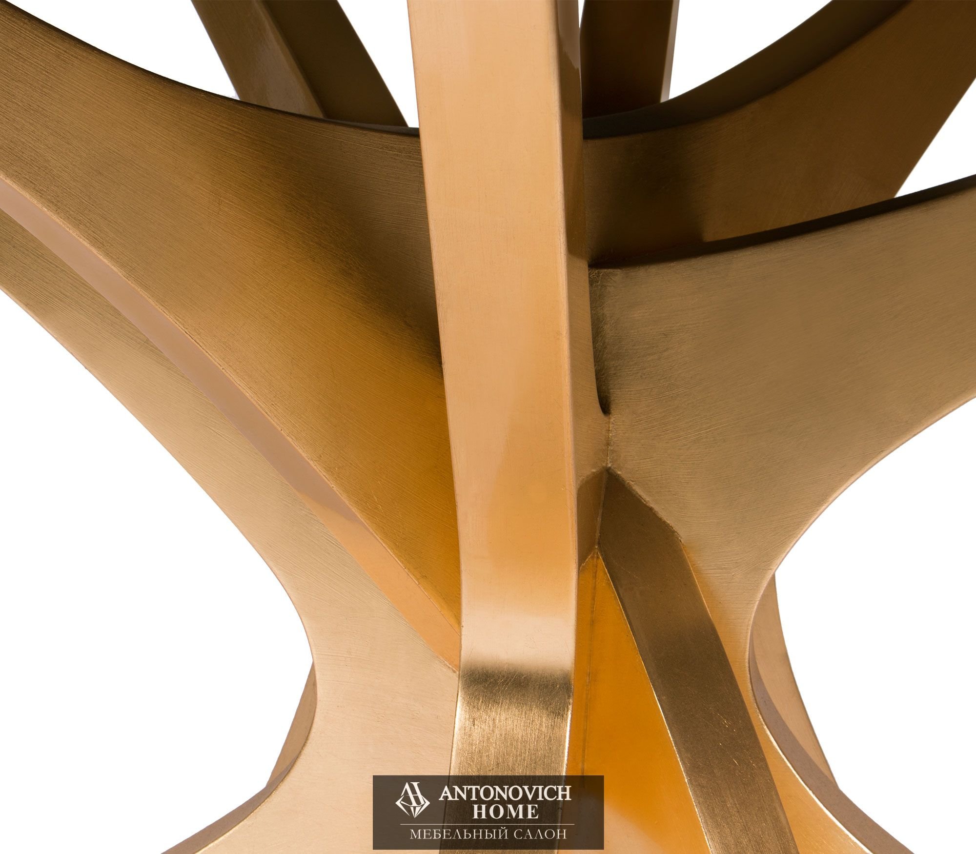Стол с вершиной сделан из маркетри в эбеновом листе. Его основа изготовлена из дерева, облицована золотым листом. Отделка глянцевым лаком.