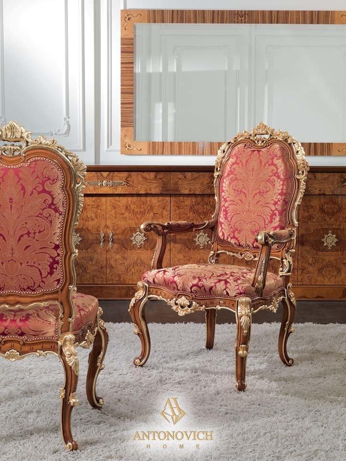 Пышная резьба по дереву украшает стулья и кресла этой коллекции мебели для столовой и превращает эти предметы мебели в королевские, мимо которых нельзя пройти без восхищения.