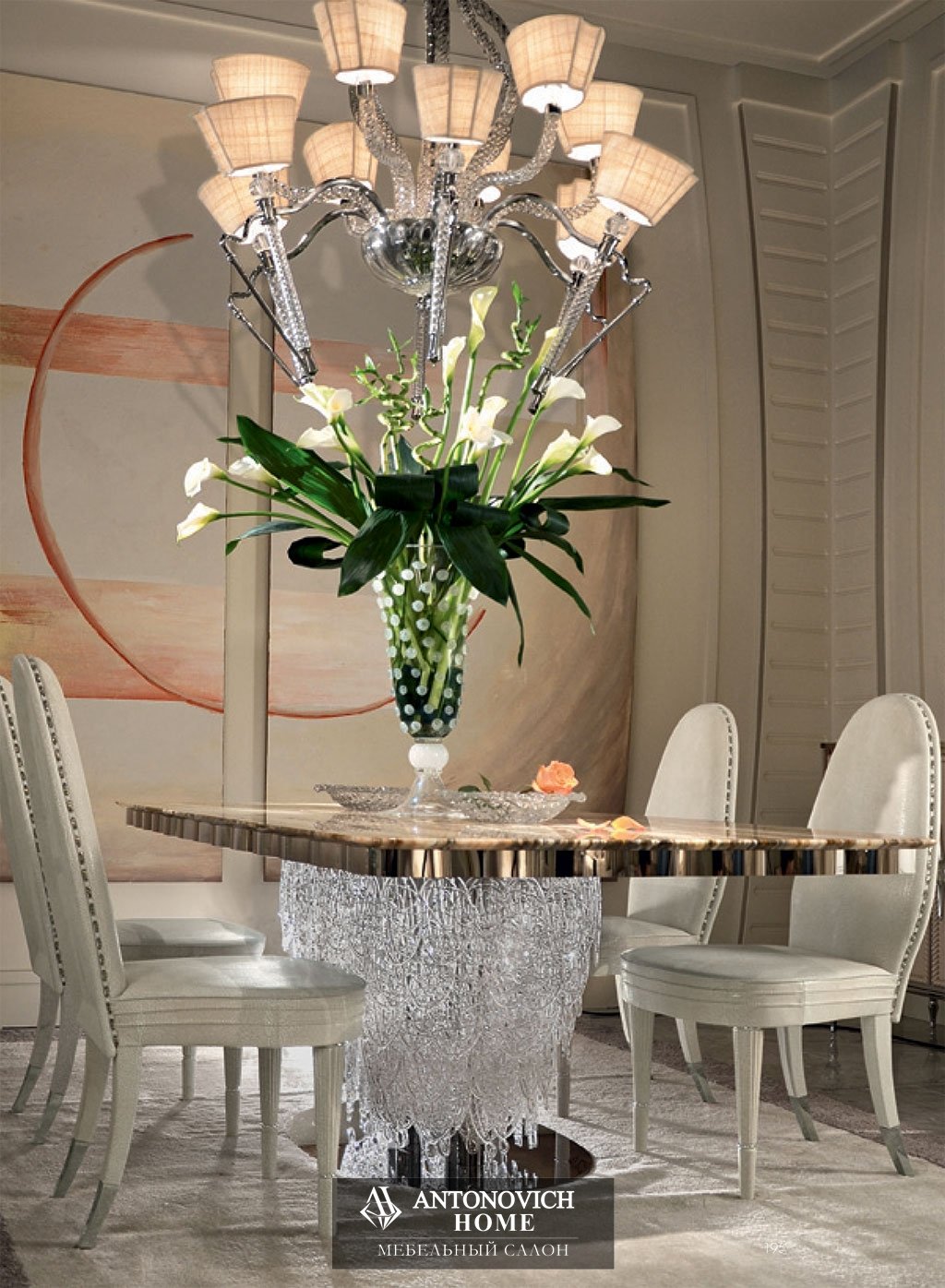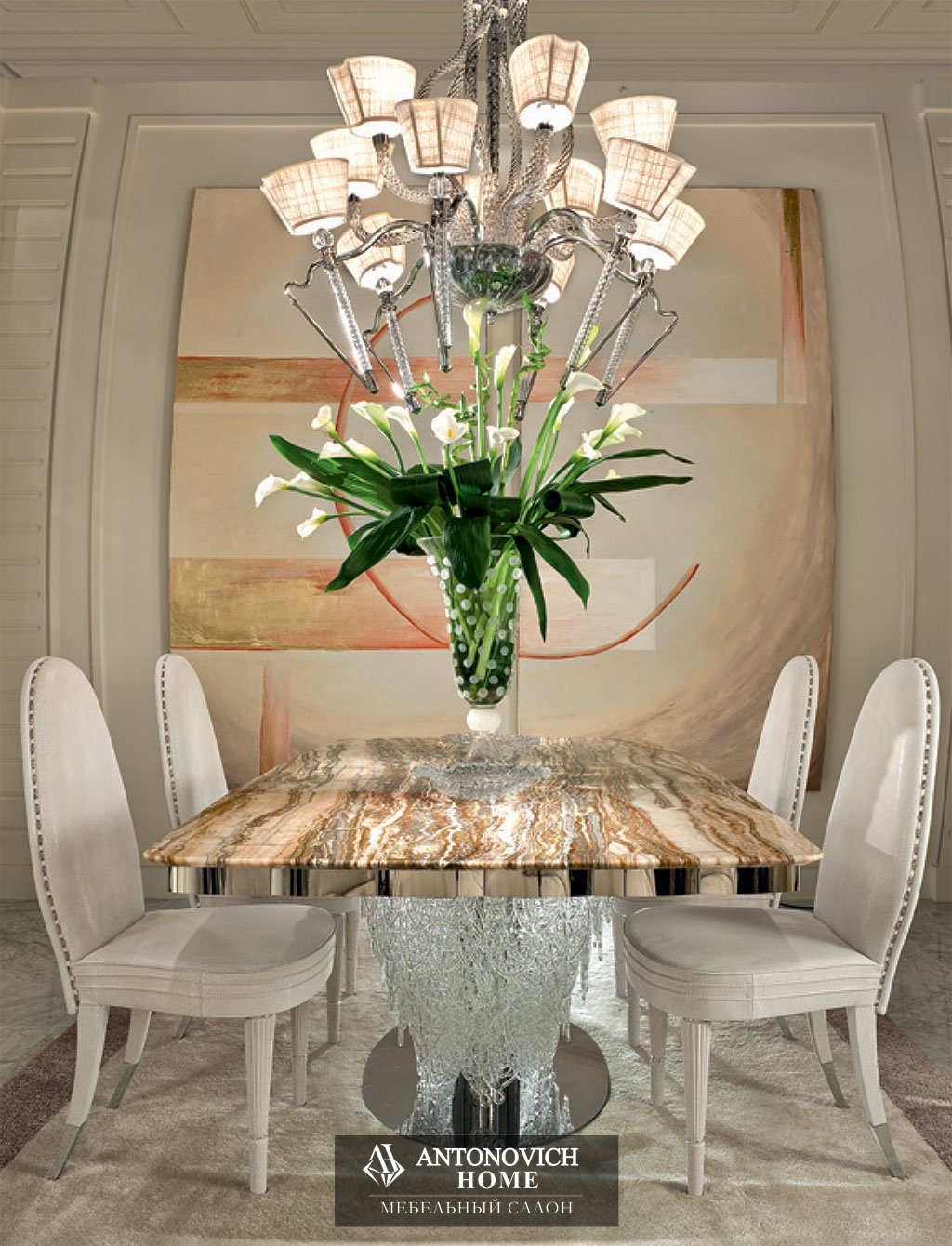 Роскошная и изысканная коллекция мебели для столовой итальянской фабрики Cornelio Cappellini украшена кремовыми и тёплыми цветами, созданными в элегантной атмосфере: драгоценные материалы, такие как муранское стекло и итальянский мрамор, уникальная отделка, кожа и ткани, а также высококачественный пошив и обивка, представляют ценности уникальности и элегантности, характерные для итальянской культуры.