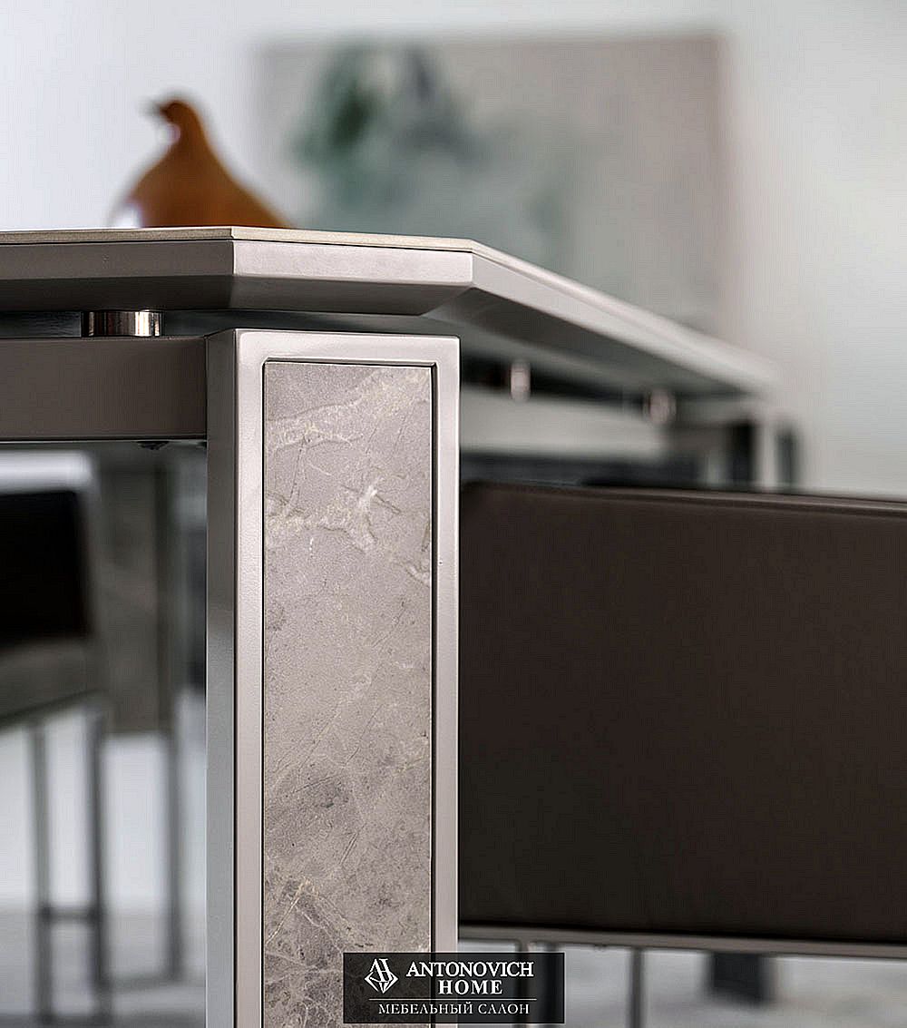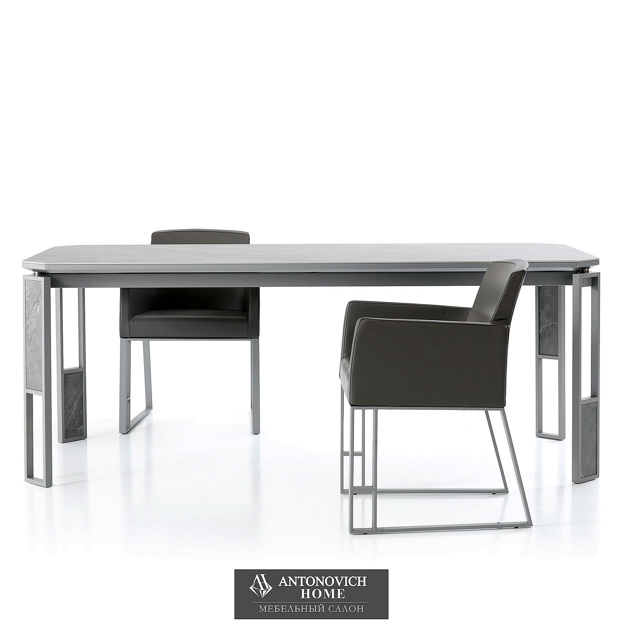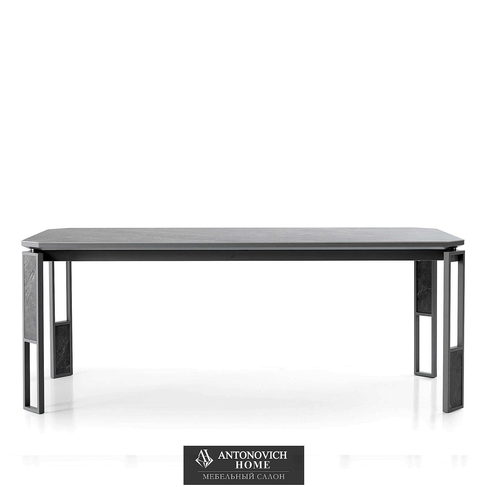 Обеденный стол Link со строгим дизайном и чистой формой. Изготовлен из металлического каркаса, украшенного элементами из керамогранита с керамическим покрытием. Доступен со столешницей из стекла, дерева или керамогранита с керамическим покрытием.