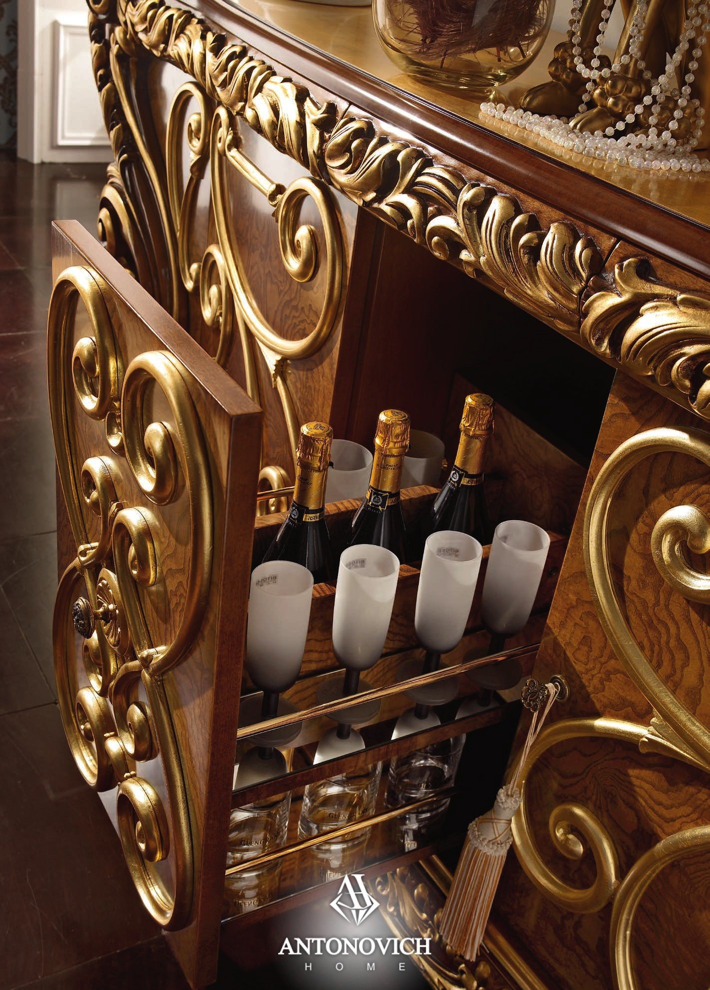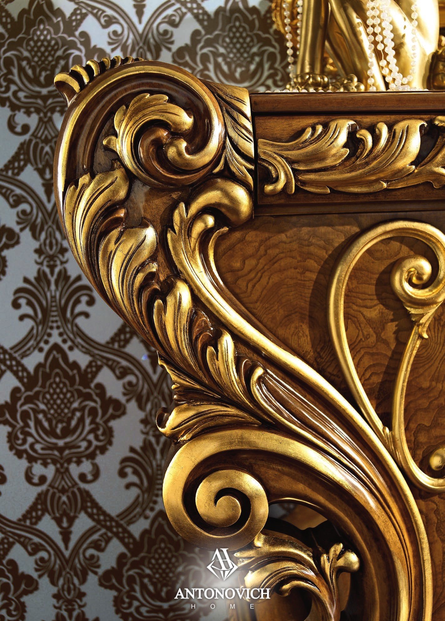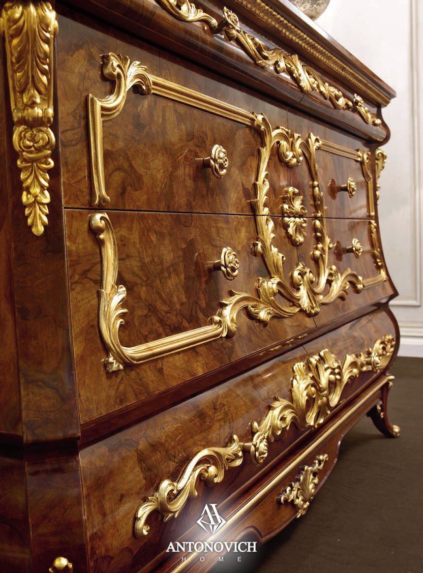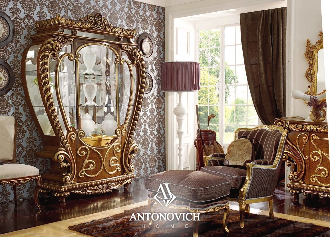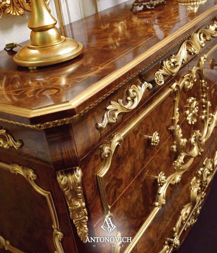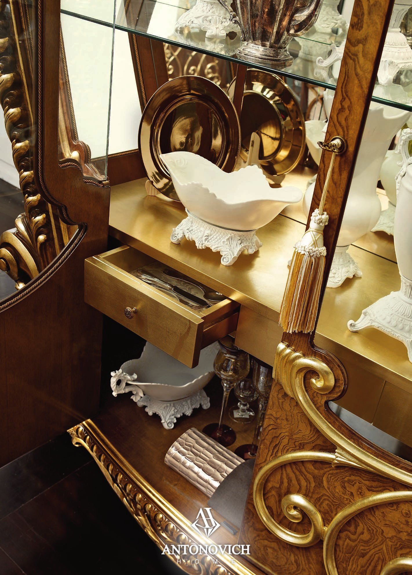 Предметы мебели: витрины с хрустальными дверцами, комоды, имеют восхитительную форму царской кареты и делает её достойной роскошных царских апартаментов.