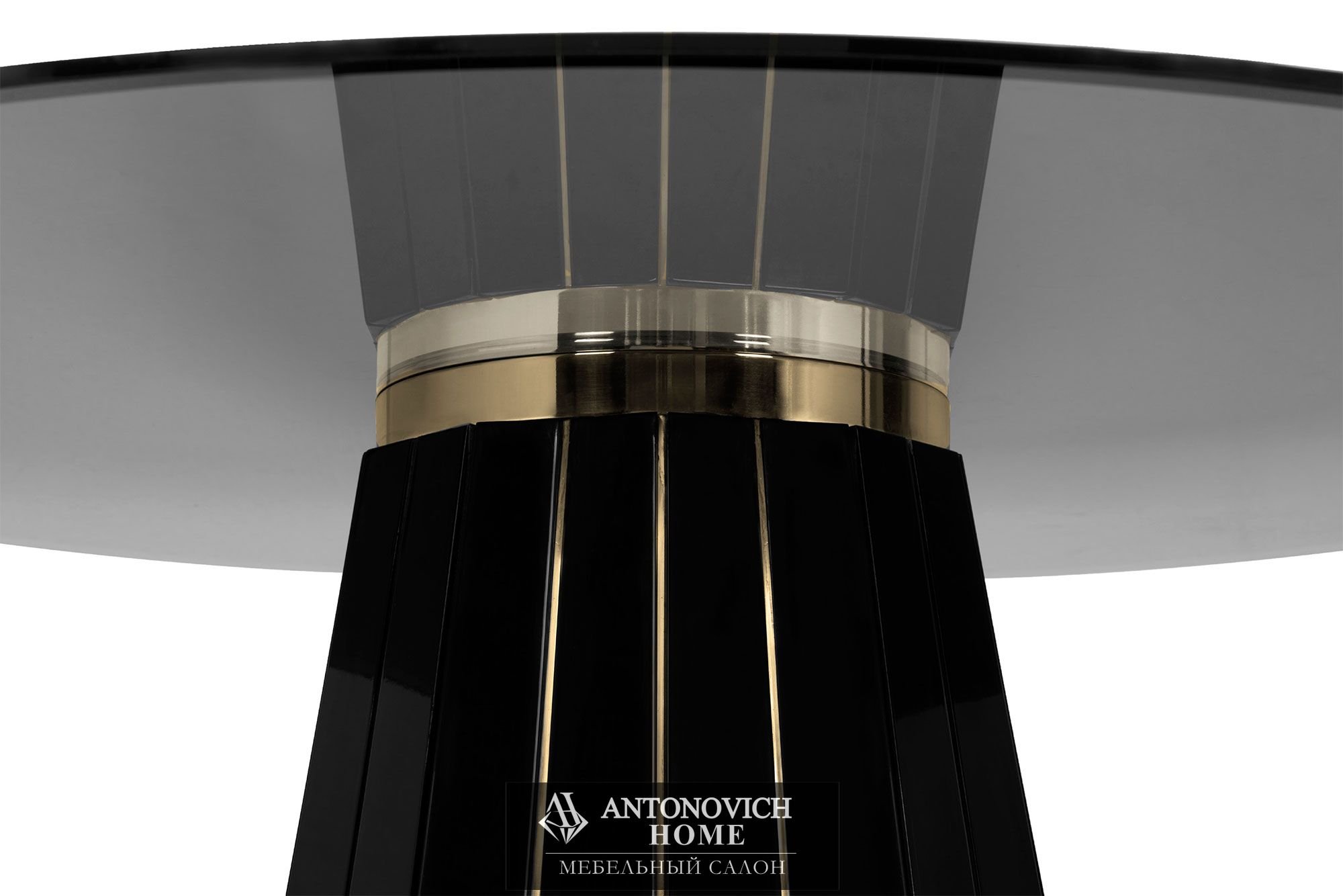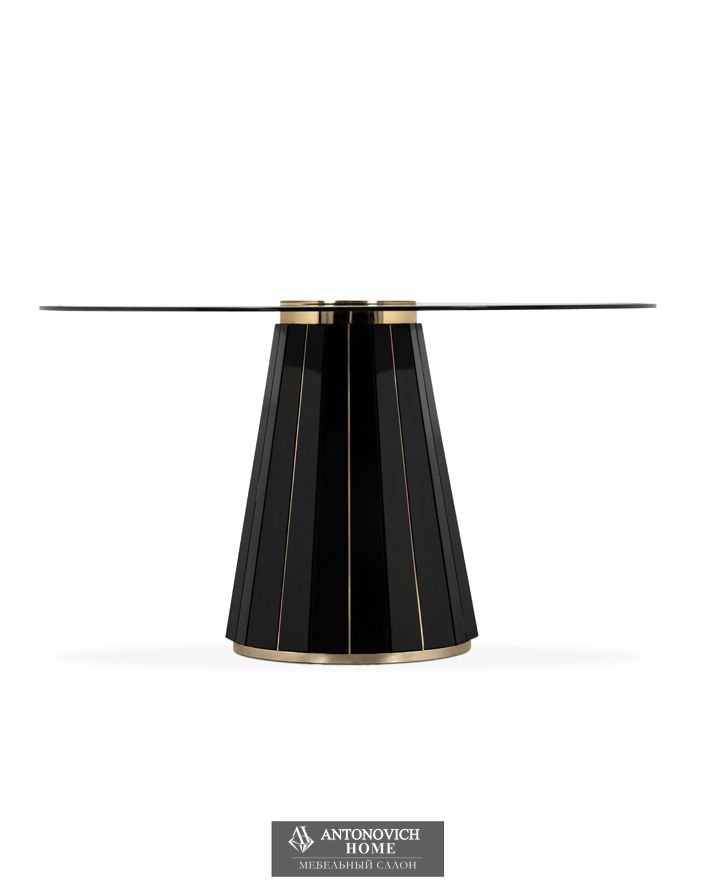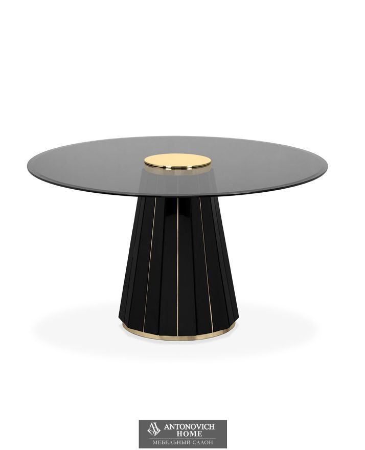 Обеденный стол Darian черпает вдохновение в потрясающем буфете Darian. Этот потрясающий стол ручной работы изготовлен из круглого копченого стекла, помещенного поверх деревянной конструкции в черном лаке, которого касаются позолоченные латунные прутья.