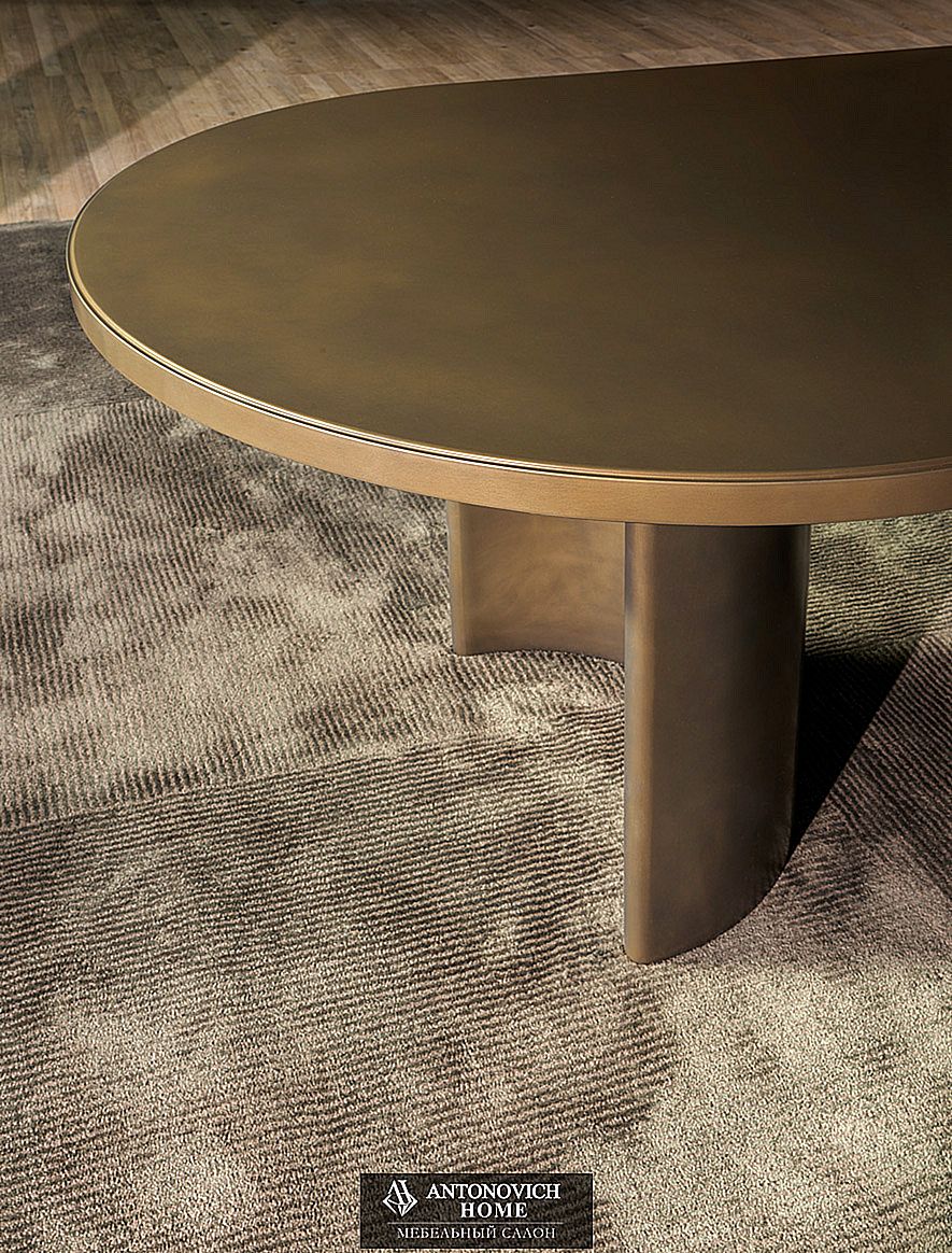 Верхняя часть вертикальных опор соединена со столешницей двумя деревянными капителями. Изысканная и необычная игра встречных кривых также является структурным стабилизирующим элементом: геометрический центр полукруглых оконечностей столешницы совпадает с центром вертикальных опор. Использование изогнутых форм отвечает необходимости подчеркнуть непрерывность столешницы, избегая прерываний. Оригинальная часть покрыта медью, материал, который трудно использовать для современных обеденных столов. Центр исследований и разработок Molteni&C заменил медную пластину на деревянной столешнице специальным металлическим порошковым лаком, который дает тот же эффект прочности и ремесленного блеска, придавая большую устойчивость.
