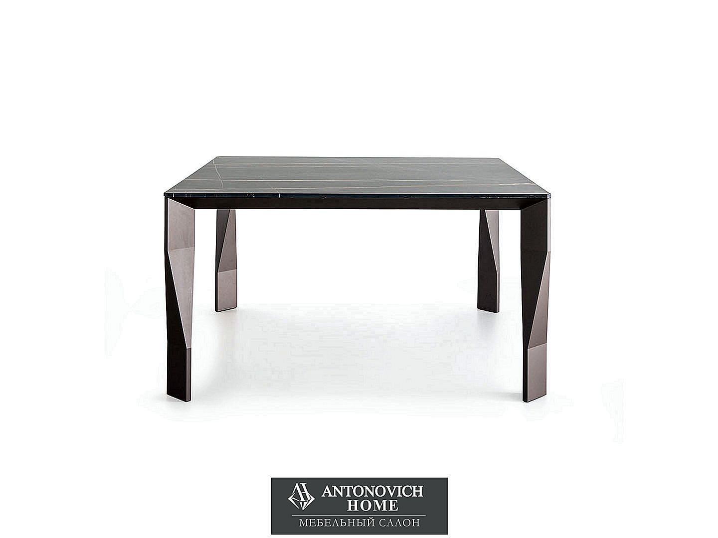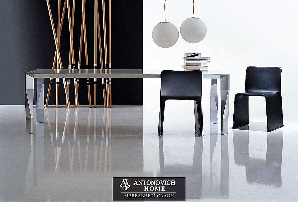 Квадратные или прямоугольные столешницы доступны из стекла, опорная конструкция выполнена из блестящего алюминия или покрыта глянцевым лаком.
