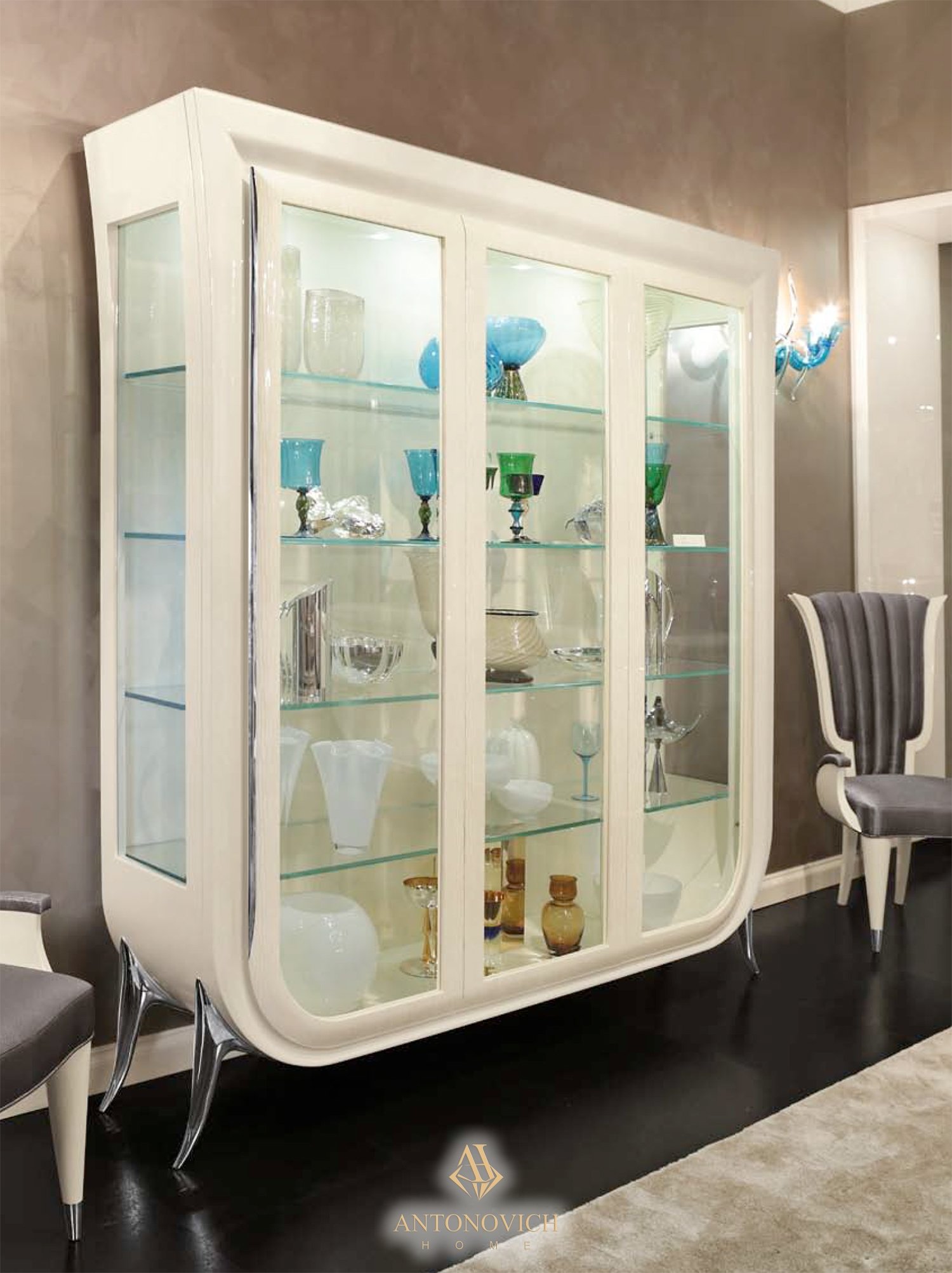 Сочетание линий витрины Trilogy, стеклянных полок и натурального света светодиодной подсветки — определяют современный стиль коллекции для столовой.