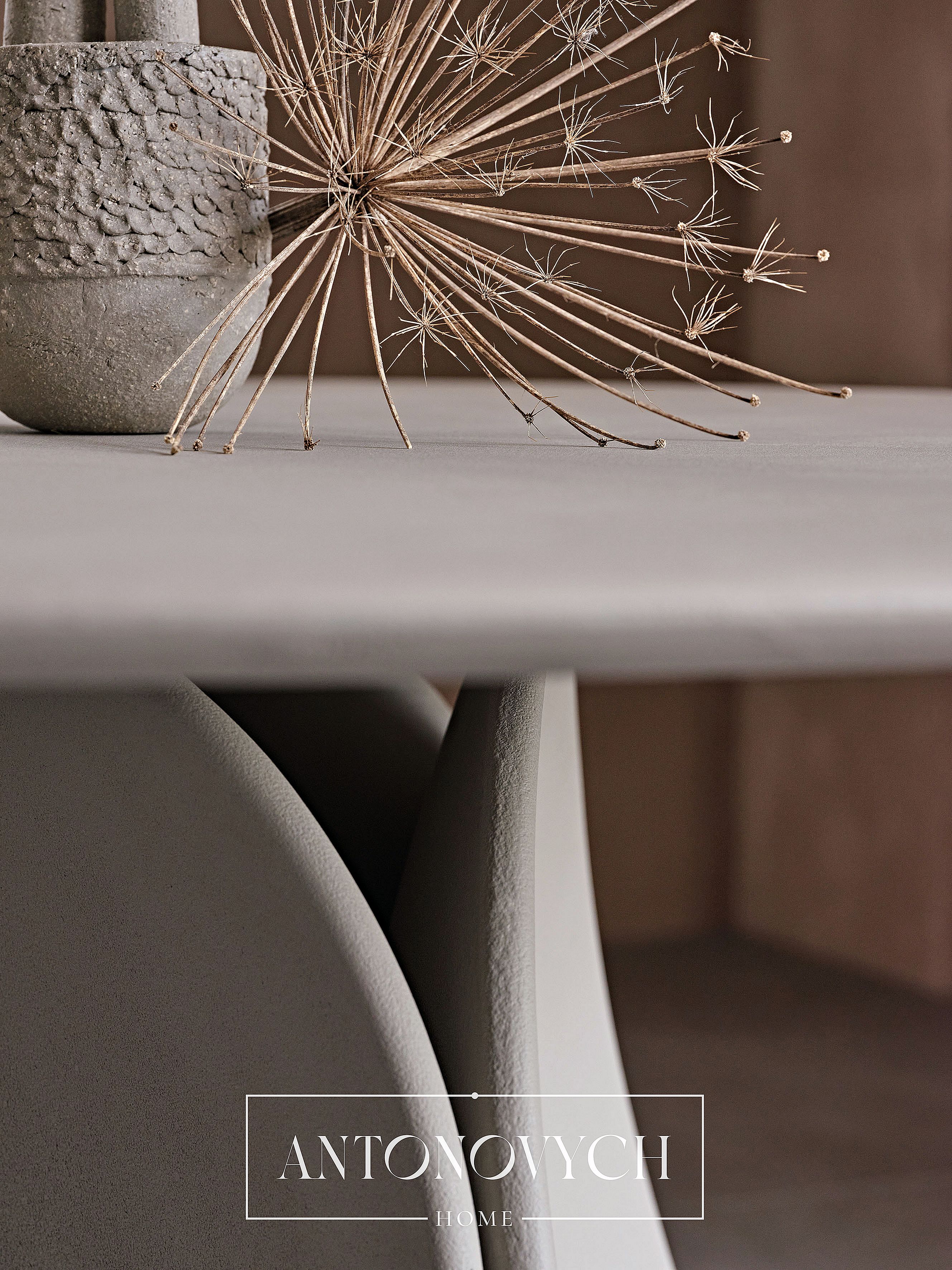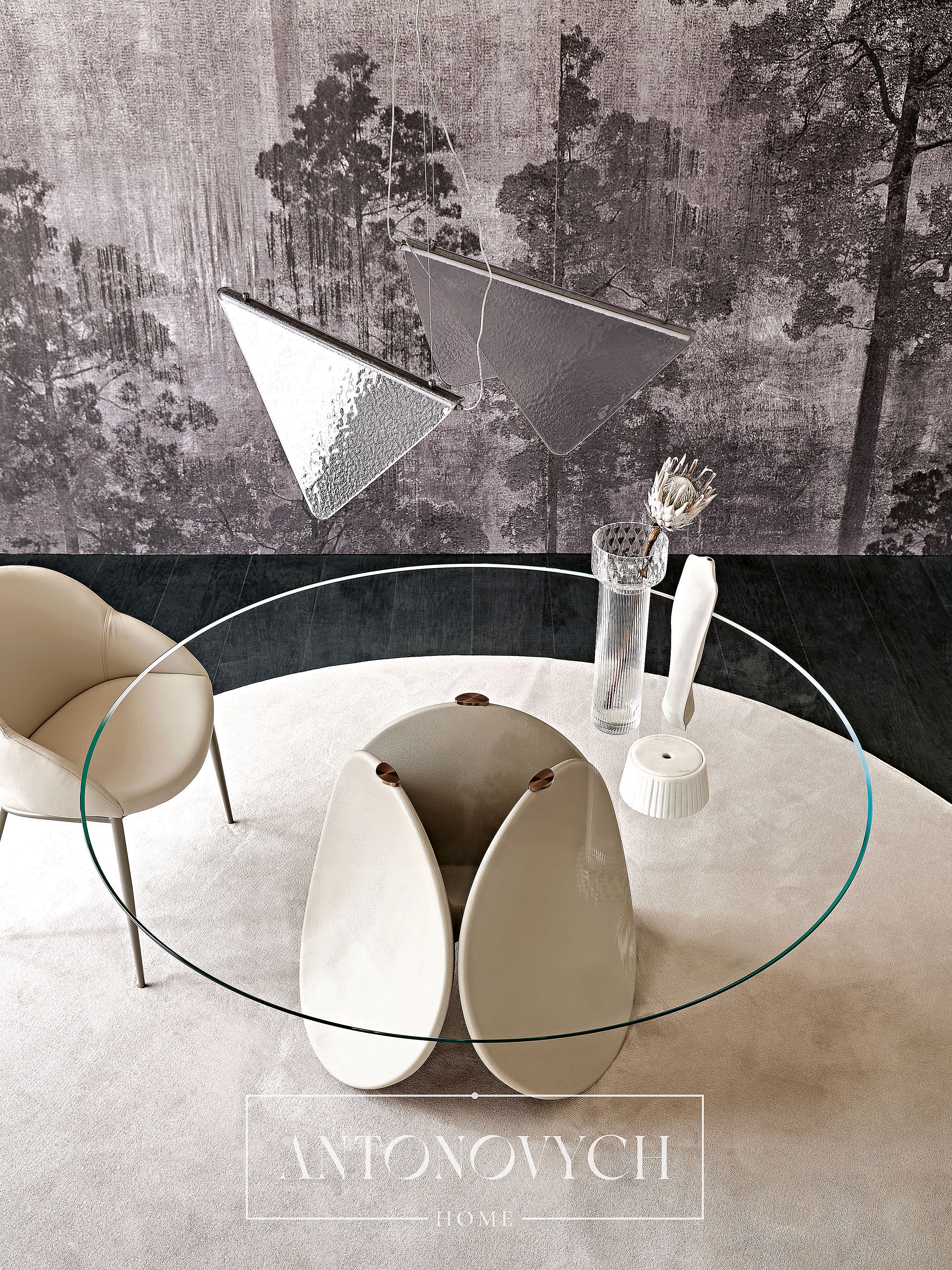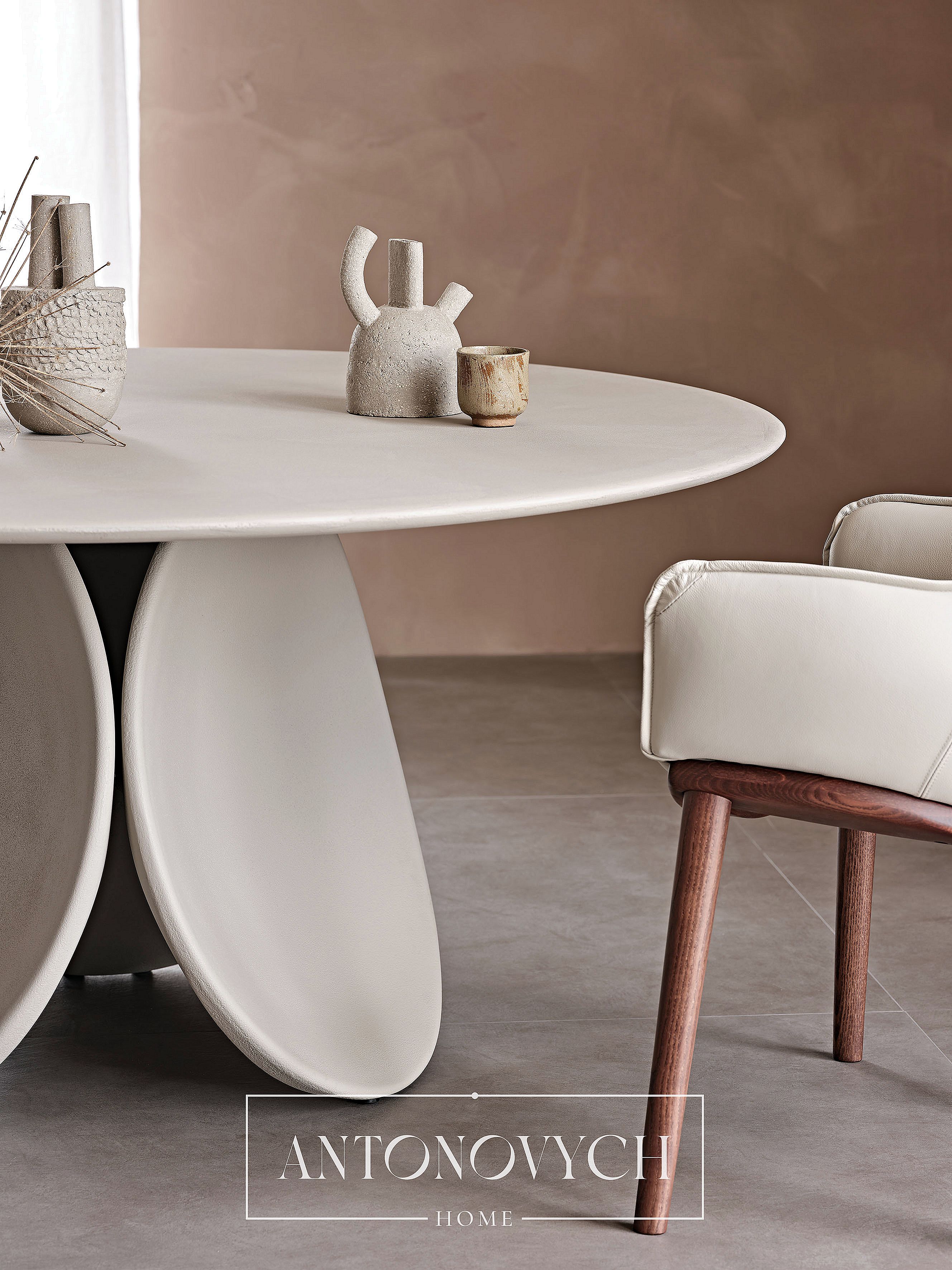 Дизайн настольной скульптуры «Максим» проистекает из неразрывной связи между ее формой, состоящей из трех лепестков, и материалом, из которого она изготовлена. Подобно тому, как скульптура возникает из материала в руках мастера, так же, глядя на этот круглый дизайнерский стол, вы можете оценить усилия и время, затраченные человеком на его формирование. Это происходит от ручного мастерства и техники холодного формования, которая не требует использования энергетических ресурсов. Промышленные процессы предназначены только для поддержки высокого ремесленного компонента ручных этапов заливки жидкого цемента и отделки. Основание этого современного стола на самом деле отделано глиной землистых и естественных оттенков. Максим выпускается в двух версиях: круглый стол с прозрачной стеклянной столешницей, позволяющей оценить скульптурную основу во всей ее полноте, и модель Maxim Argile, полностью вылепленная из глины, что придает ей еще более органичный вид. Эта прочная отделка также делает стол Maxim идеальным в качестве стола для дизайна на открытом воздухе. «Когда материала достаточно самого по себе, без надстроек и дополнений, мы имеем чистый и непосредственный объект, который уже является готовым продуктом», — объясняют дизайнеры Пио и Тито Тосо.