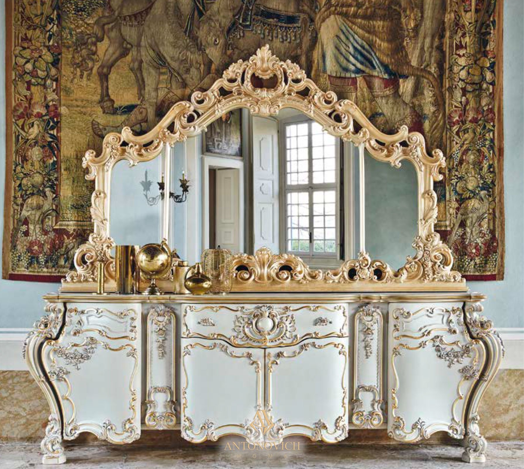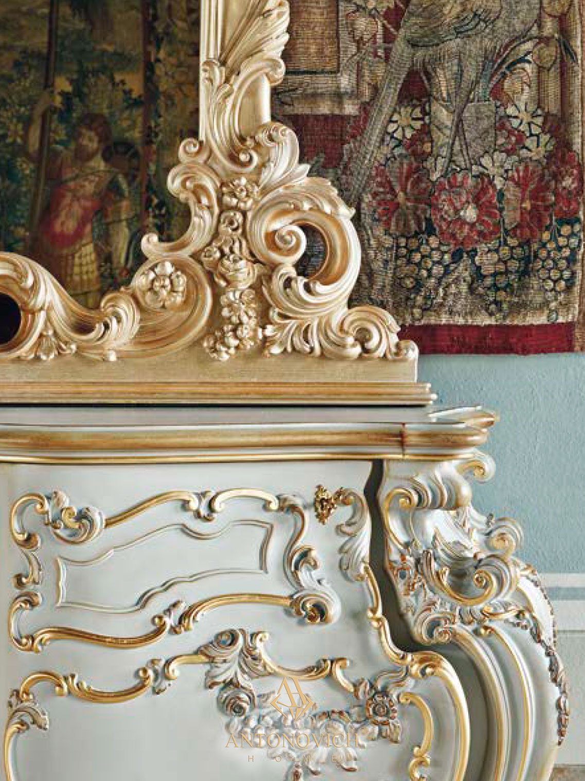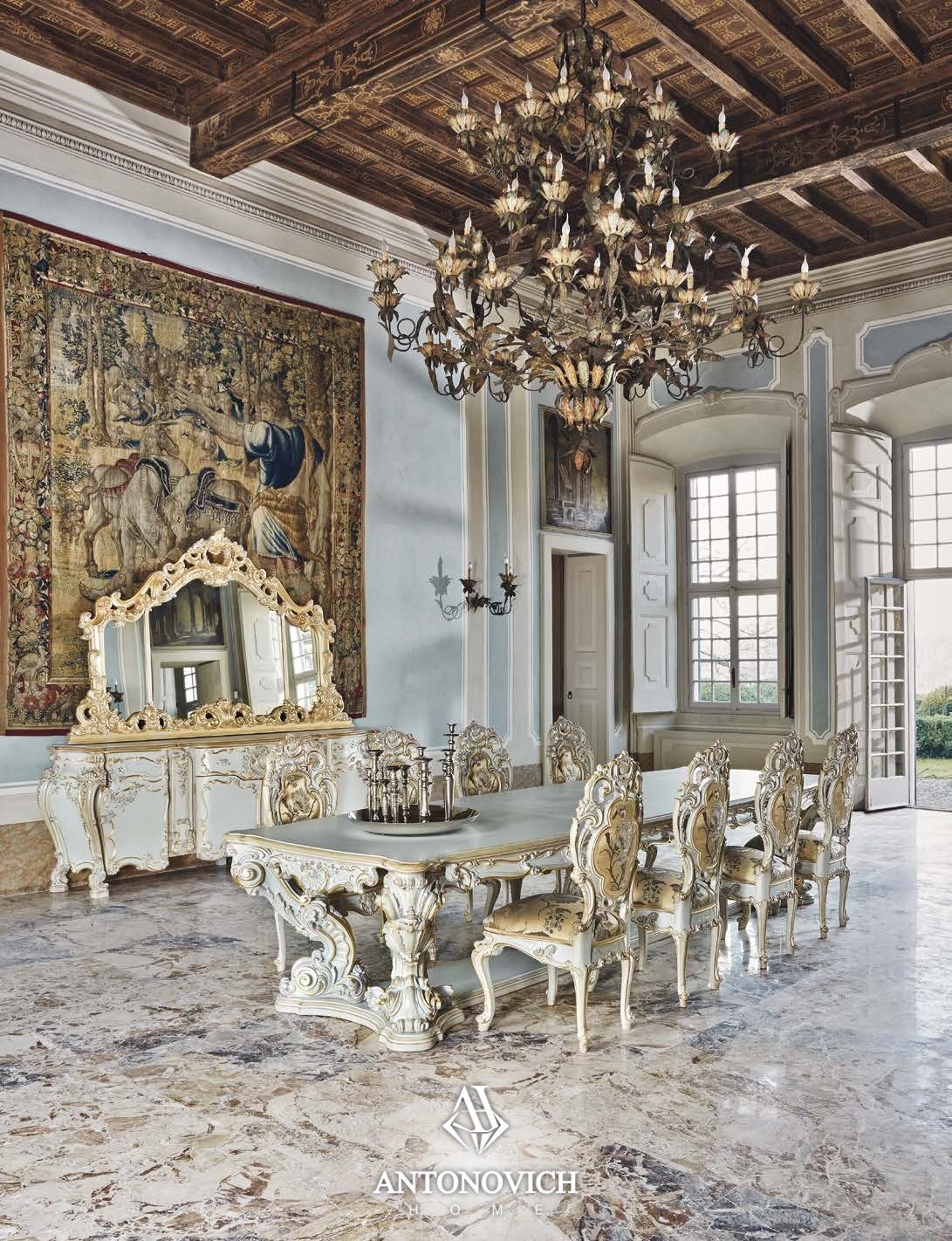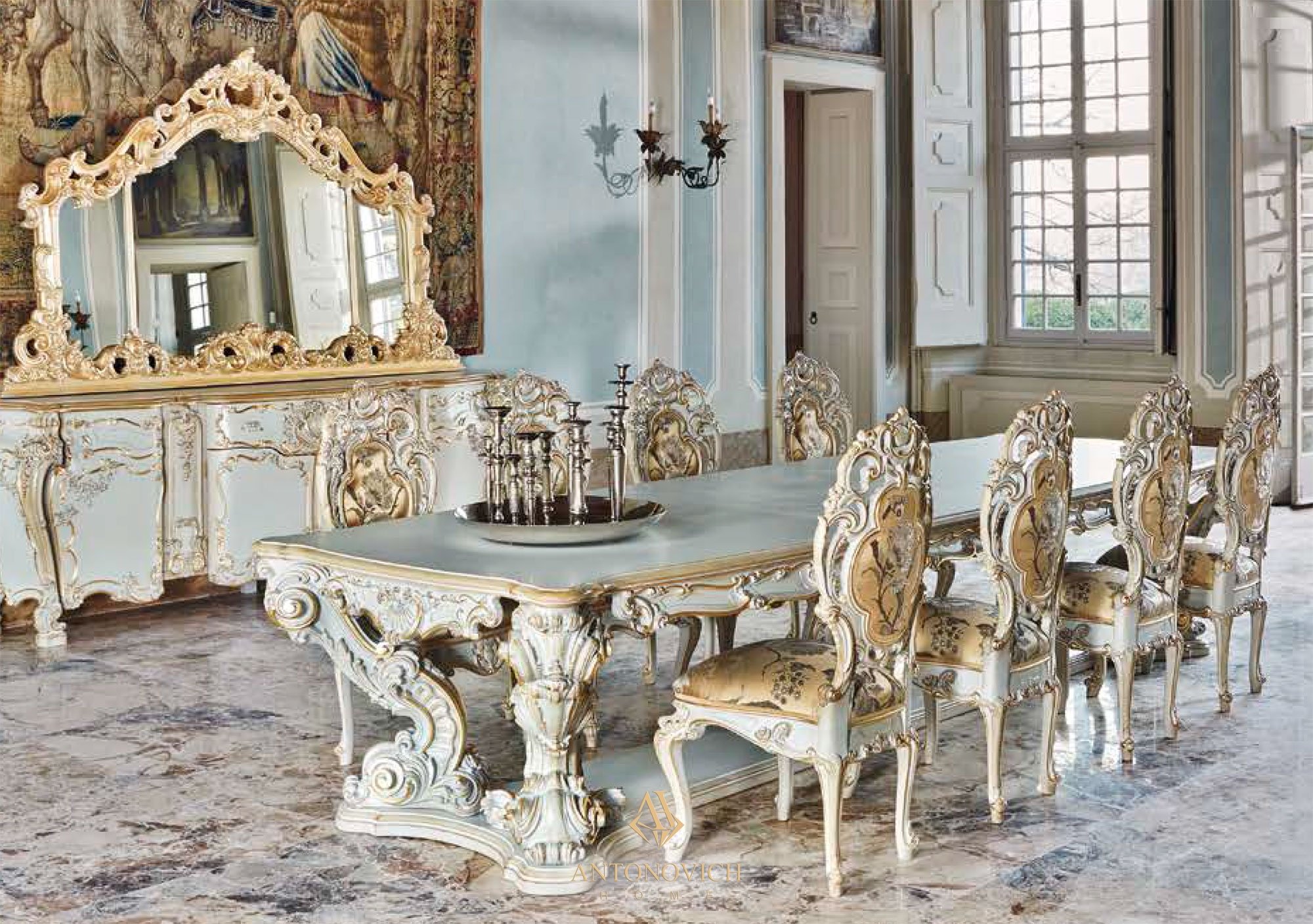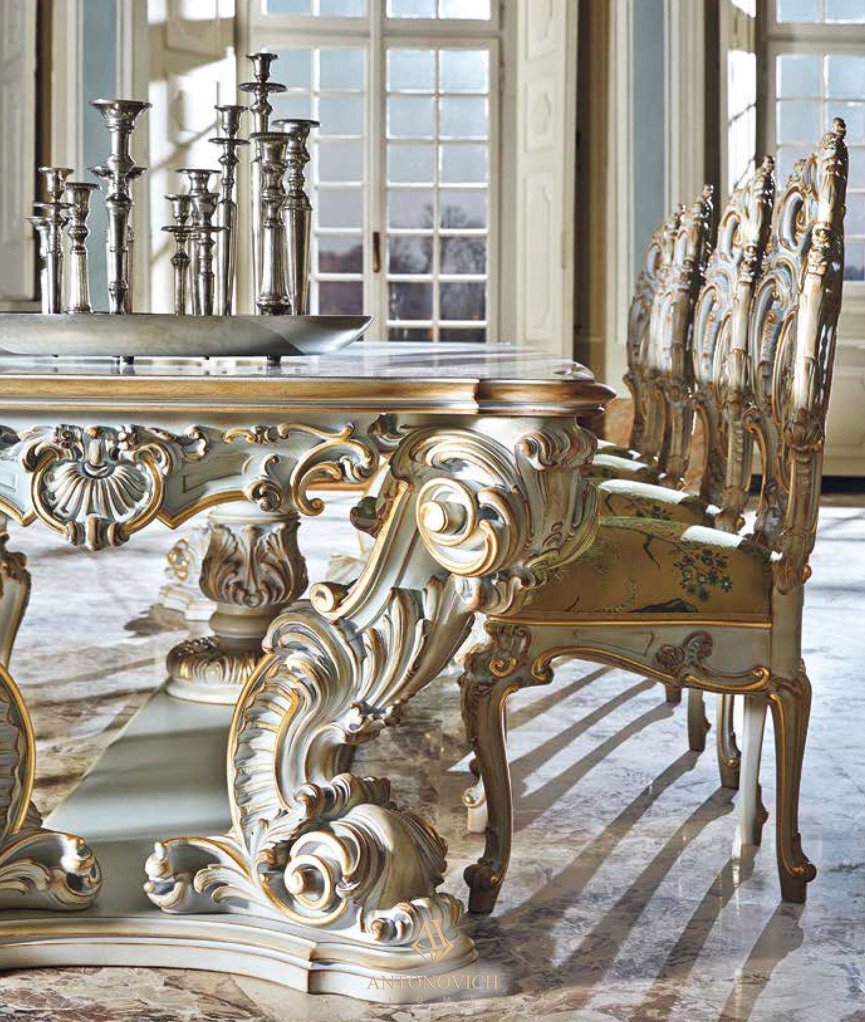 Мебель для столовой Minerva — это изящная резьба и богатое использование золотой отделки. Обилие и плотность декоративных элементов, сложные рисунки резьбы здесь таковы, что нельзя не замереть от восхищения!