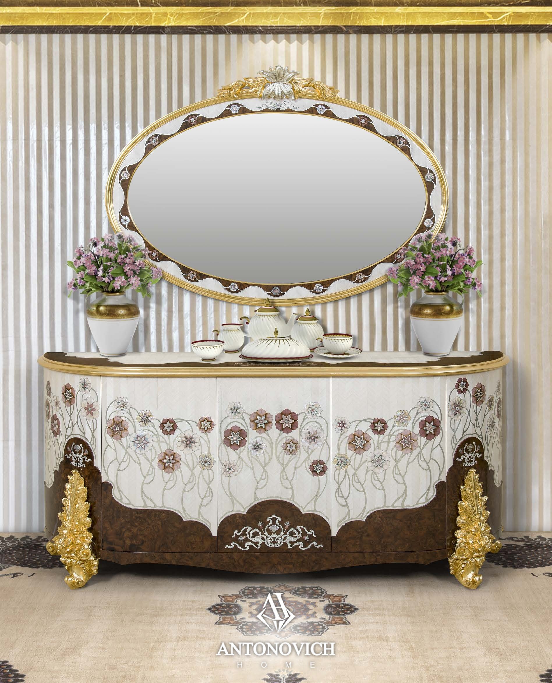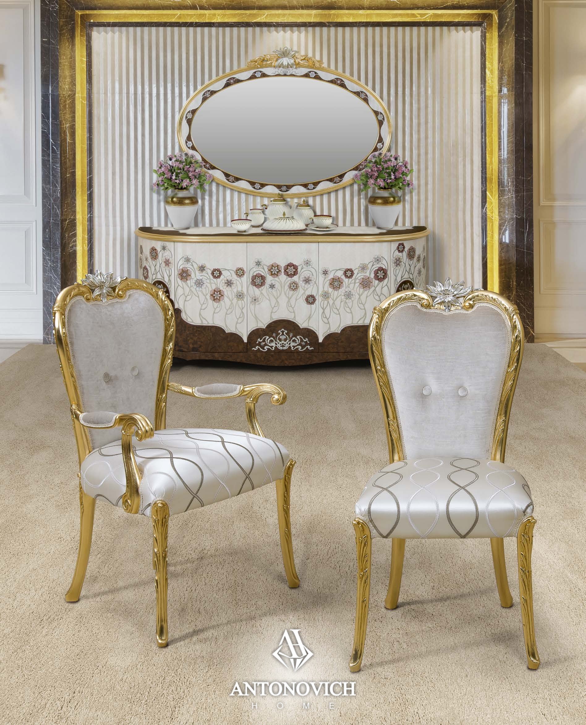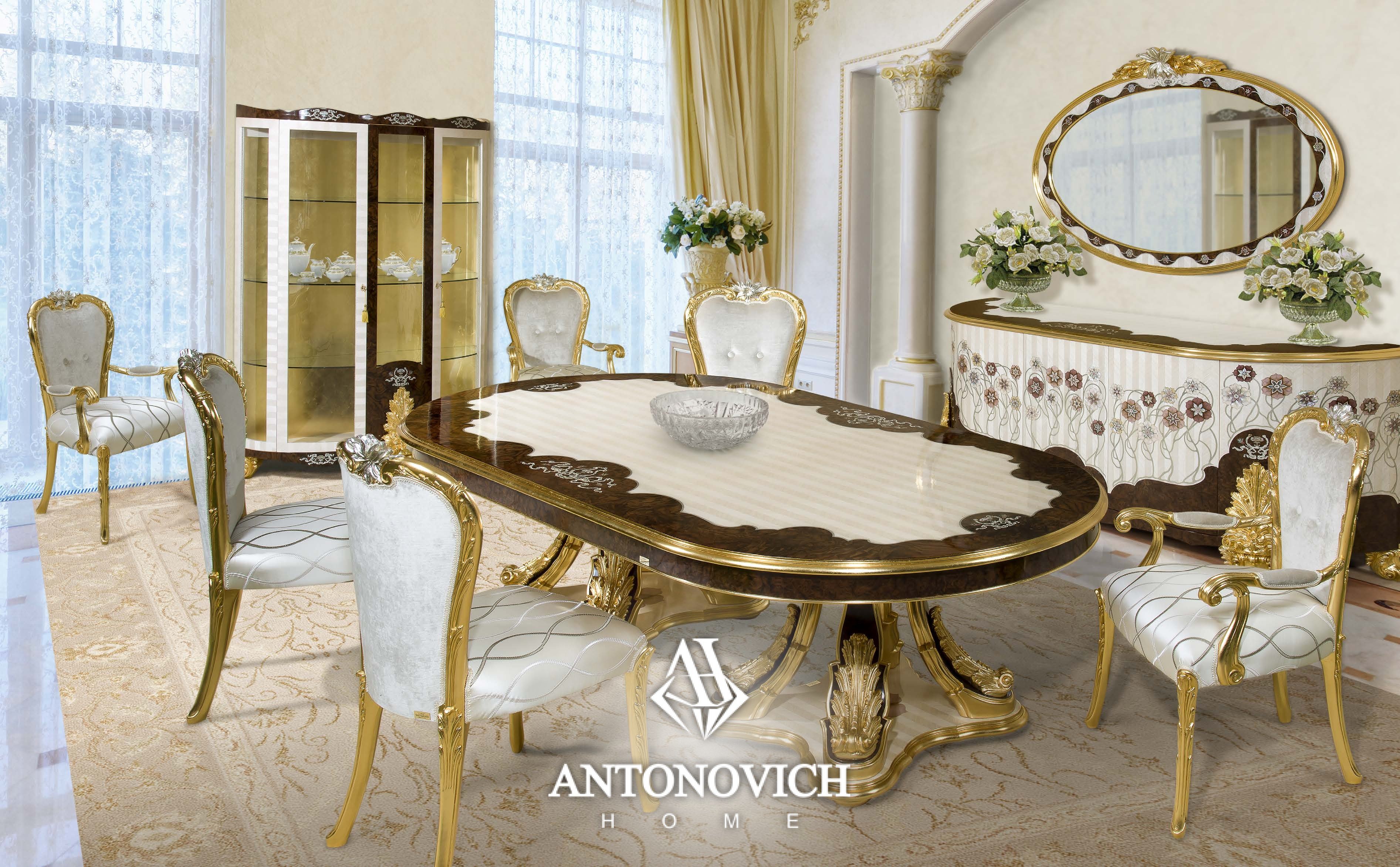 В коллекцию мебели столовой группы Lilium входят: стол, стулья, кресло, шкаф, буфет, зеркало.