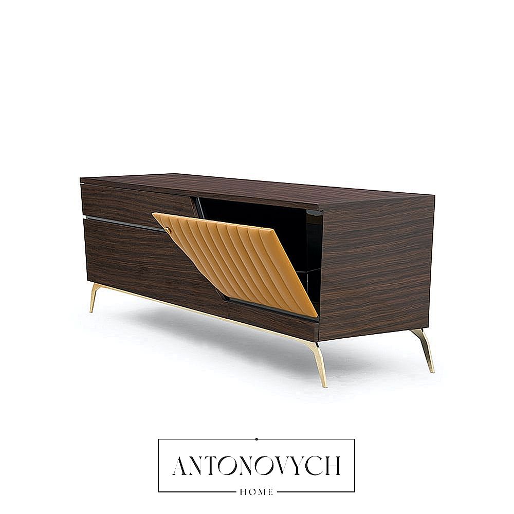 Буфет Leo: Верх и передняя сторона с отделкой глянцевым шпоном Palissandro, правая дверь с обивкой из кожи Vogue col. 6007 Бренди с вертикальной строчкой, ручка-щиток цв. Золото с кожаными вставками, металлические ножки цв. золотые глянцевые, черные матовые лакированные вставки.