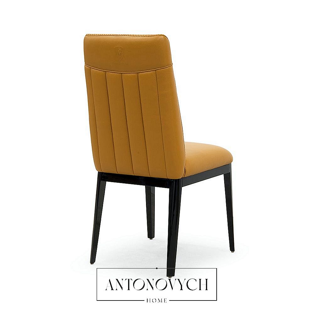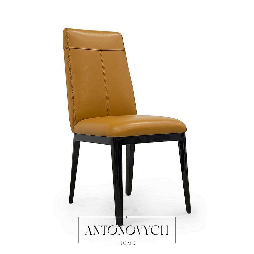 Стул Leo: В коже Vogue col. 6007 Brandy, Outback, с вертикальной строчкой и печатным логотипом в виде быка, деревянная основа и ножки, покрытые черным глянцевым лаком.