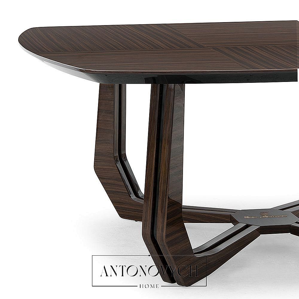 Стол Leo: Столешница из шпона Palissandro глянцевая с лакированными краями черный глянцевый, ножки из шпона Palissandro глянцевый и лакированные вставки черный глянцевый, с ленивой Susan из шпона Palissandro глянцевый, металлический логотип цв. золотой и черный щит.