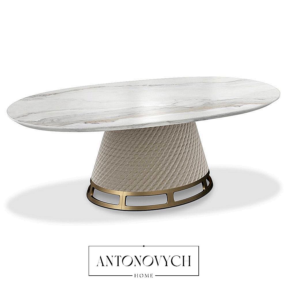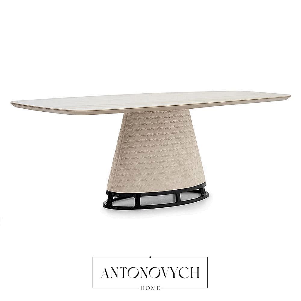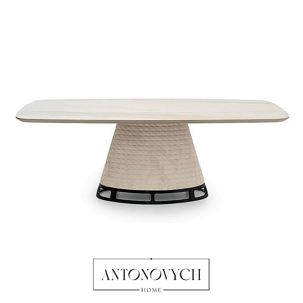 Прямоугольный, овальный обеденный стол TL-2830 со столешницей из керамического мрамора, конусообразным основанием, обитым стеганой технозамшей, основанием уникальной формы с металлической отделкой.