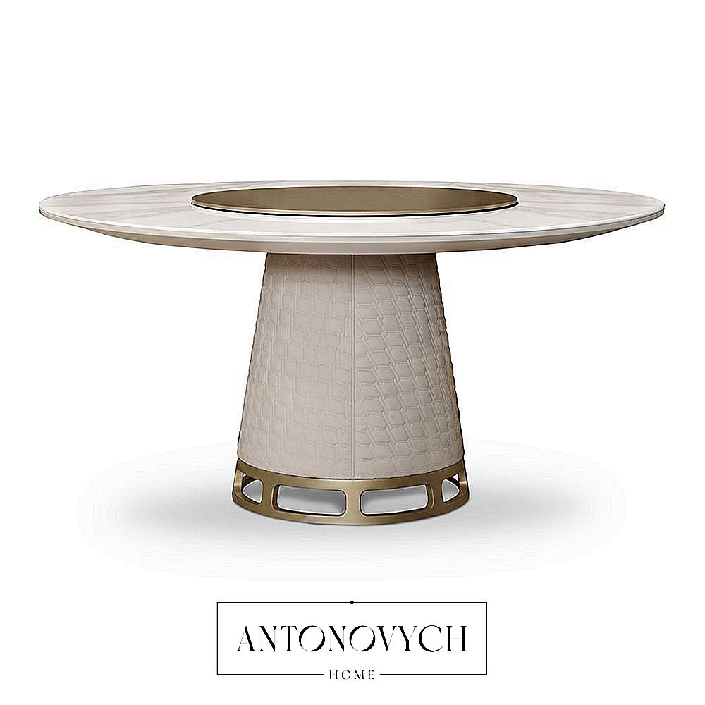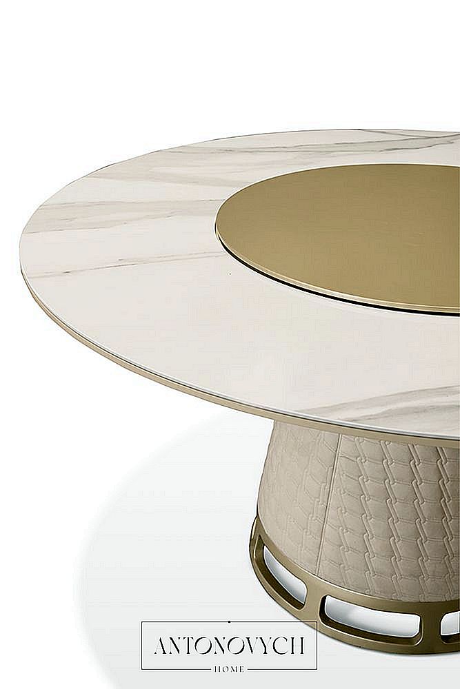 Круглый обеденный стол TL-2830 со столешницей из керамического мрамора, разделенной на две части, конусообразным основанием, обитым стеганой технозамшей, основанием уникальной формы и ленивой сюзаной с металлической отделкой.