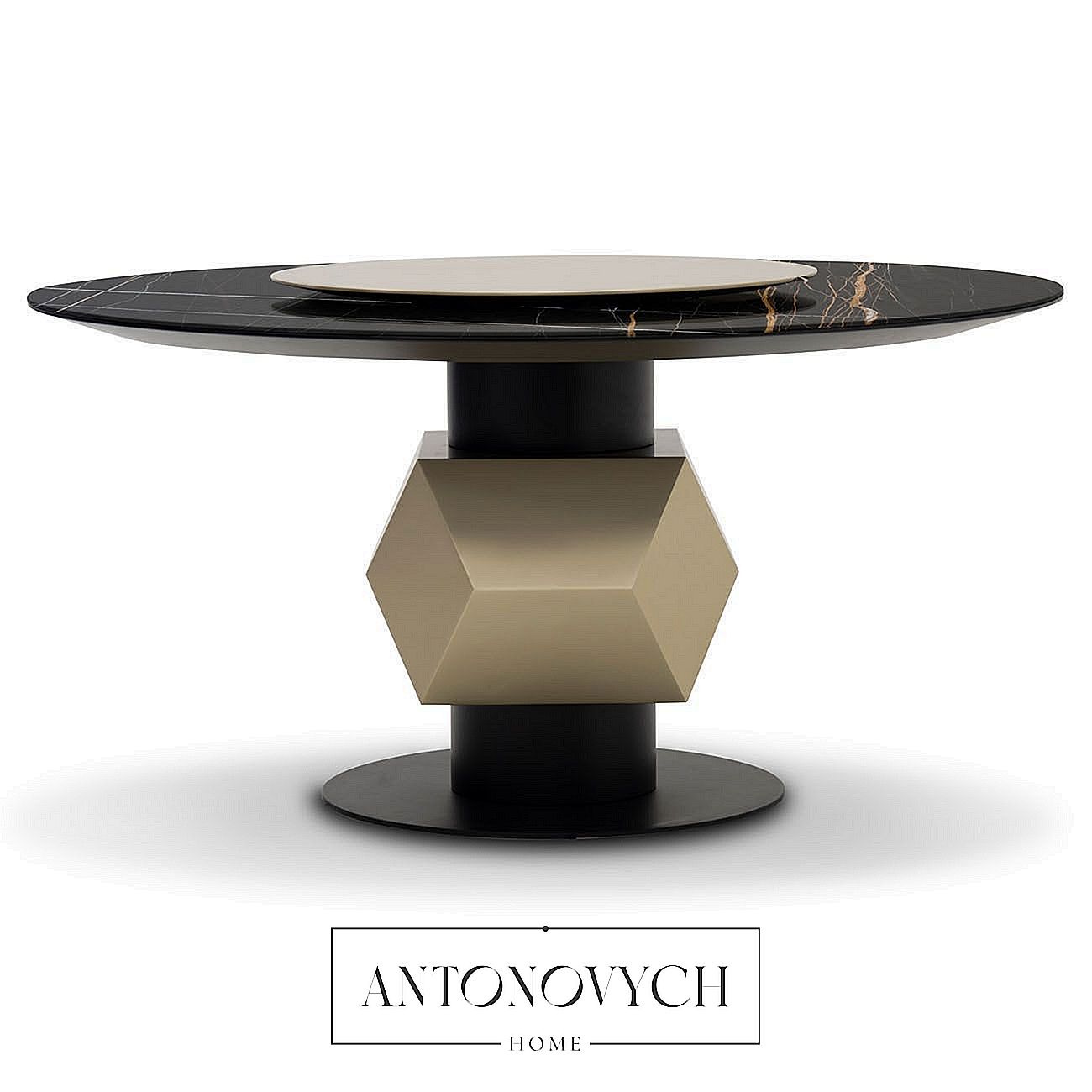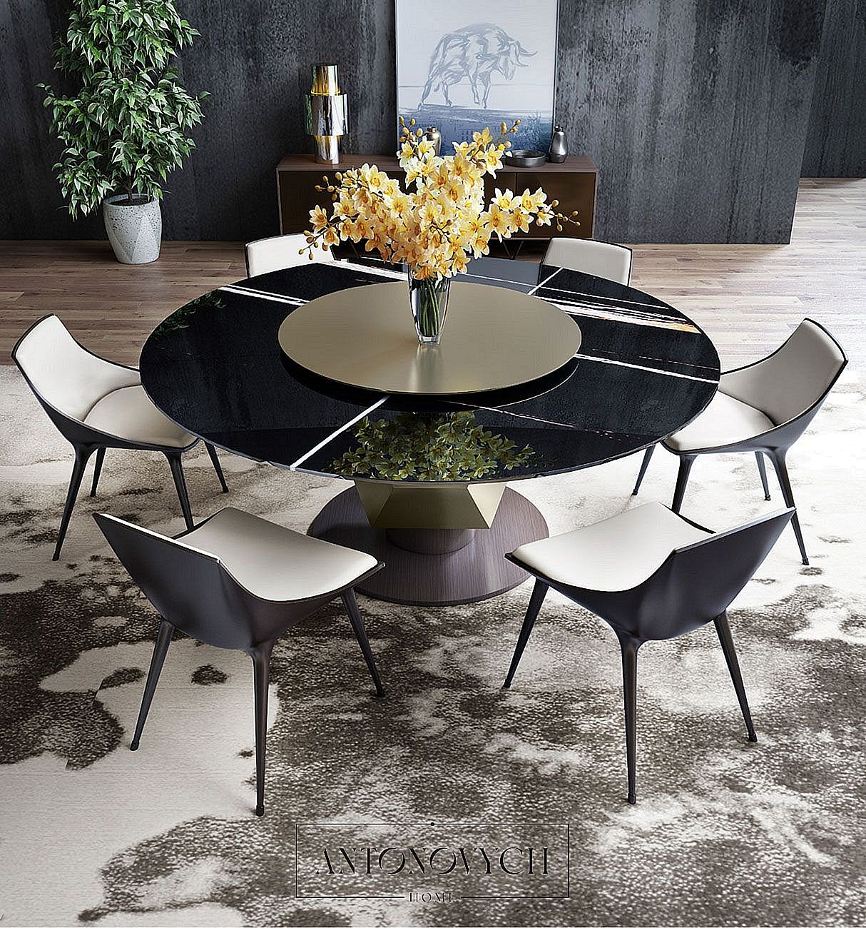 Круглый обеденный стол TL-2920 с алмазной вставкой. Столешница из керамического мрамора разделена на две части, ромбовидная вставка и ленивая сузан с металлической отделкой, опорная плита и ножка покрыты матовым лаком.