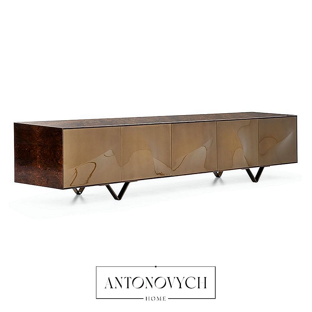 Тумба под телевизор TL-2855, боковые стороны и верх из уникального шпона, рельефные дверные панели с металлической отделкой, металлическое основание.