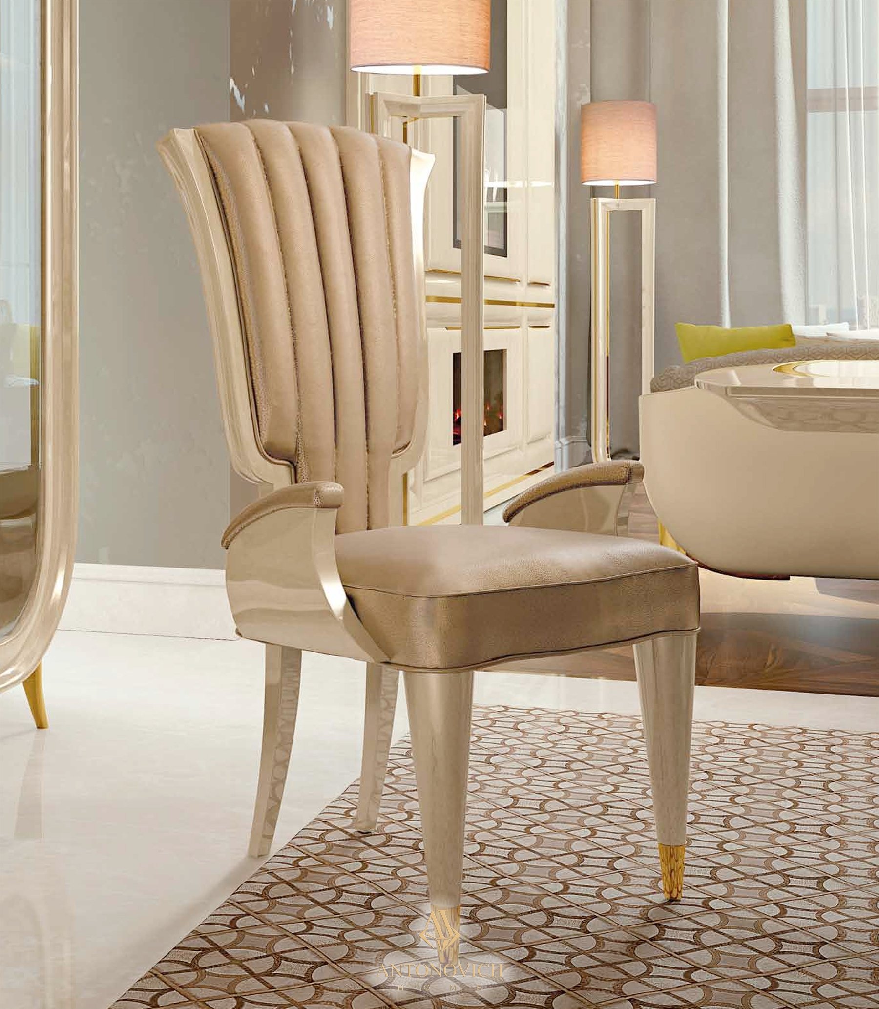 Детали подчёркивают совершенство лакировки дерева и богатство тканей; стул Trilogy, как и вся коллекция, основывается на стилистических особенностях Ар Деко, предложенного на настоящий день в новом варианте, и на высоком уровне элегантности и изысканности.