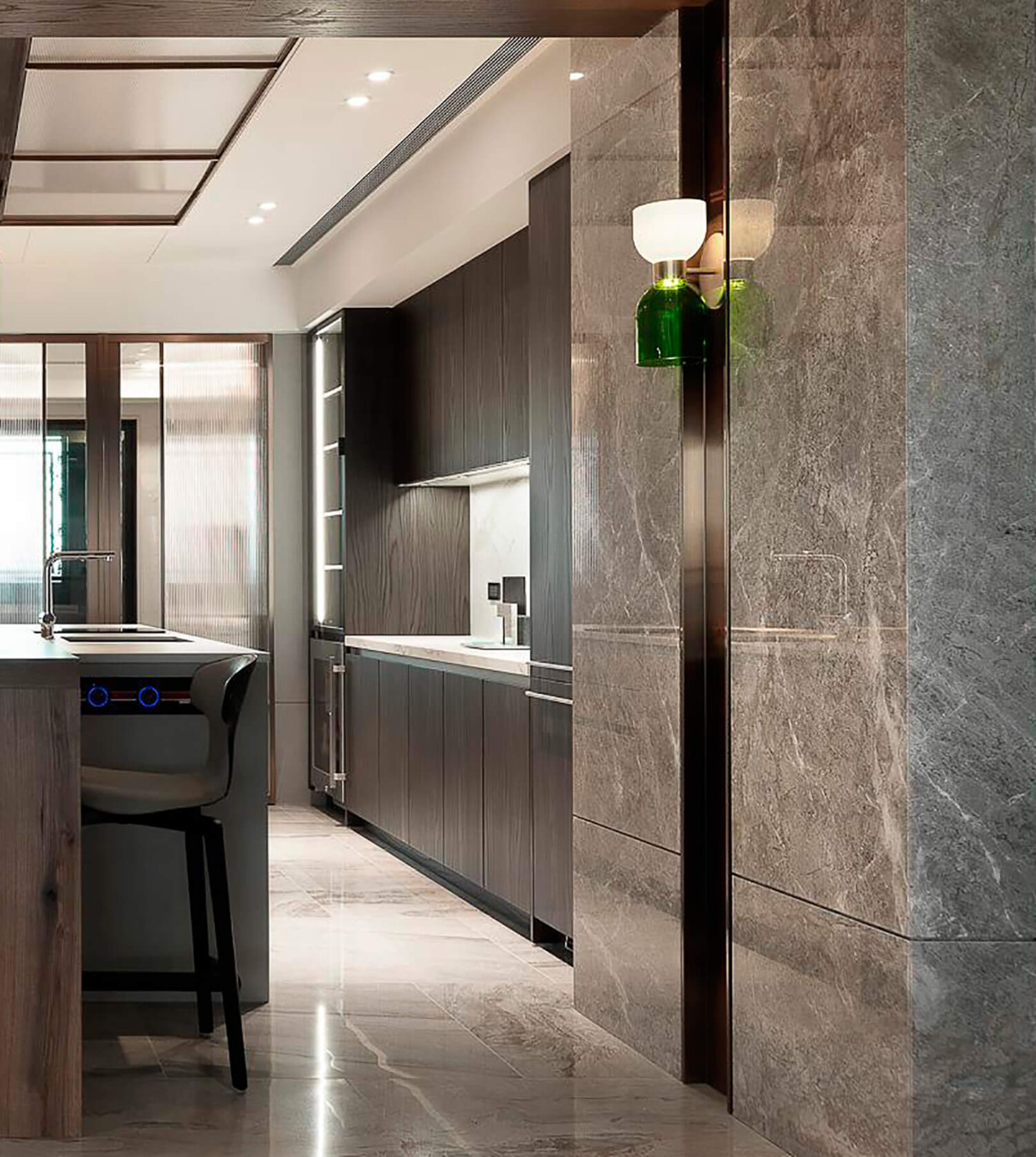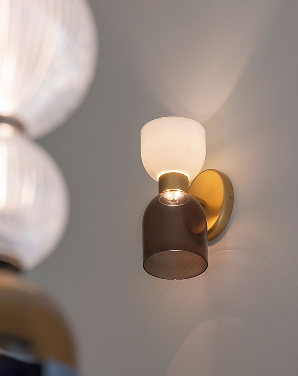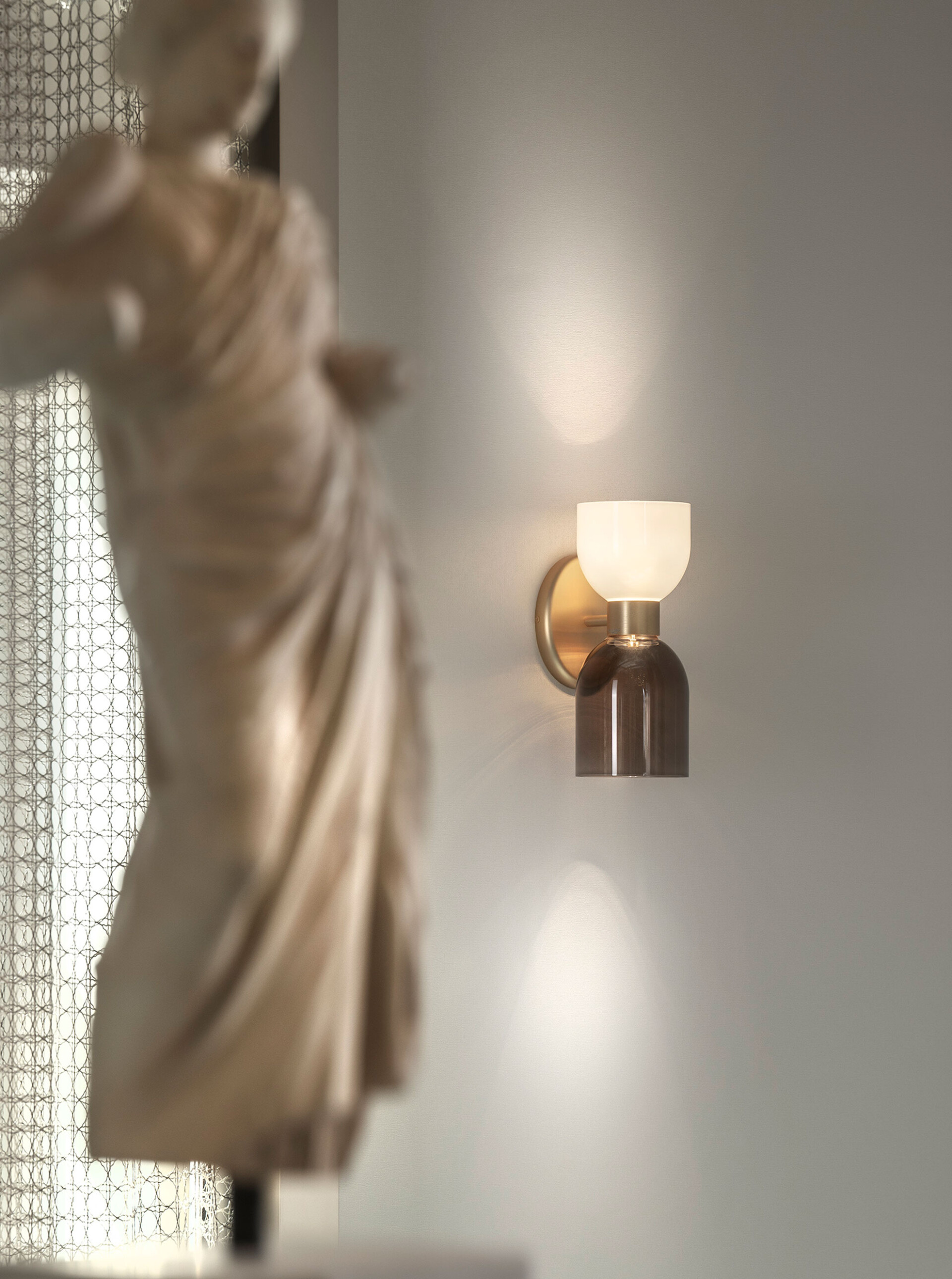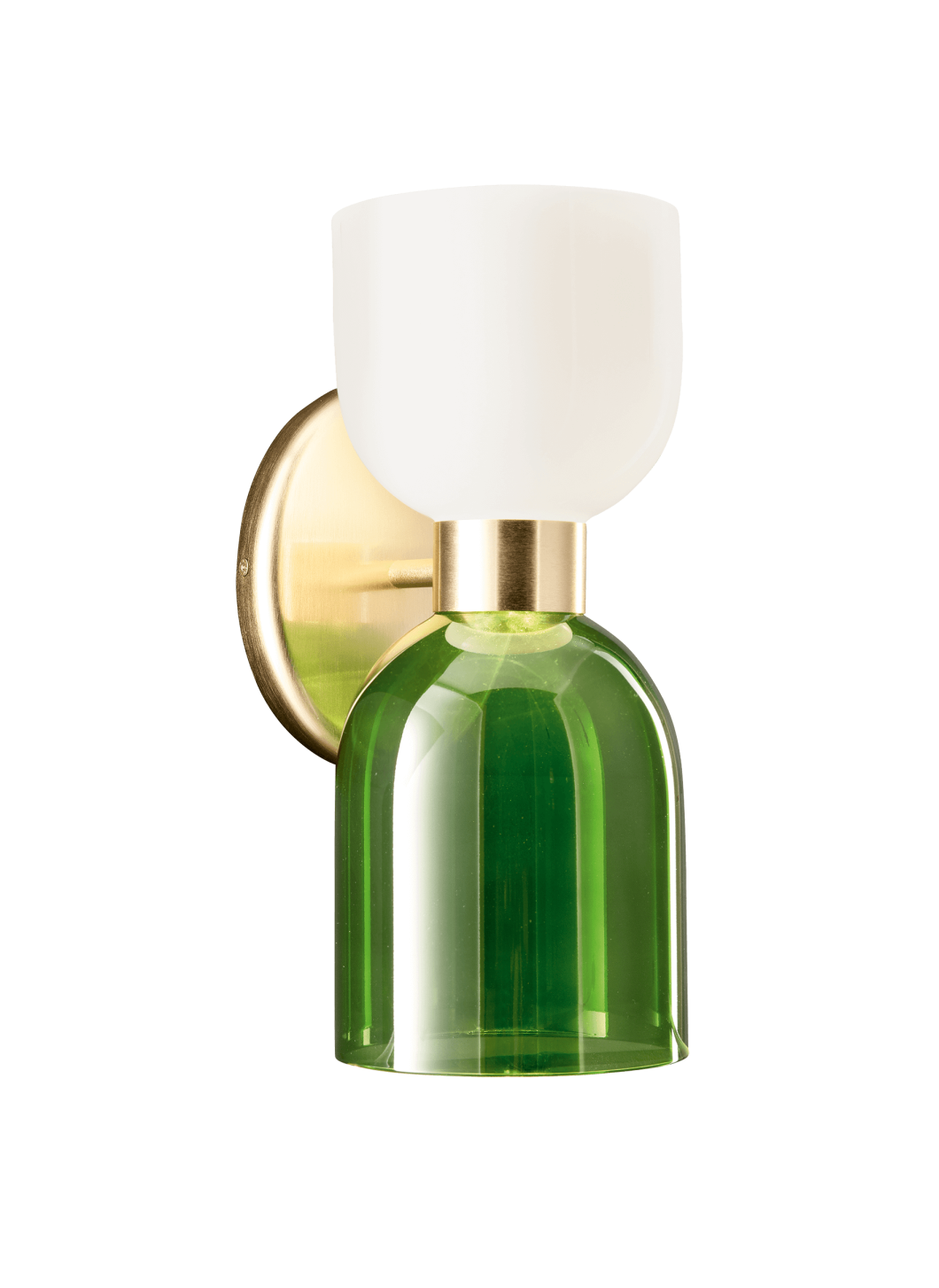 Настенный светильник из металла с отделкой из матового золота с рассеивателями из белого и зеленого или белого и агатового стекла.