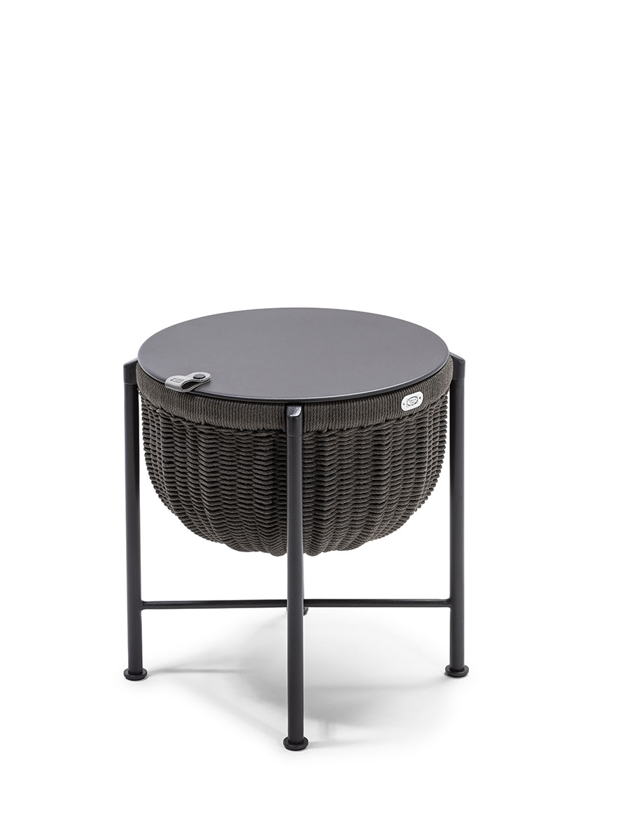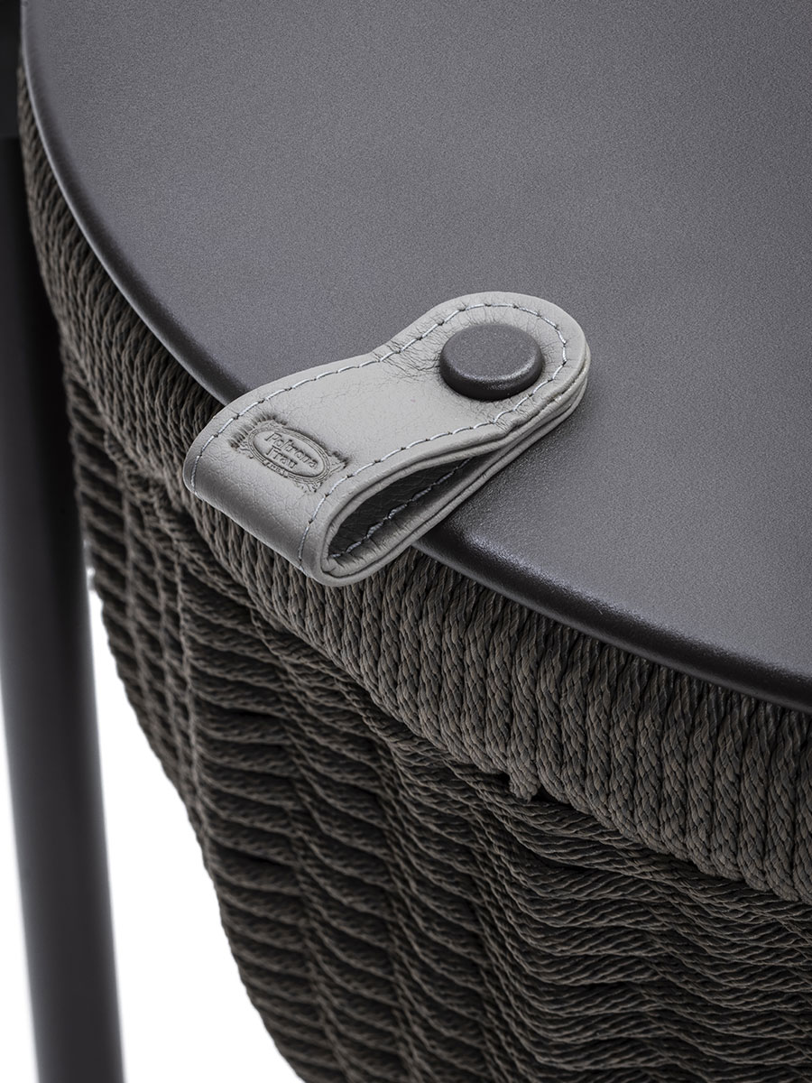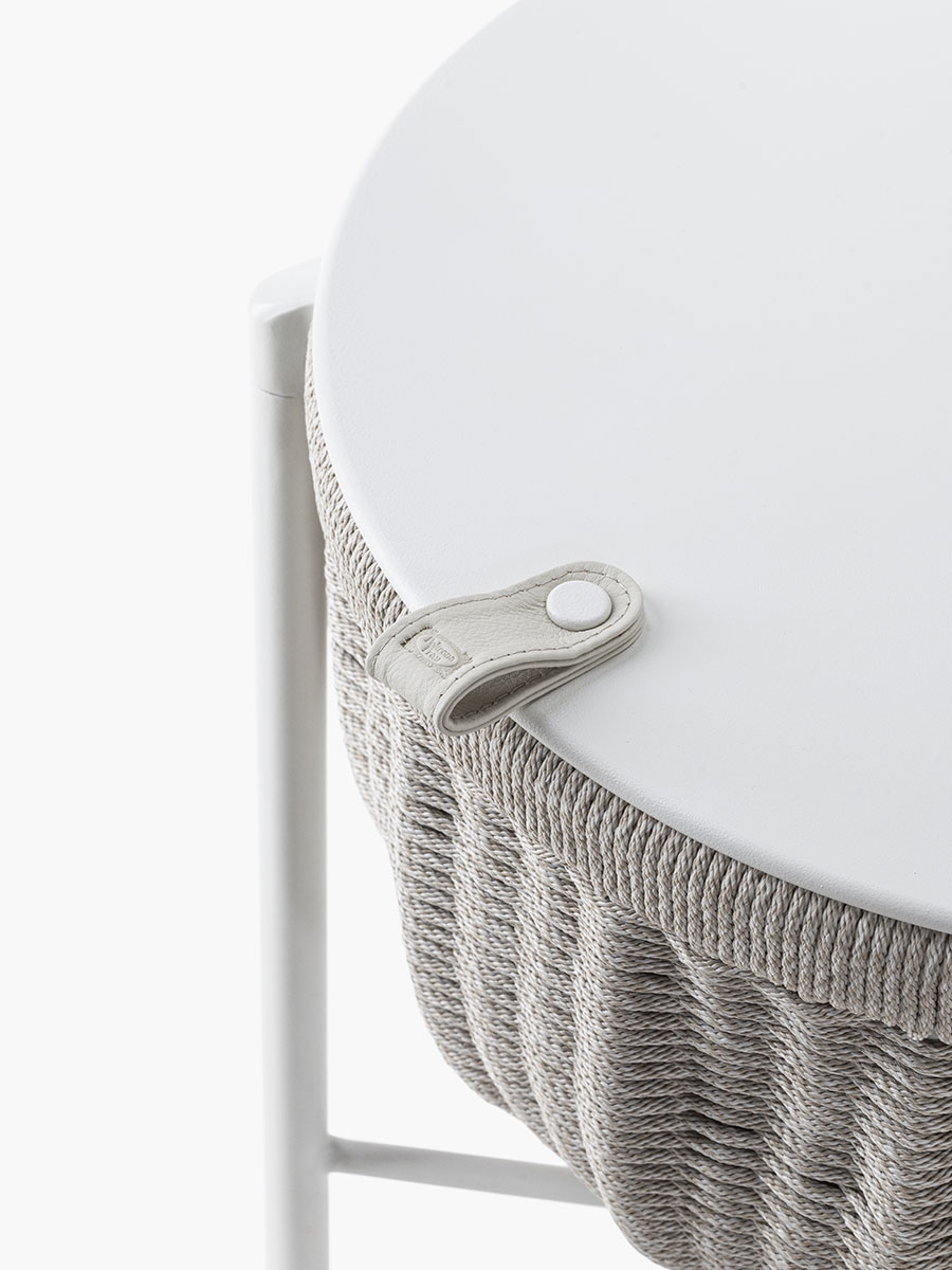 Корзины-контейнеры имеют алюминиевый каркас с порошковым покрытием. Корзины-контейнеры можно дополнить двумя дополнительными аксессуарами: крышкой для размещения предметов и холодильником для хранения и охлаждения бутылок. Крышка изготовлена из алюминия с порошковым покрытием, а язычок обтянут кожей Pelle Frau® Outdoor в тон каркасу. Версия с холодильником изготовлена из тисненого термоформованного АБС-пластика. Плетеная веревка доступна в вариантах отделки, соответствующих каркасу.