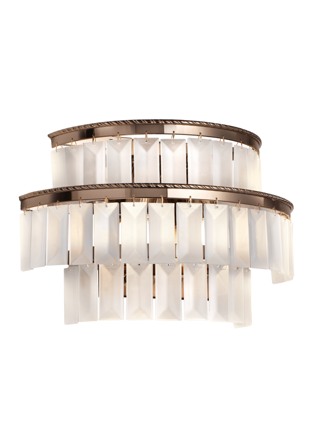 Настенный светильник из металла с отделкой из золотистого никеля, элементами из сатинированного стекла и кожаными деталями.