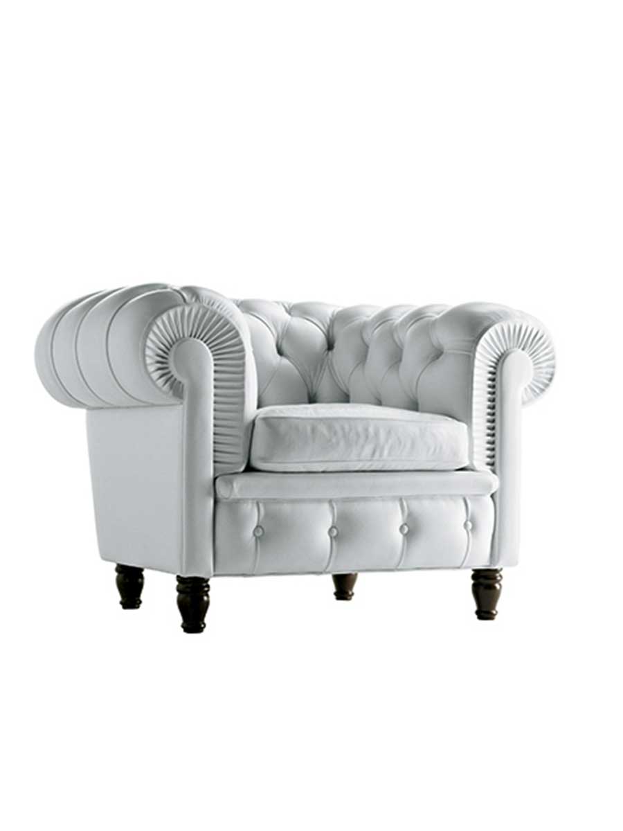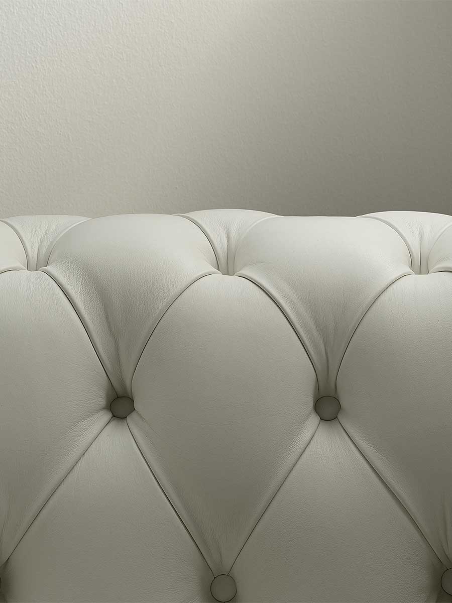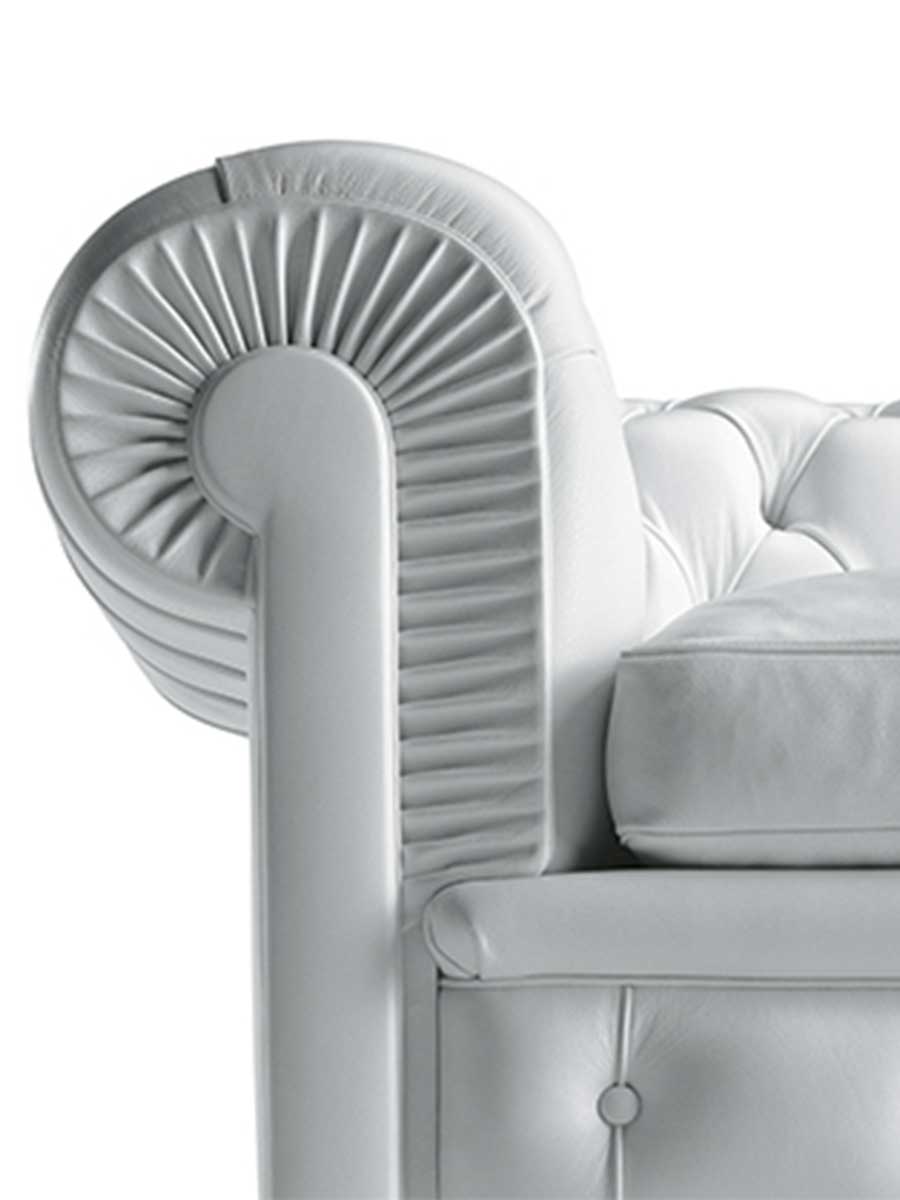 Кресло Chester оснащено подвесной системой из двухконусных стальных пружин, установленных вручную и закрепленных на джутовых ремнях на каркасе из выдержанного бука. Обивка сиденья выполнена из прорезиненного конского волоса, а спинка и подлокотники – из обработанного вручную конского волоса растительного происхождения. Подушки сиденья наполнены гусиным пухом. Ножки могут быть круглыми или высокими, из бука, окрашенного в тёмный орех, или из бука, покрытого чёрным лаком. Они также доступны в деревянном исполнении с кожаной обивкой. Обивка кресла Chester доступна в цвете Pelle Frau®.