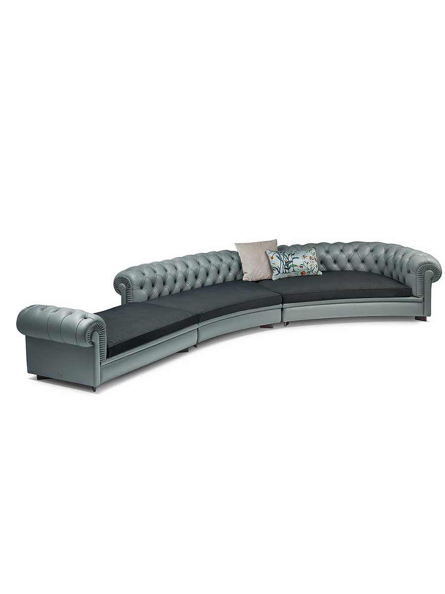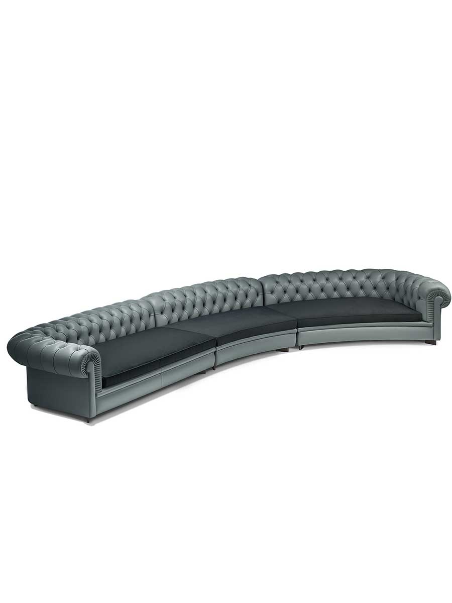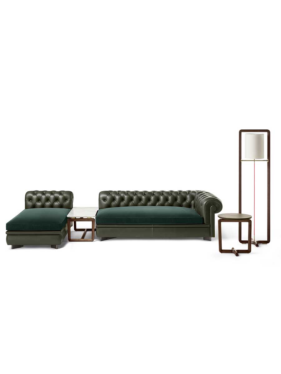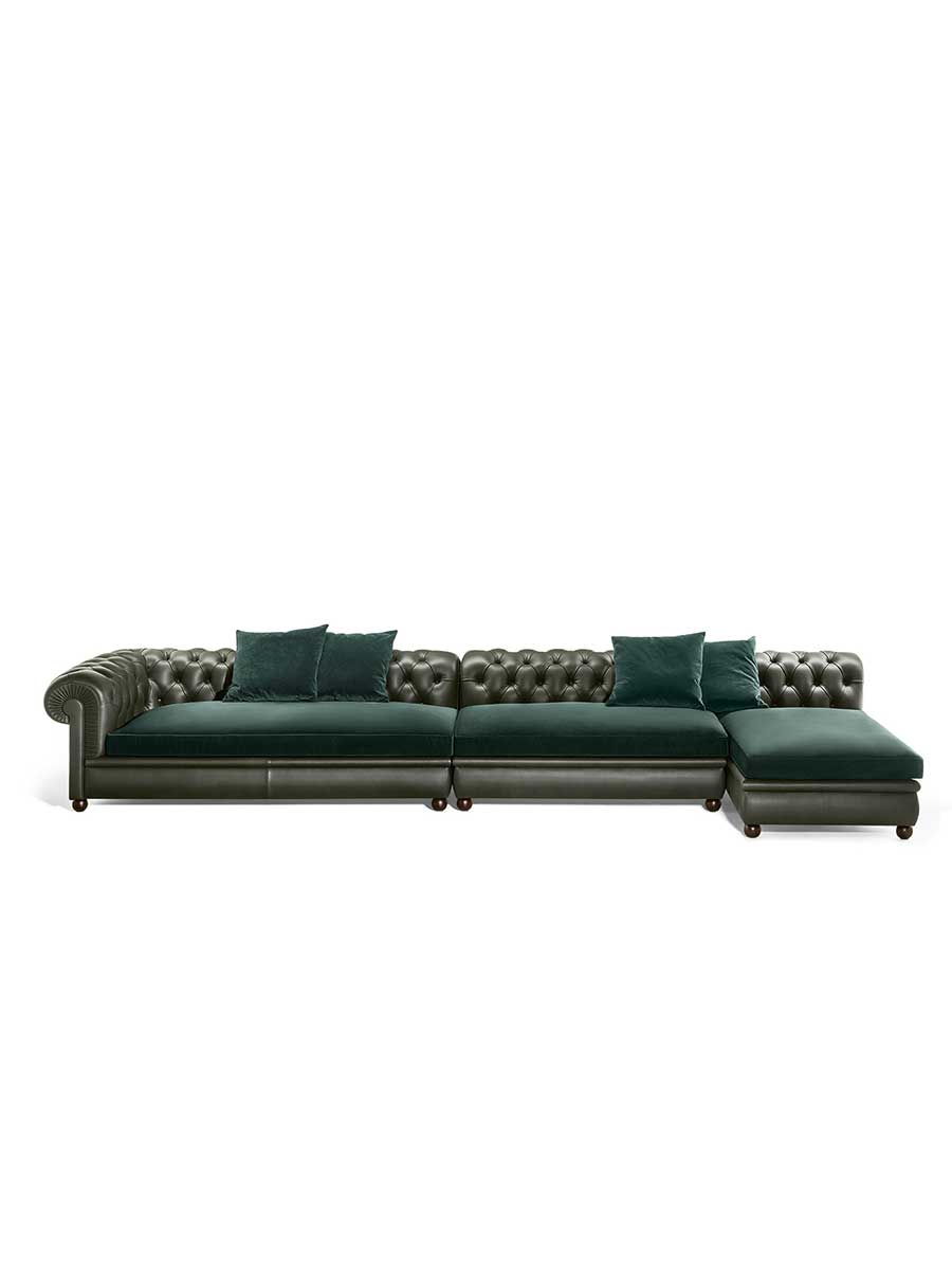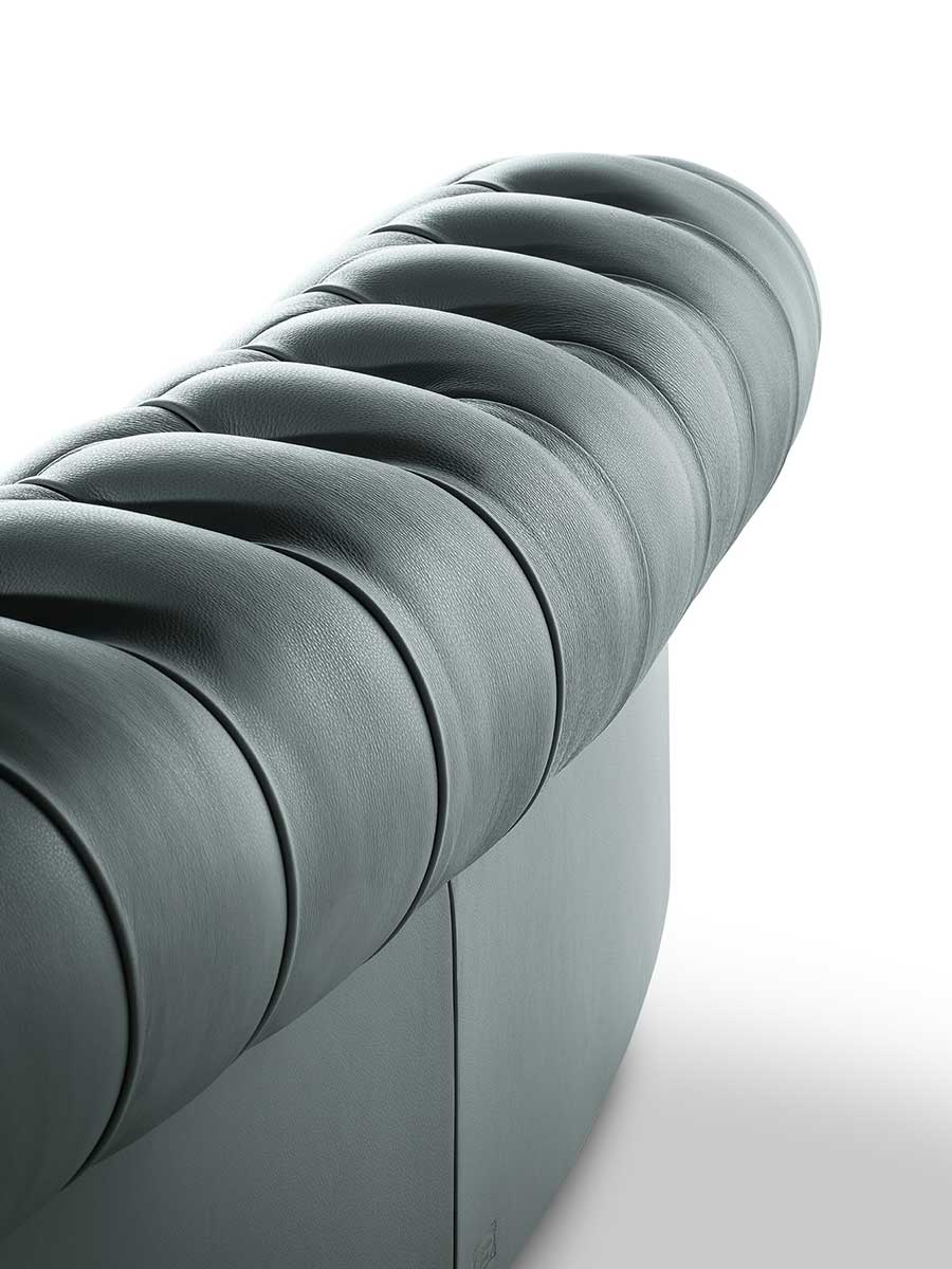Каркас дивана Chester Line изготовлен из массива выдержанного бука. Подвеска сиденья, спинки и подлокотников выполнена на двухконусных пружинах ручной сборки, опирающихся на джутовые ремни. Наполнитель спинки и подлокотников – конский волос растительного происхождения, сформированный вручную. Подушки сиденья набиты гусиным пухом с дополнительной стабилизирующей вставкой из пенополиуретана. Обивка выполнена из материала Pelle Frau®, который можно комбинировать с тканями Poltrona Frau в различных сочетаниях. Ножки доступны в различных размерах и отделках.