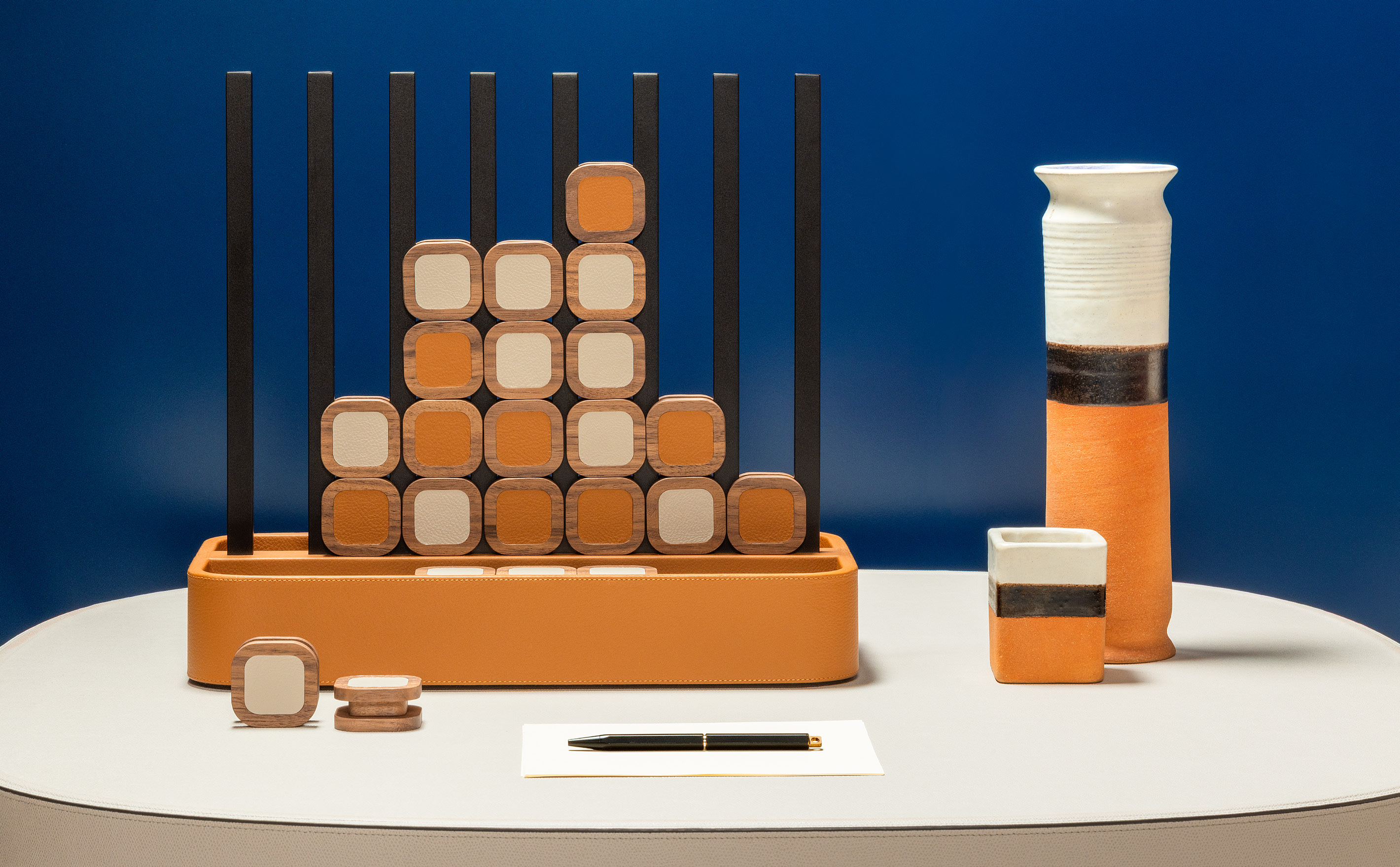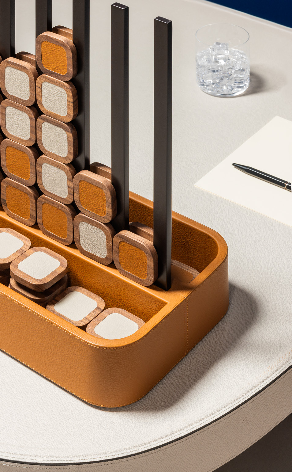 Основание, покрытое кожей, с ячейками для размещения игровых элементов из орехового дерева с кожаными вставками. Детали из брашированной бронзы с эффектом патинирования подчёркивают выразительность дизайна.