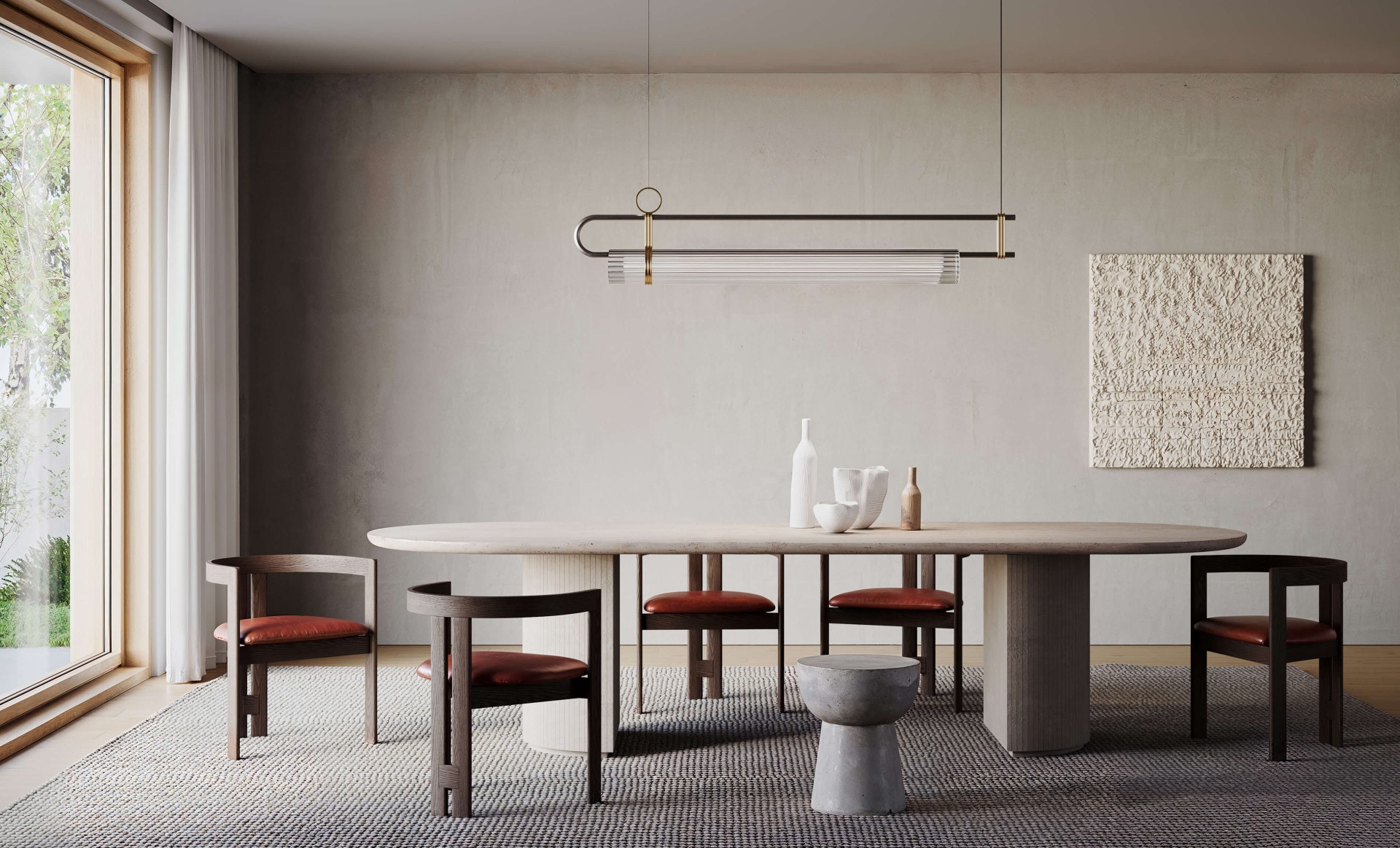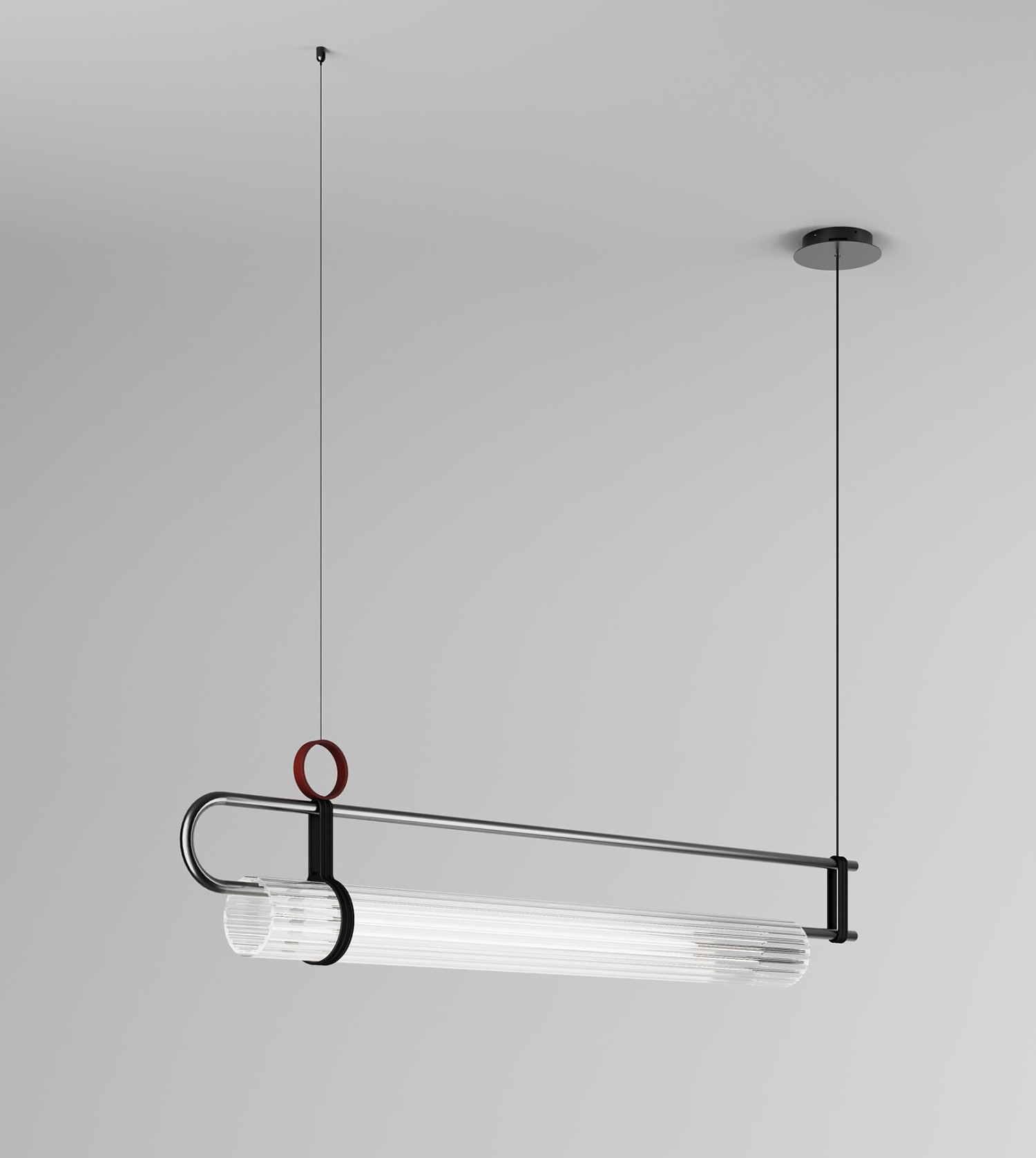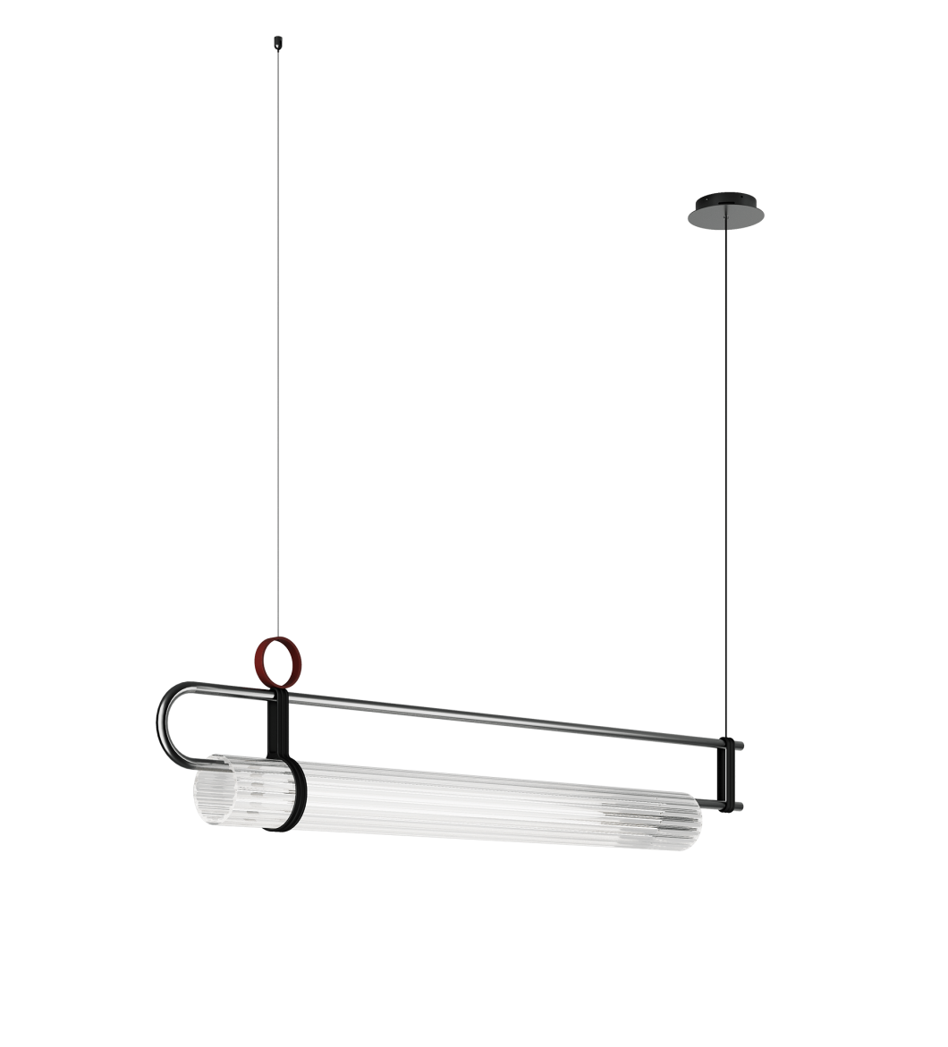 Подвесной светильник с металлической структурой цвета «железный серый» и матового светло-золотистого цвета или цвета «железный серый» с матово-черными и оксидно-красными деталями. Рассеиватель из прозрачного ребристого стекла.