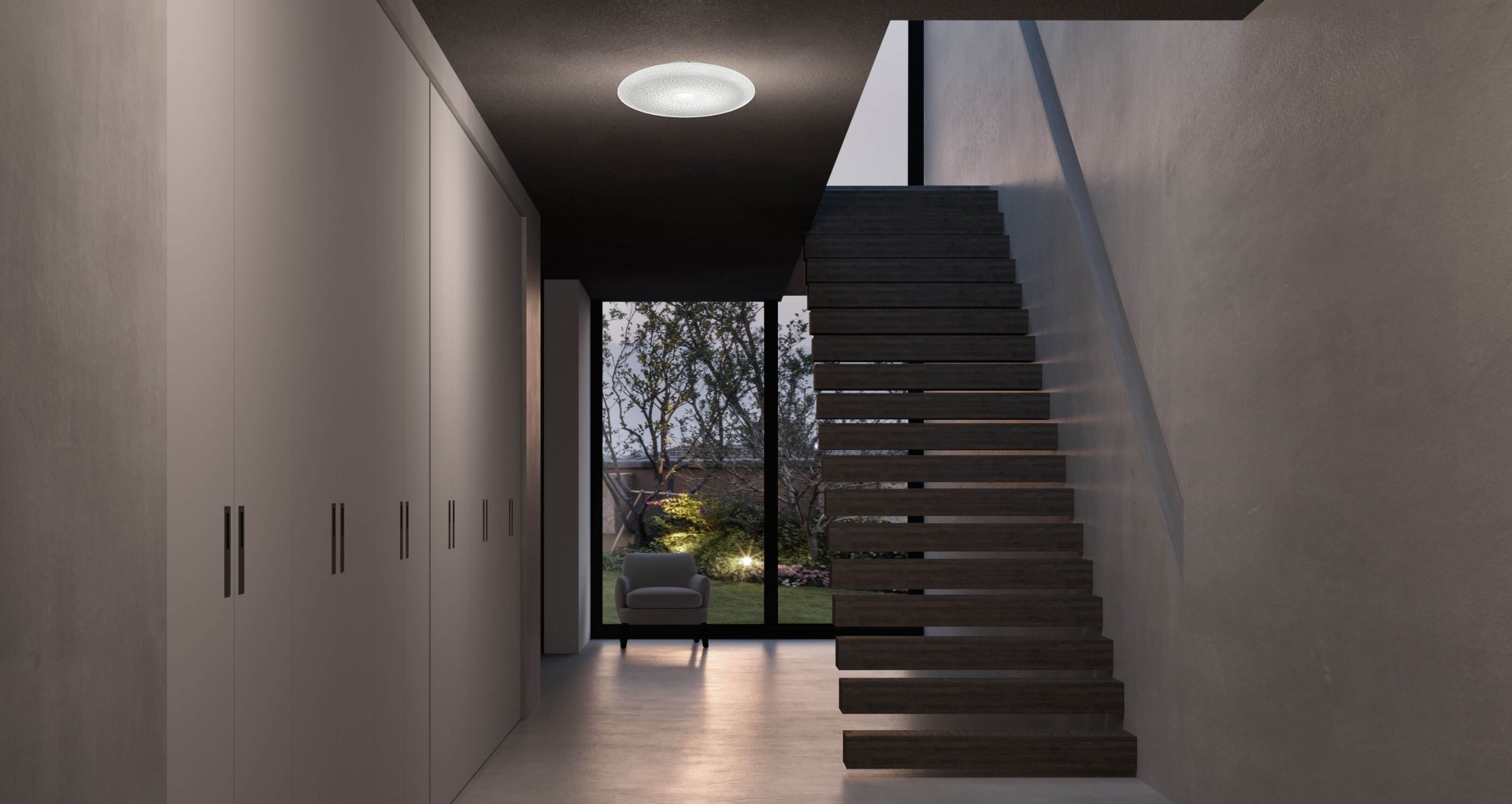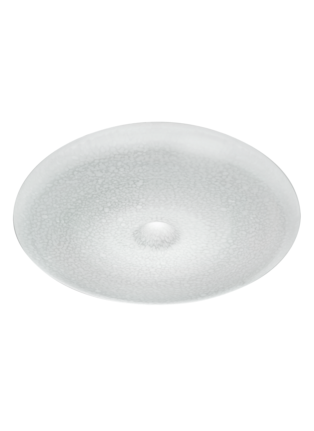 Потолочный светильник из выдувного художественного стекла с пористой поверхностью. Металлическая конструкция с белой отделкой.