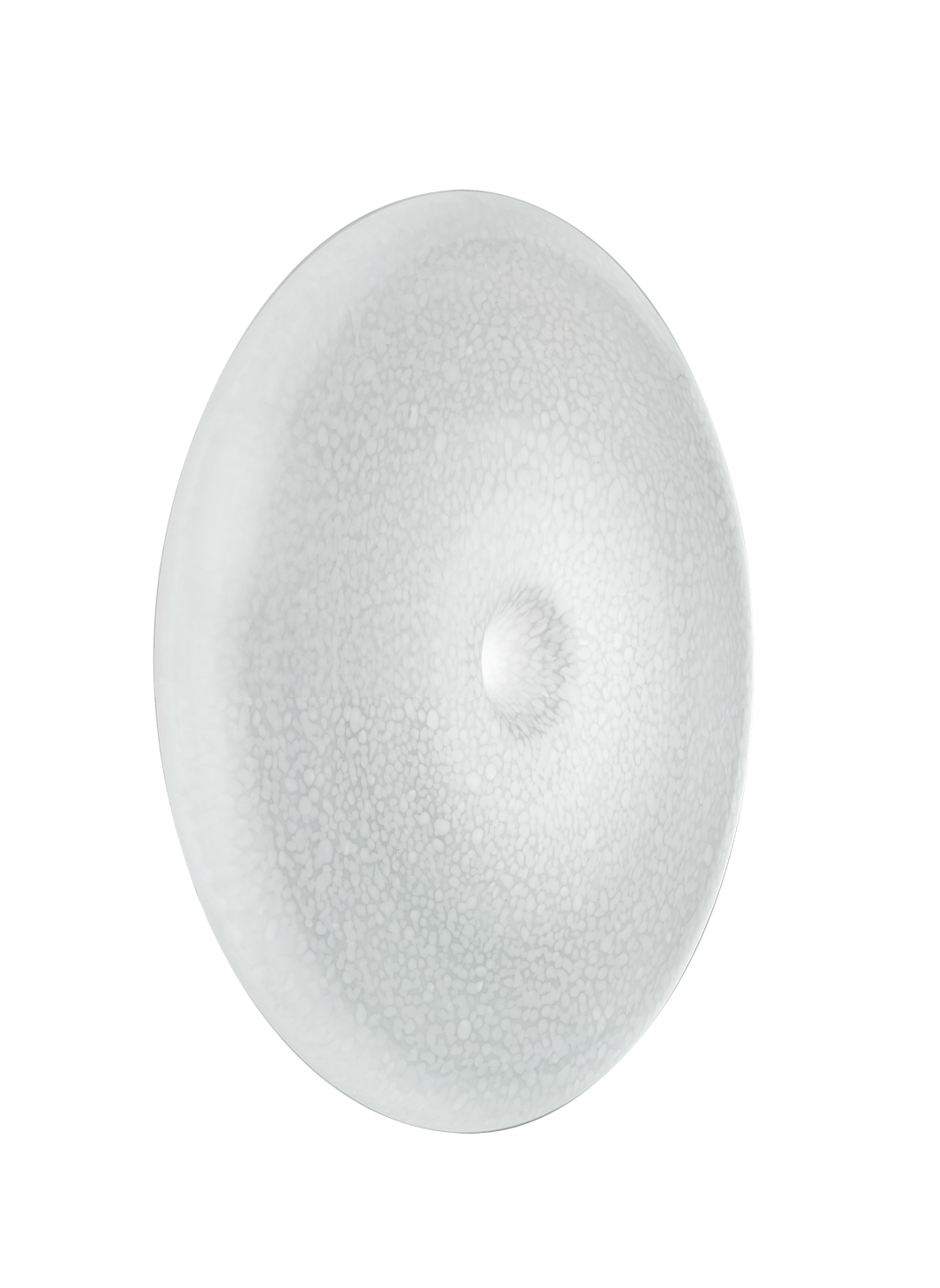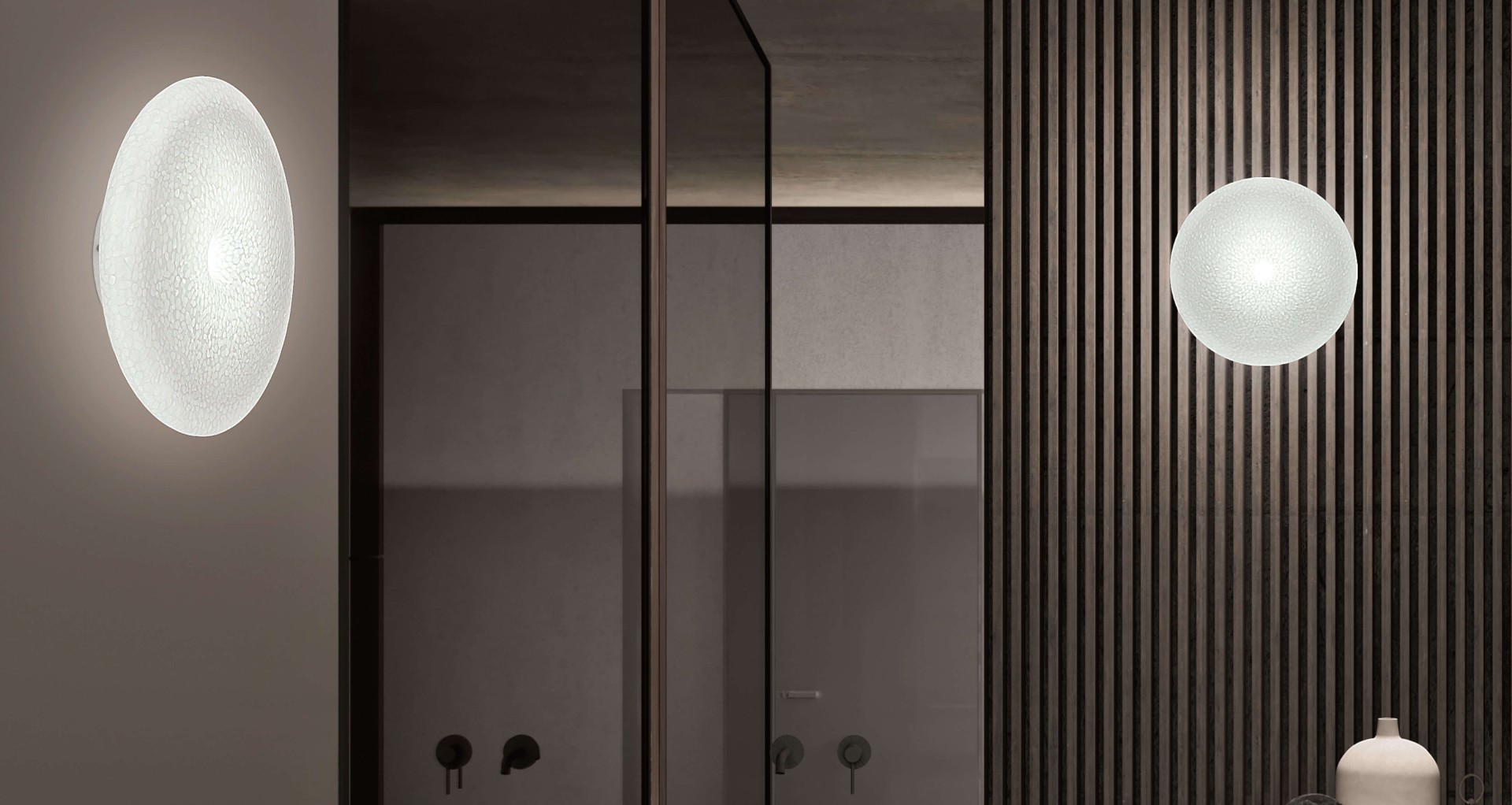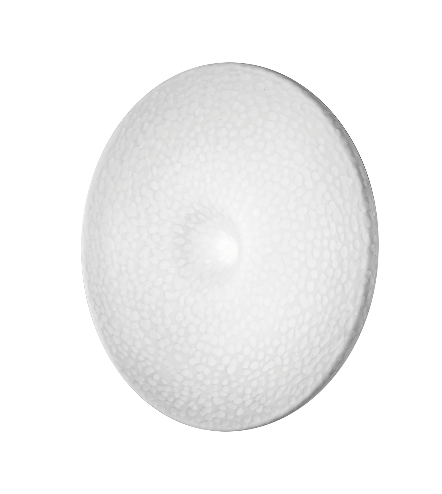 Настенный светильник из выдувного стекла с пористой поверхностью. Металлический каркас с белой отделкой.