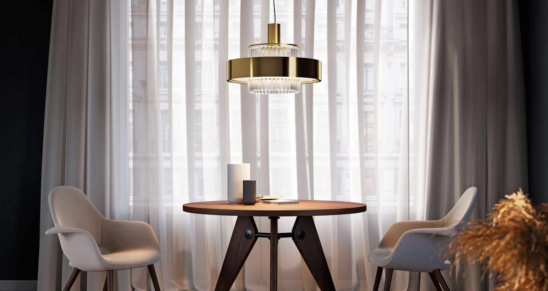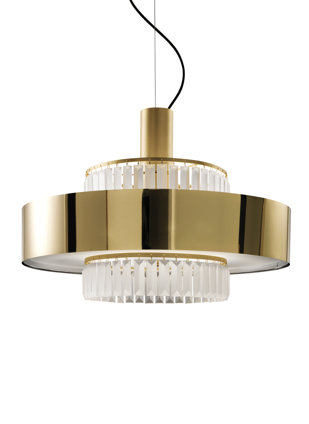 Подвесной светильник с металлической структурой цвета сатинированного золота или хрома, абажуром из золота или хрома и подвесками из травленого стекла.
