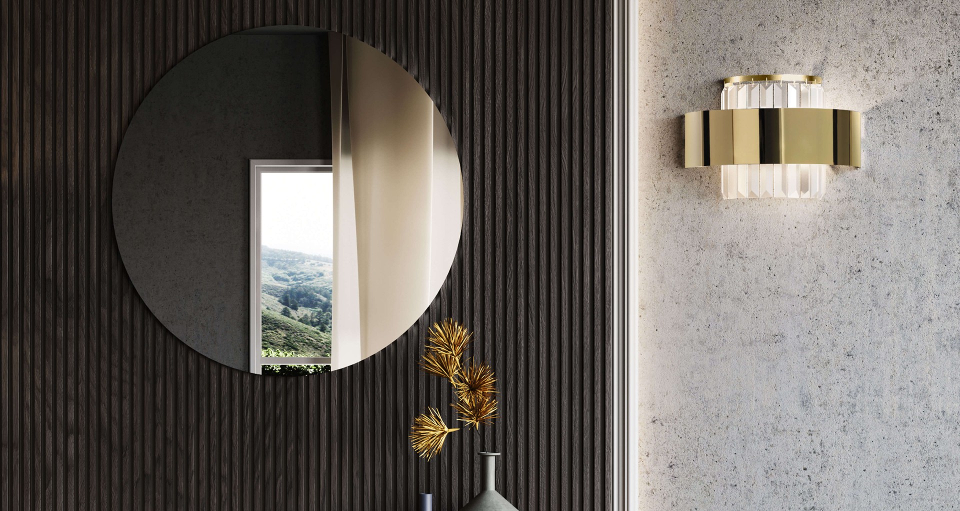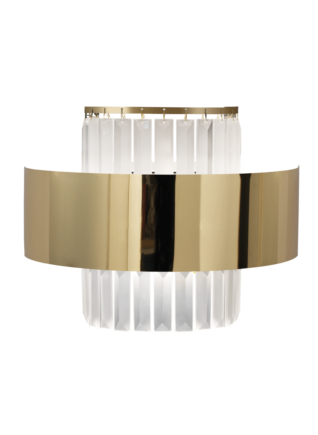 Настенный светильник с металлической структурой цвета сатинированного золота или хрома, абажур из металла цвета золота или хрома и подвески из травленого стекла.