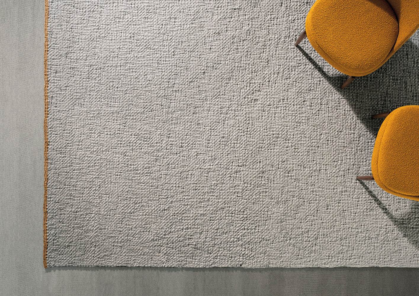 Ковер Cross полностью изготовлен вручную из 100% новозеландской шерсти. Поверхность имеет толщину 15 мм. По периметру используется подложка из жаккардовой ленты из регенерированного хлопка. Общий вес составляет 4 кг/м². Доступен в белом цвете с 2 см ручной плетеной каймой цвета горчицы на коротких сторонах.
