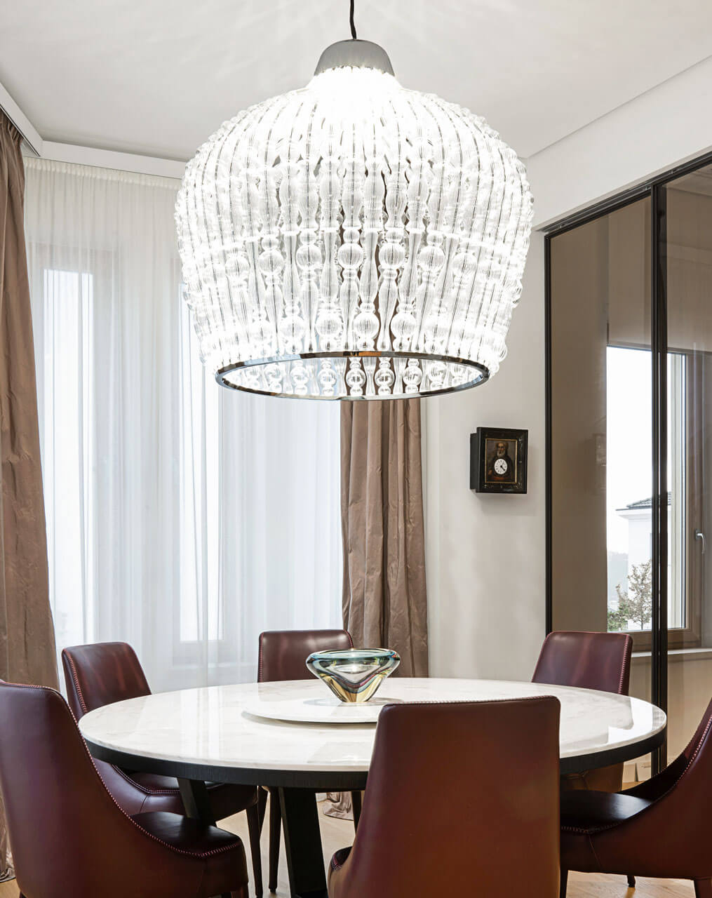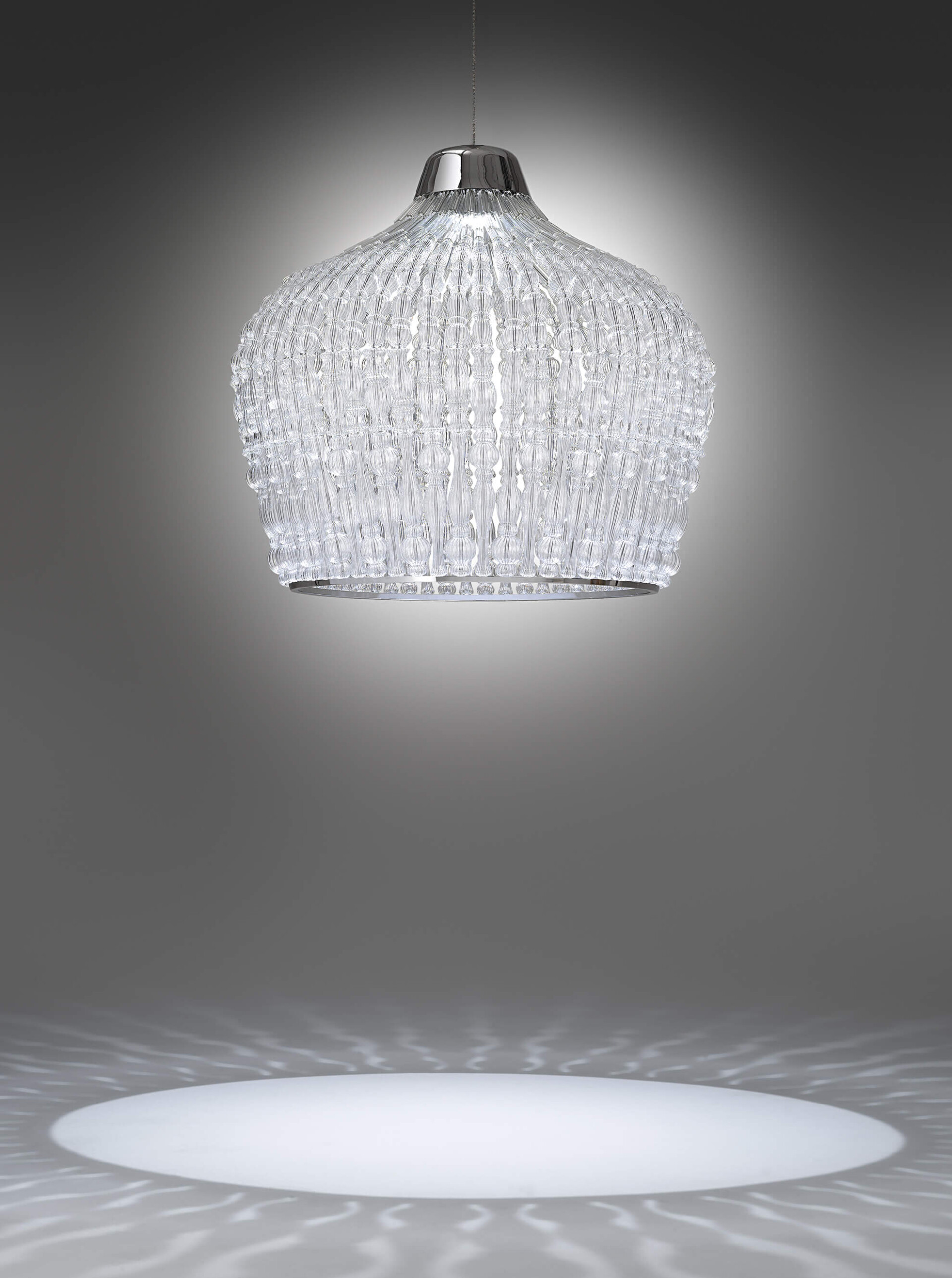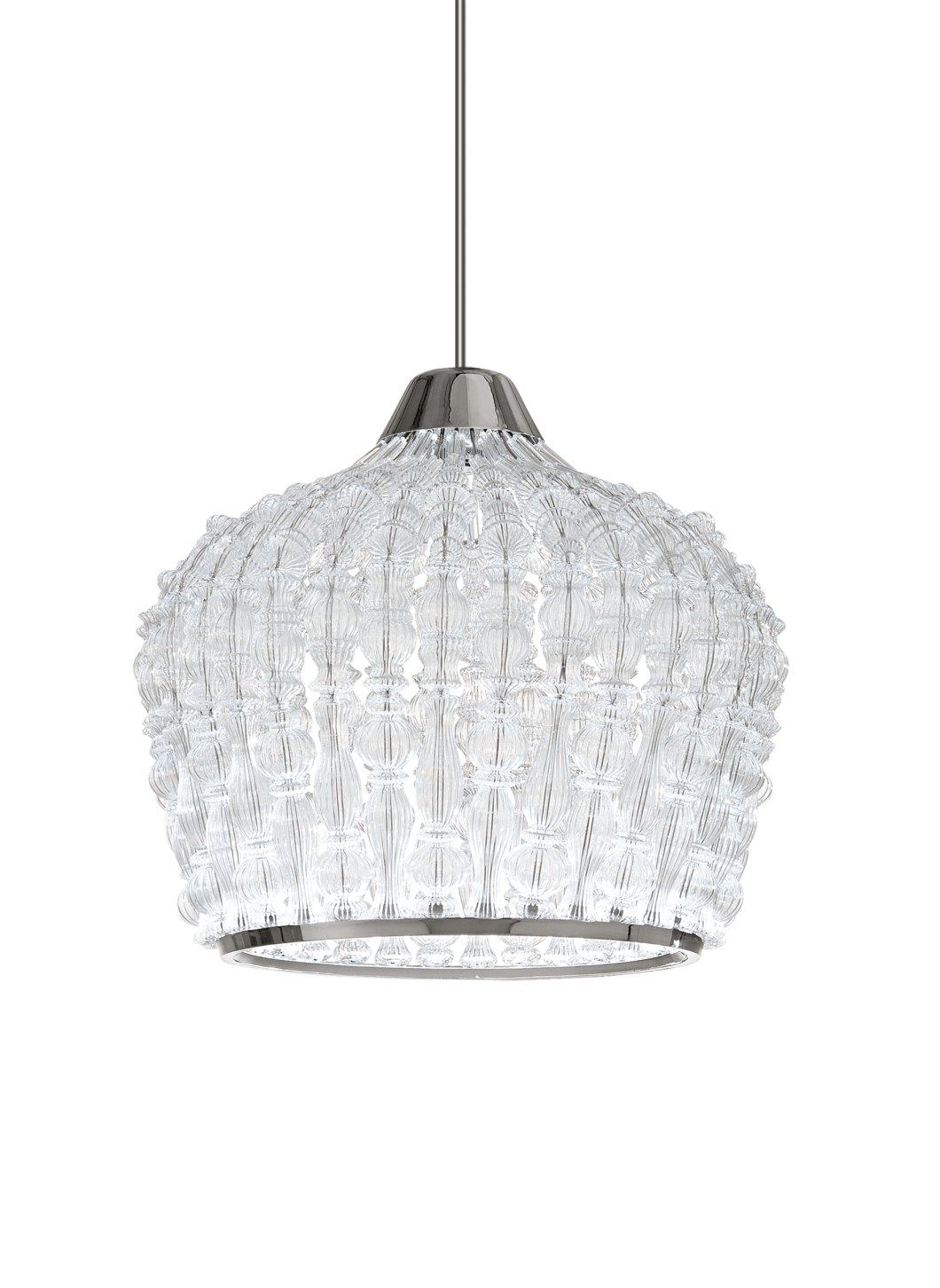Подвесной светильник с хромированной металлической конструкцией и элементами из прозрачного дутого стекла.